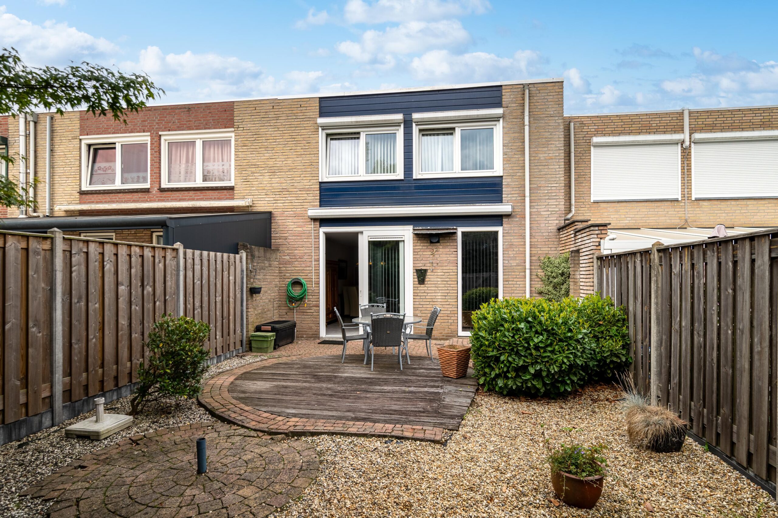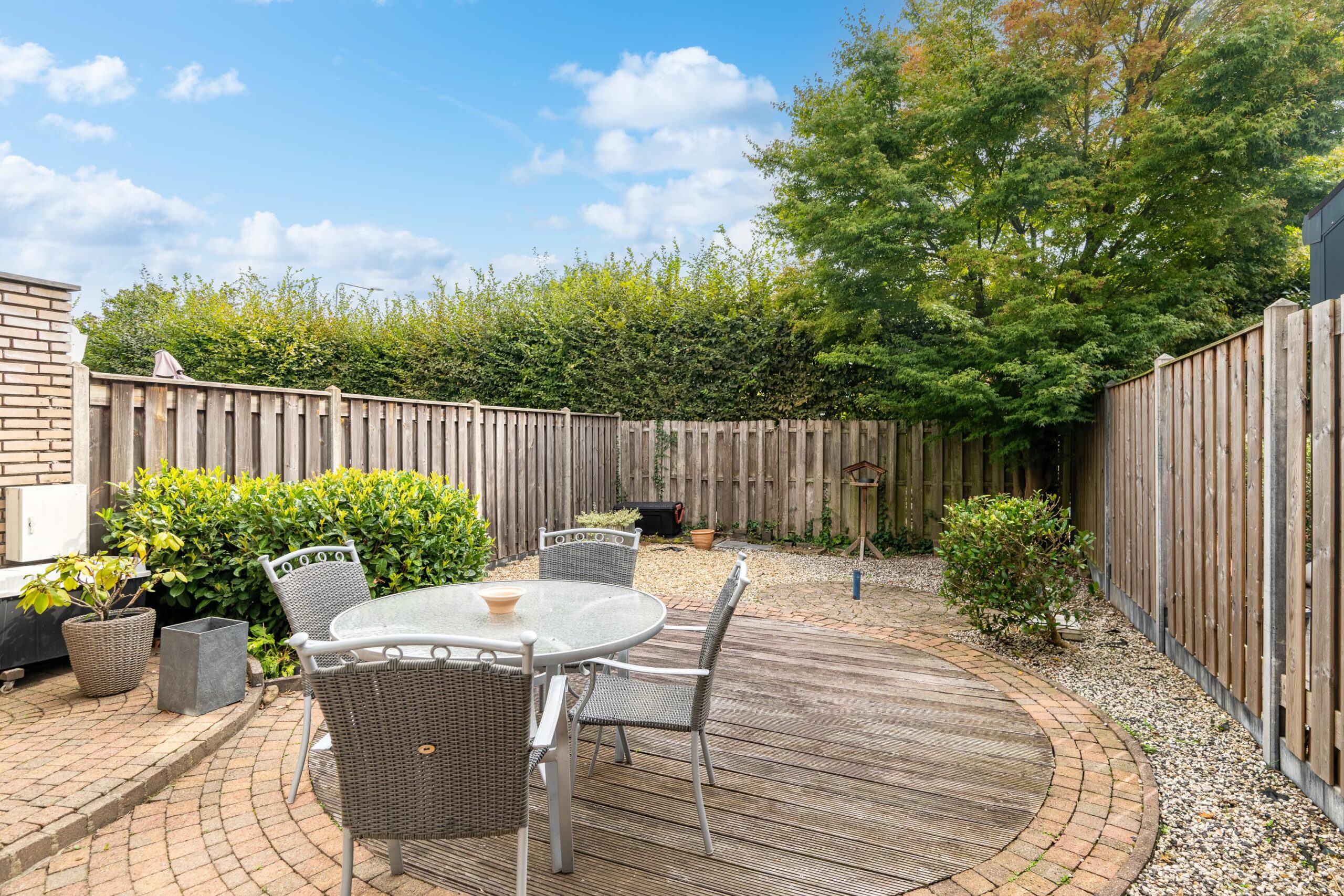 De geheel omsloten en onderhoudsvriendelijke achtertuin is zonnig gelegen en beschikt over een royaal terras, zonnescherm en veel privacy.