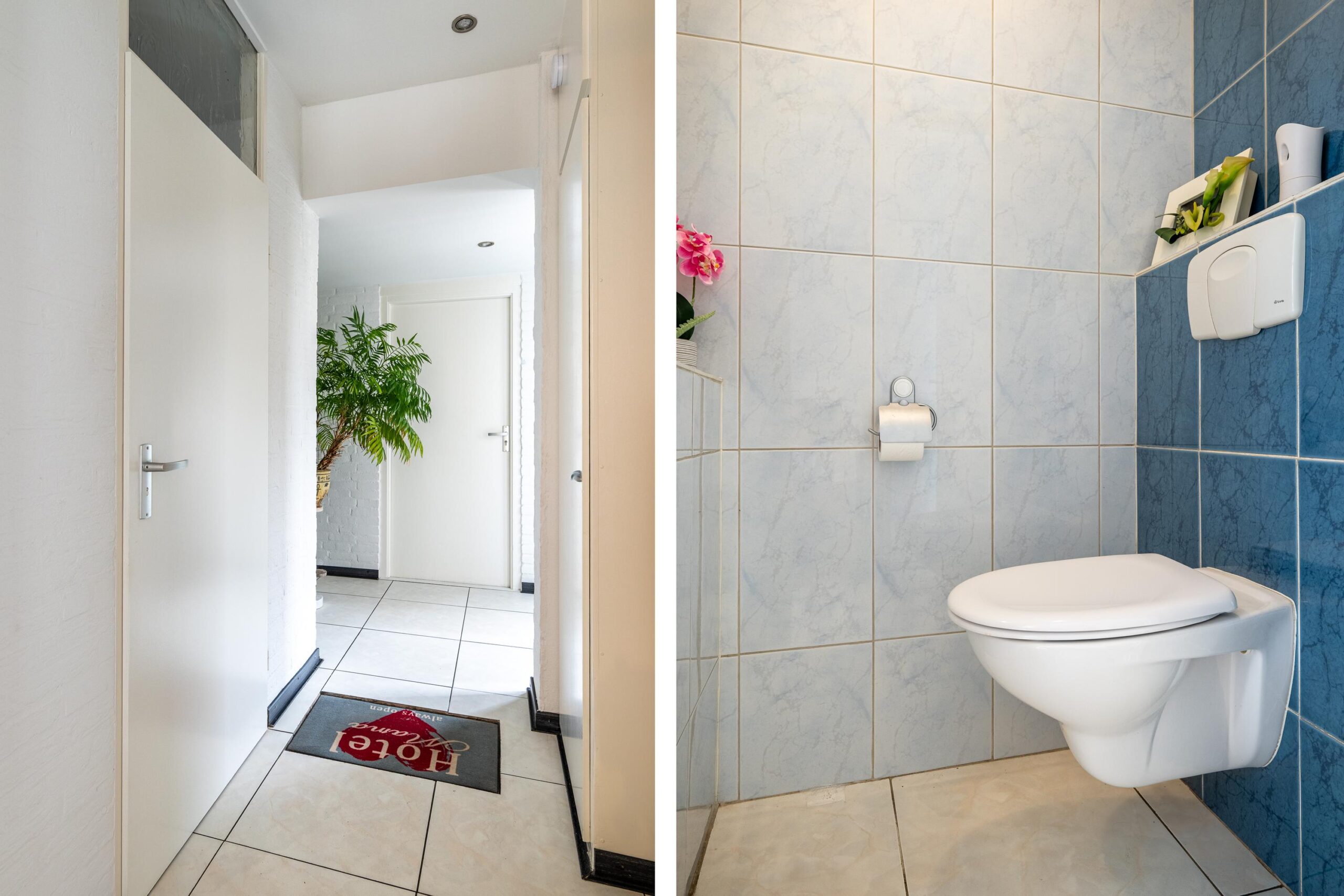 Via de onderhoudsvriendelijke voortuin bereikt u de entree. De ruime hal beschikt over een garderobe, ingebouwde verlichting en een modern, geheel betegeld toilet met vrijhangend closet.