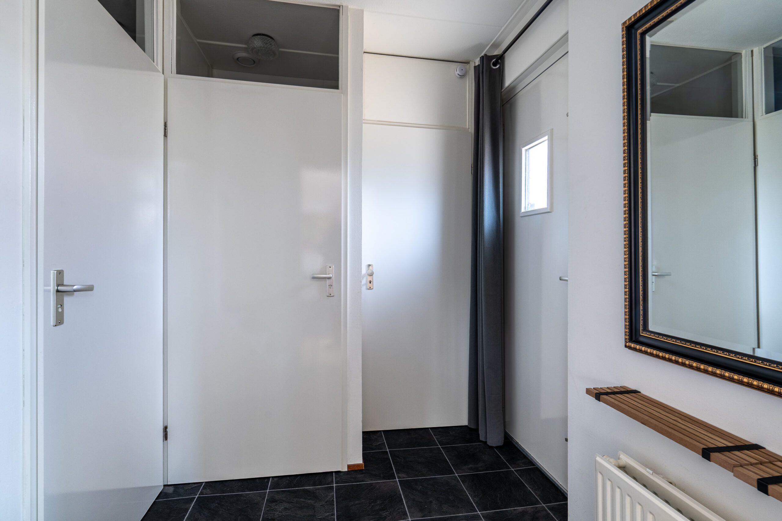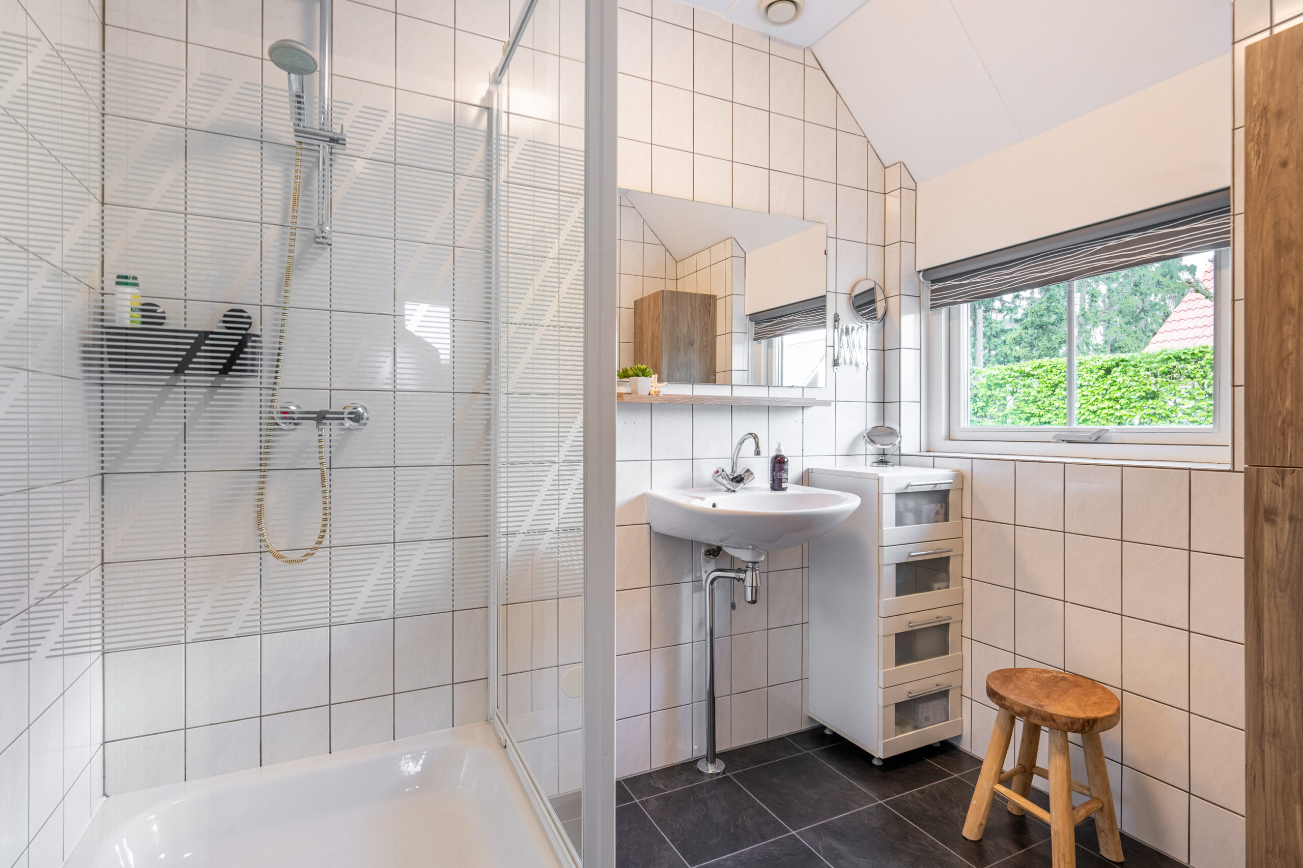 De badkamer, bereikbaar via de hal, is netjes afgewerkt en voorzien van een douche en wastafel. Compact, maar comfortabel.