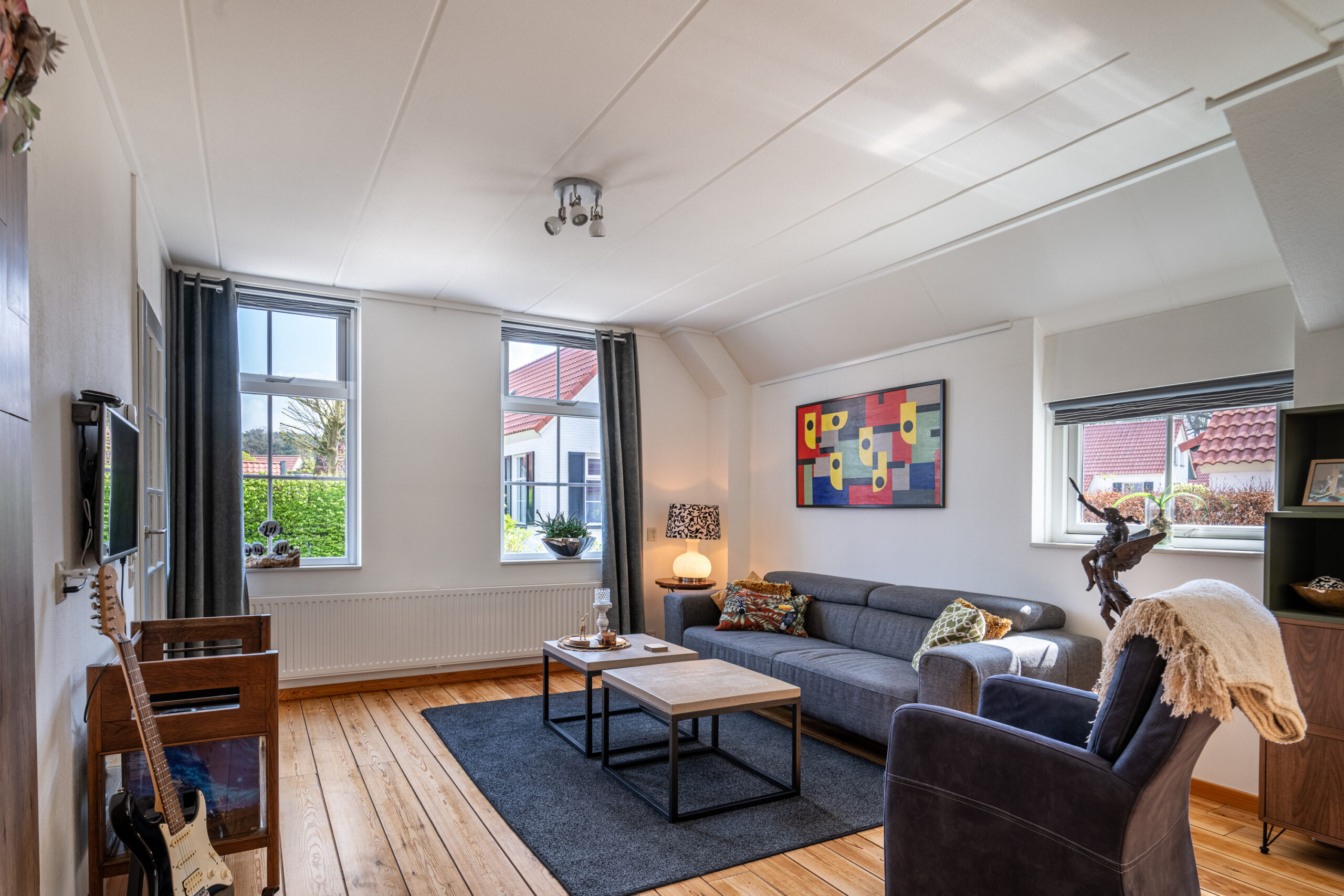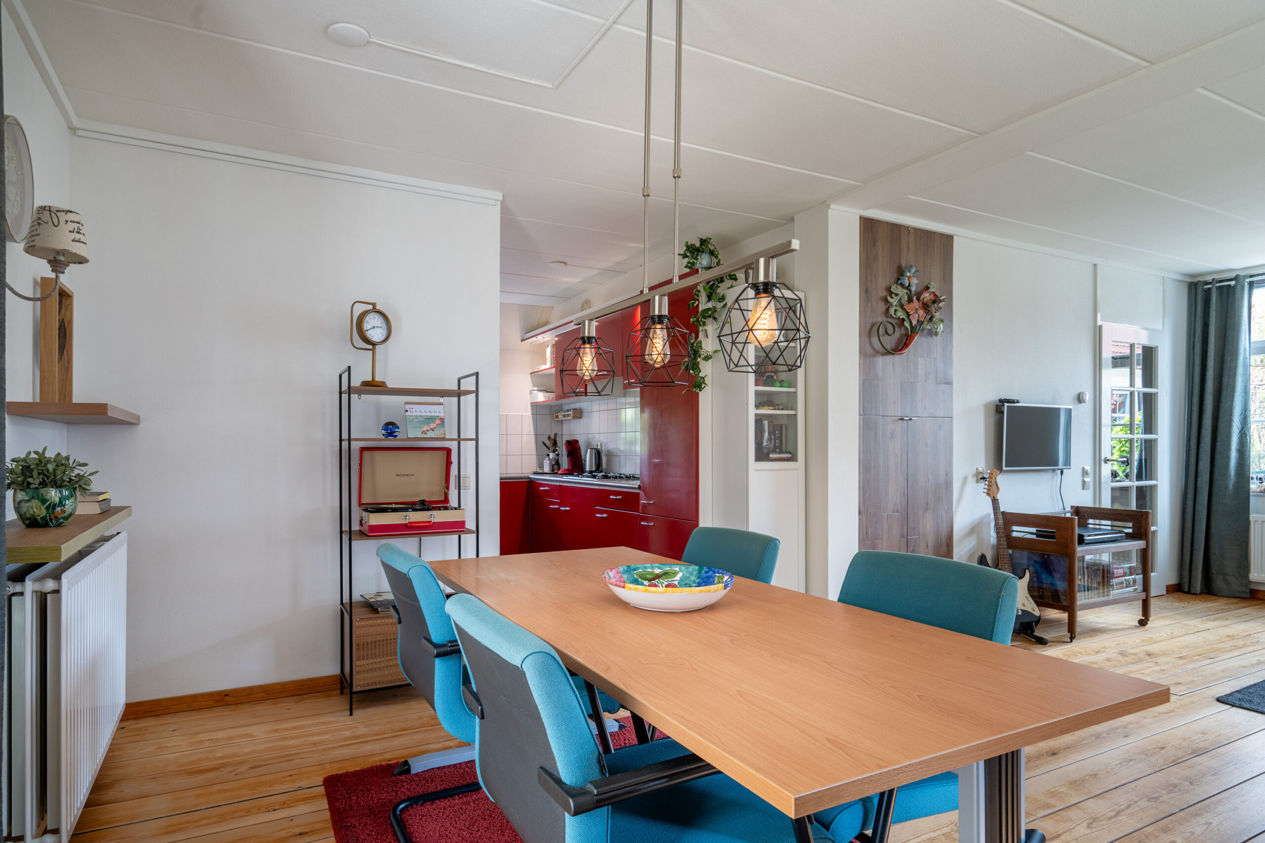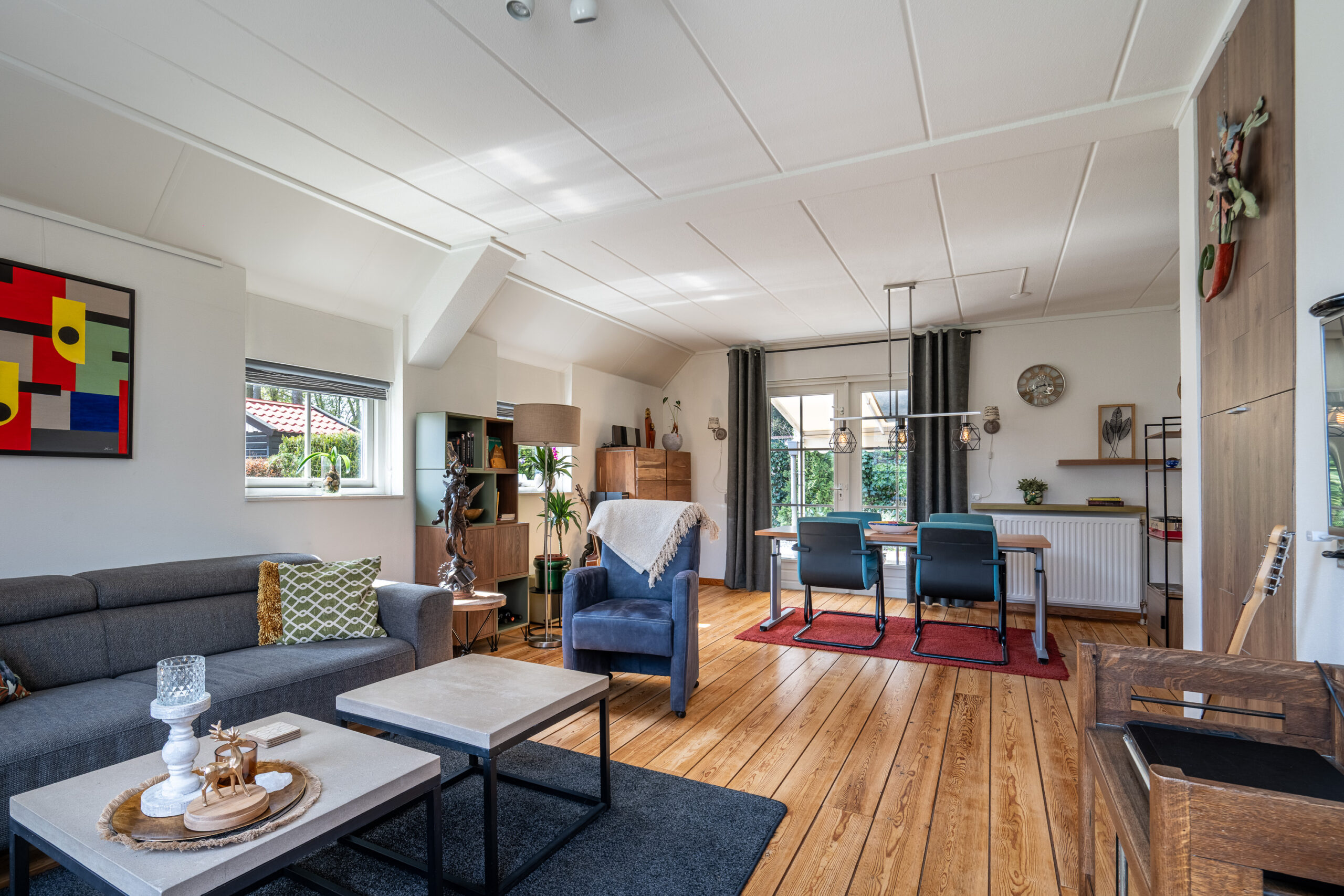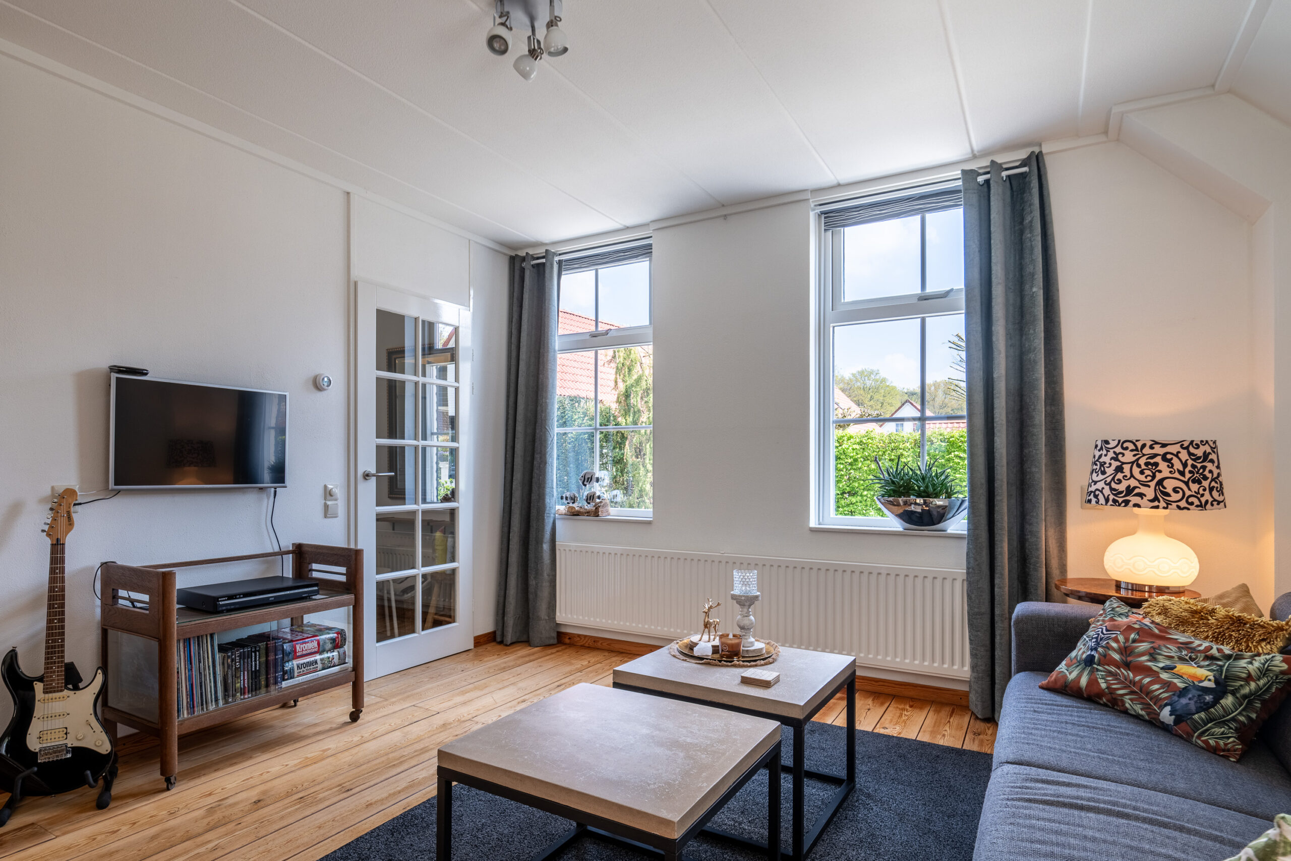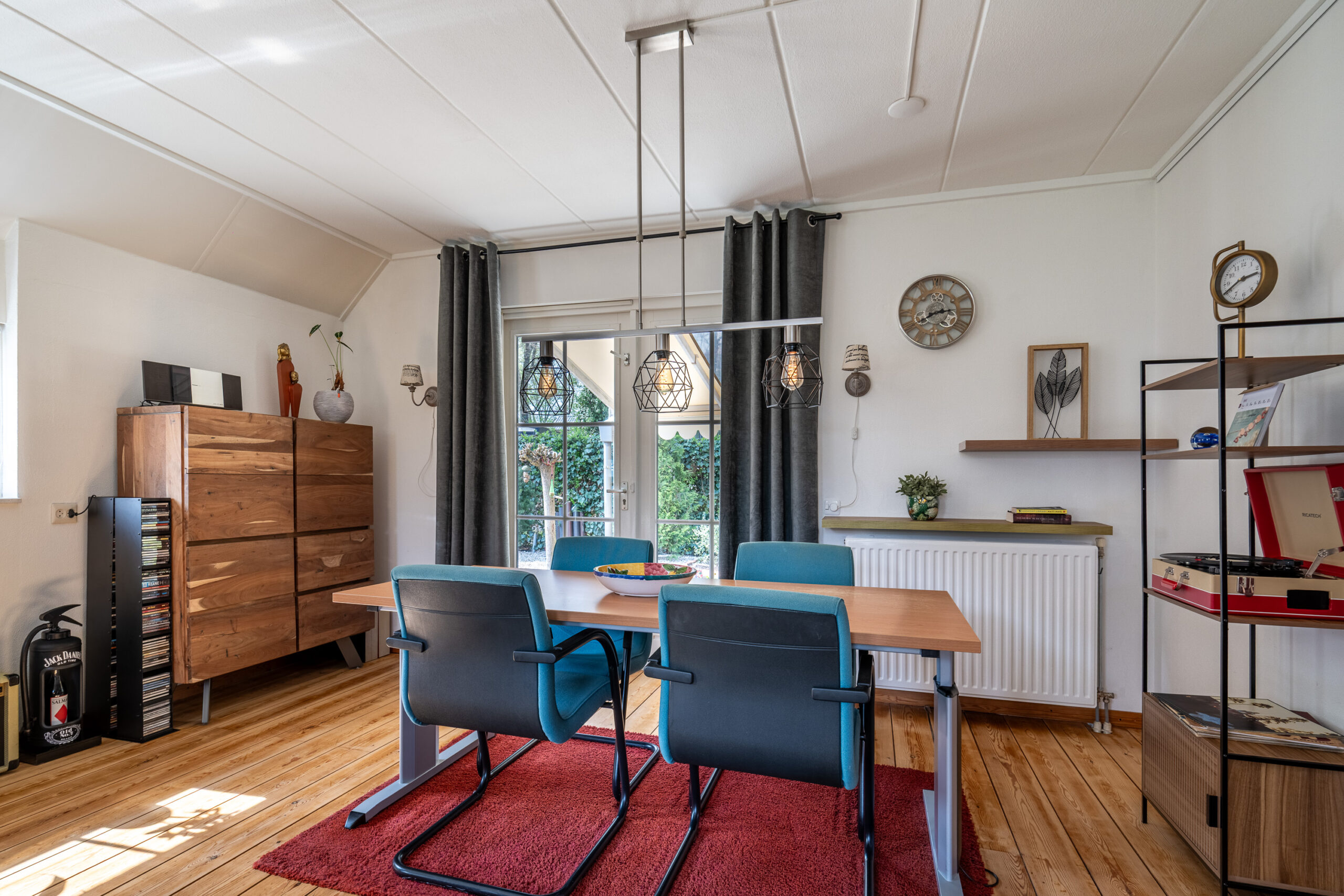 We lopen door naar de woonkamer. Deze ruimte is licht en sfeervol, met grote openslaande deuren die je direct verbinden met de tuin. Hier geniet je van lange avonden, een goed boek of gewoon van het uitzicht op het groen. Op de vloer vinden we een mooie houten vloer (Rood Noorse Den) en de wanden zijn afgewerkt in neutrale tinten. Een blanco canvas waar jij met gemak jouw eigen stempel op drukt.