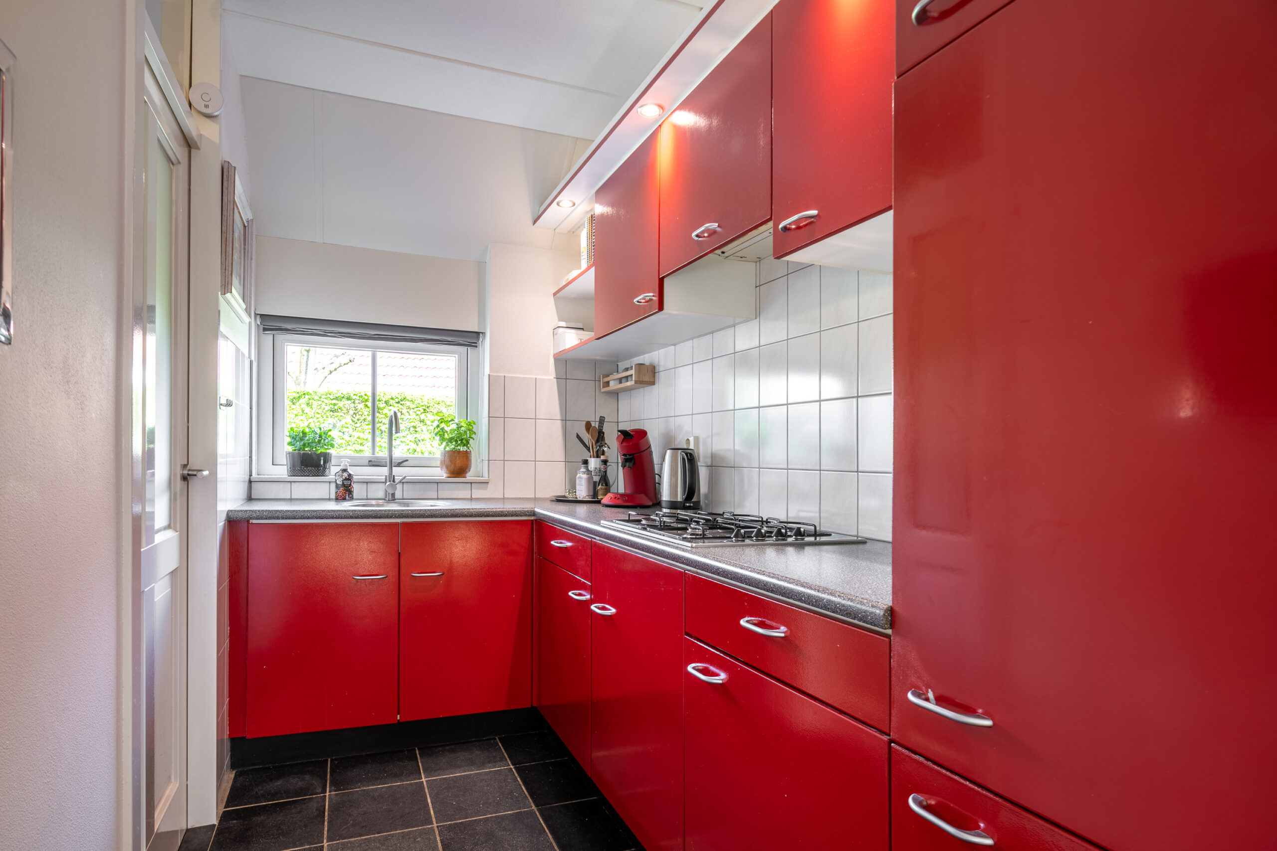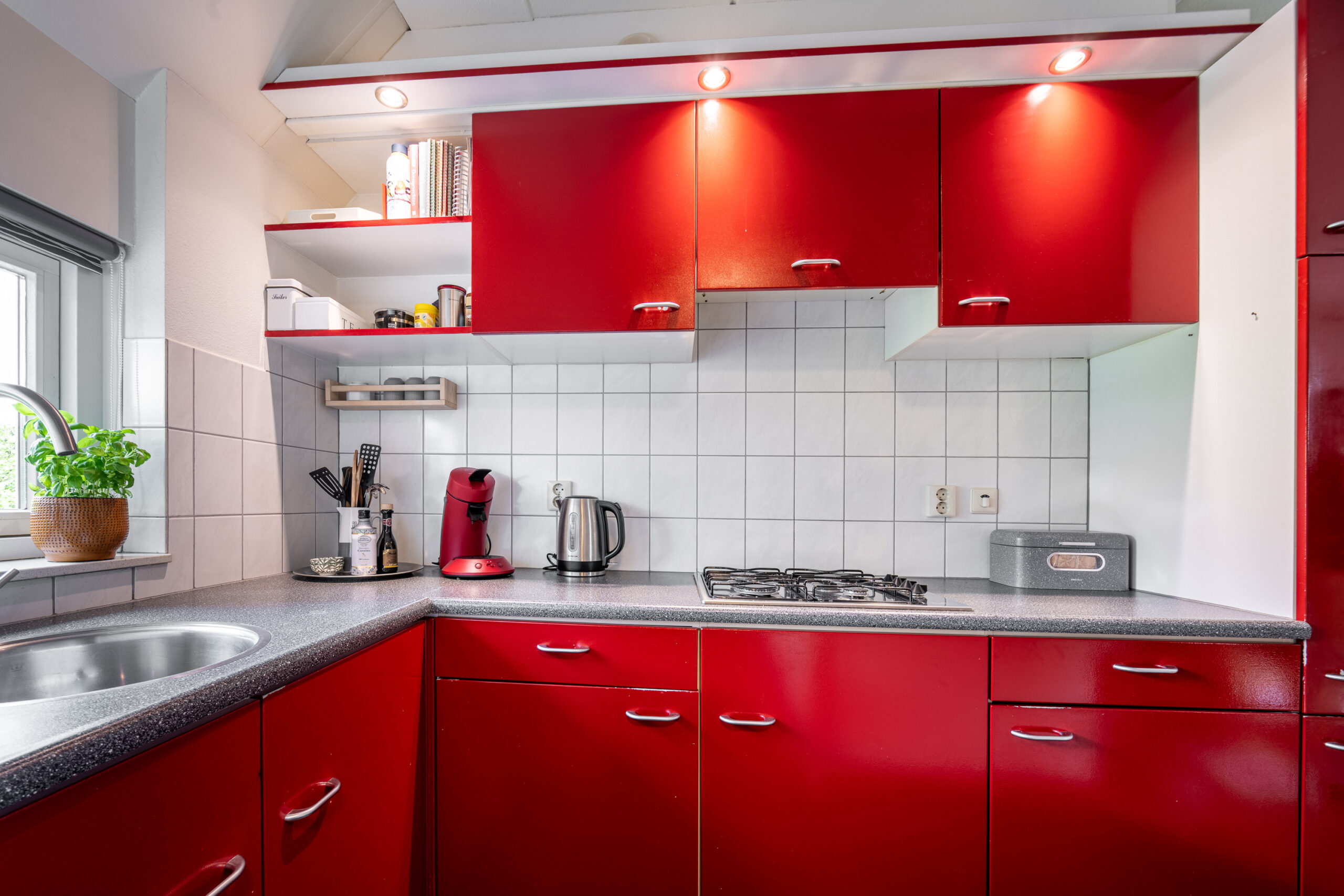 Dankzij de open verbinding tussen de keuken en zowel het eet- als het leefgedeelte is er genoeg ruimte om gezellig met het hele gezin samen te zijn. Kookliefhebbers kunnen zich helemaal uitleven in deze keuken. Vrienden en familie kunnen gezellig aanschuiven aan de eettafel terwijl je staat te koken. De keuken is praktisch ingericht in een hoekopstelling en voorzien van diverse inbouwapparatuur, zoals: een koelkast, vriezer, gaskookplaat en afzuigkap.
