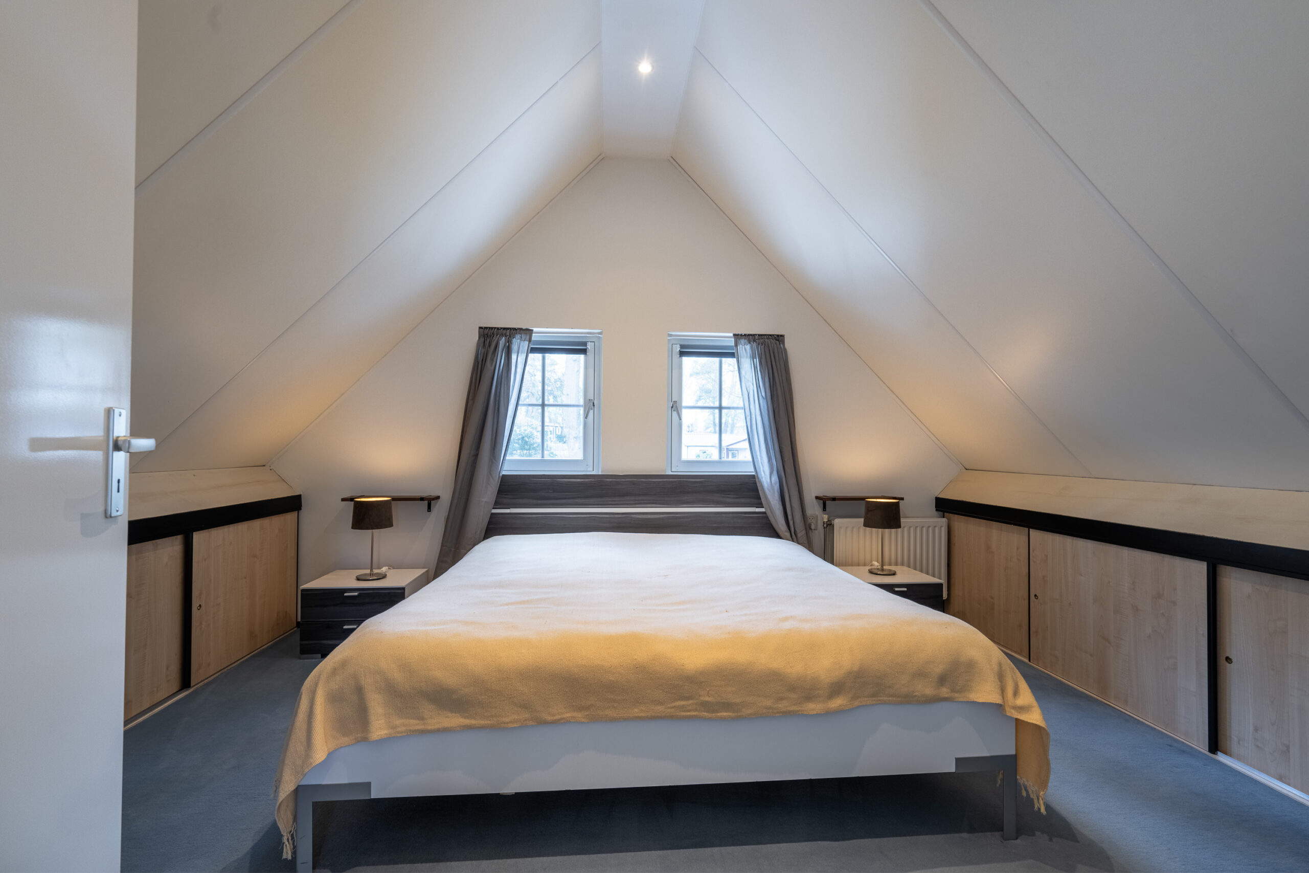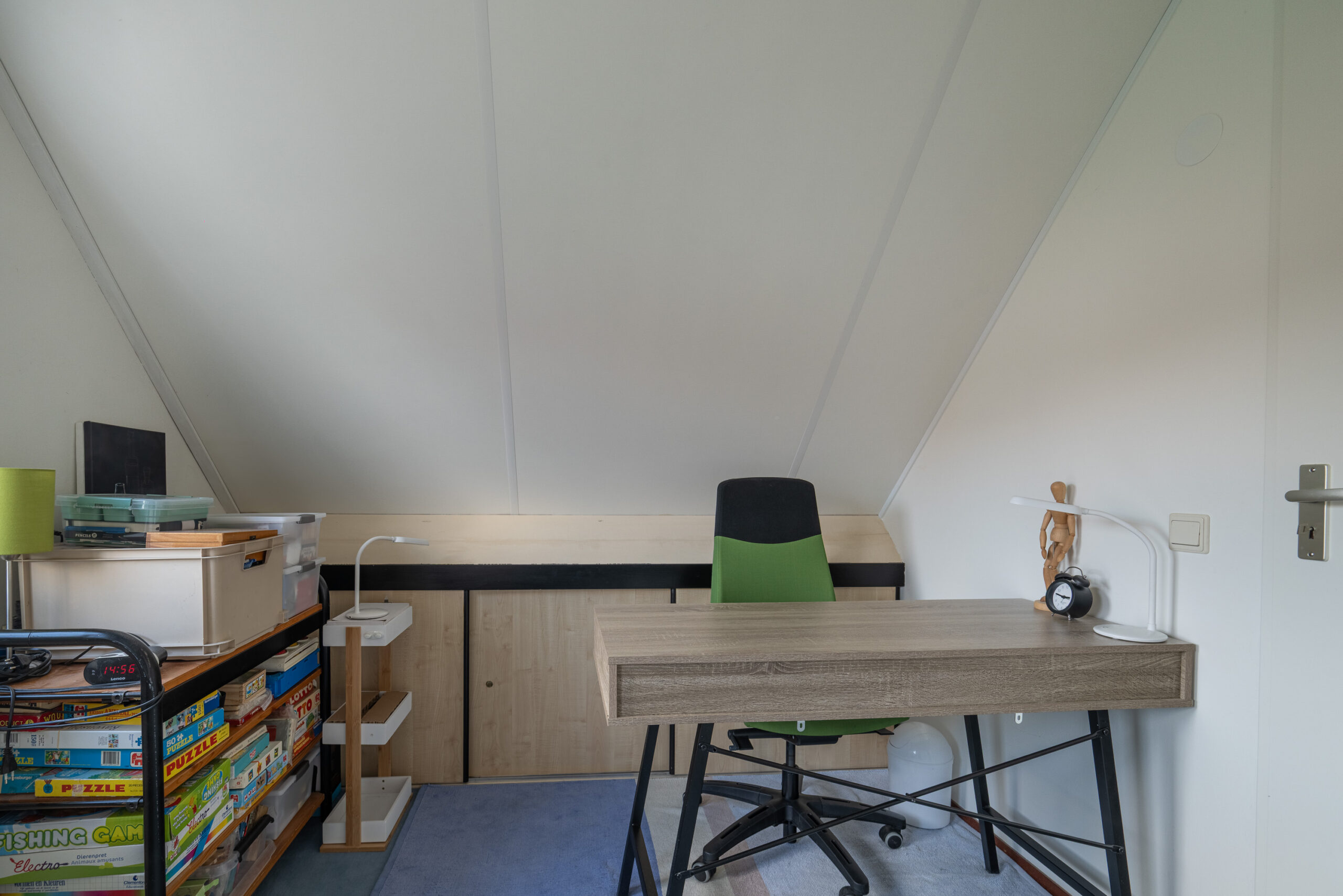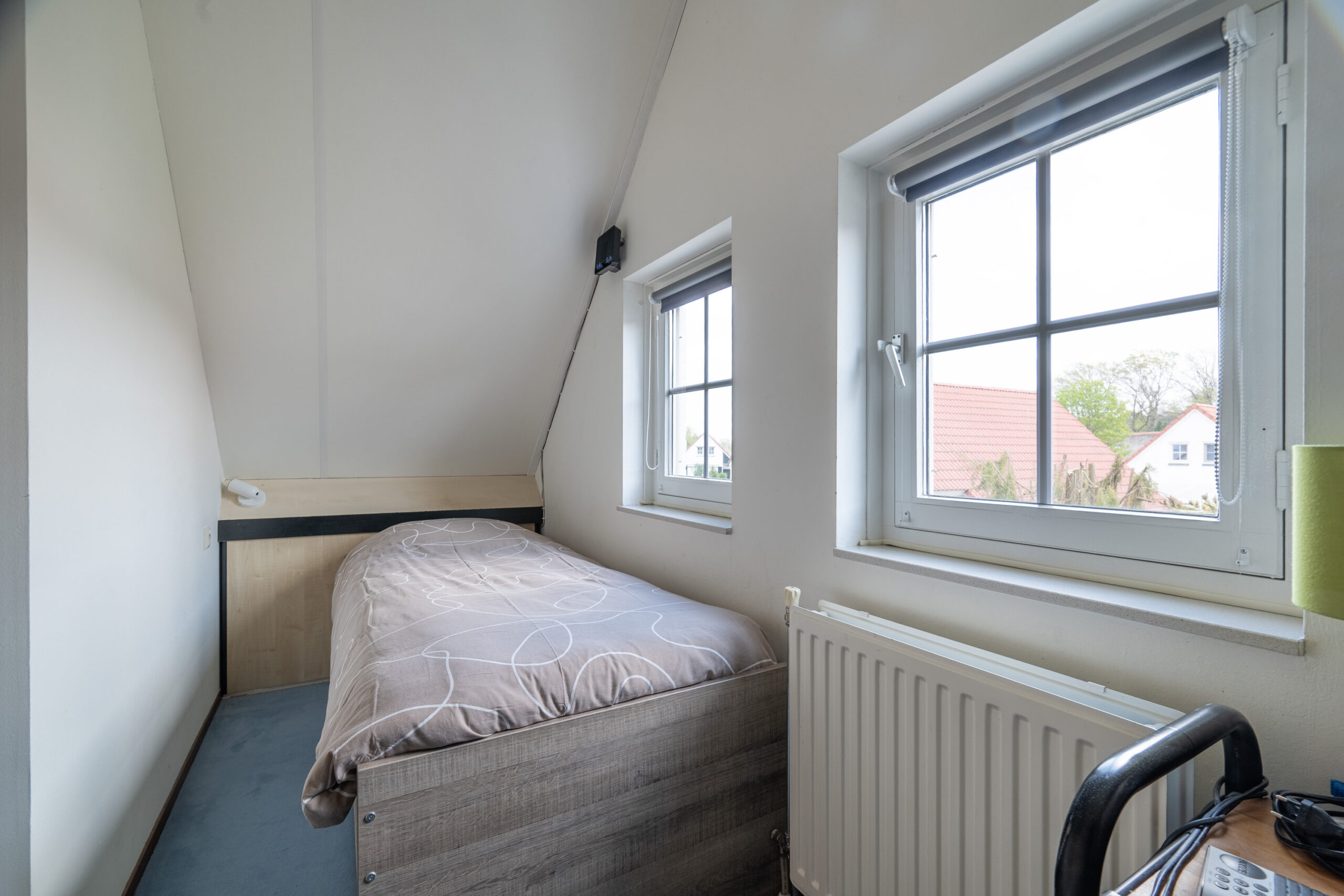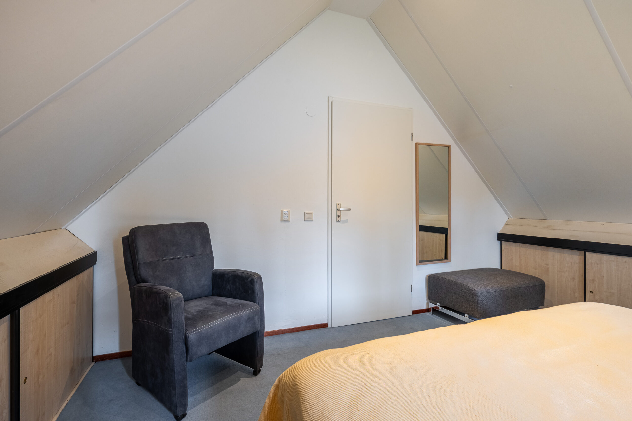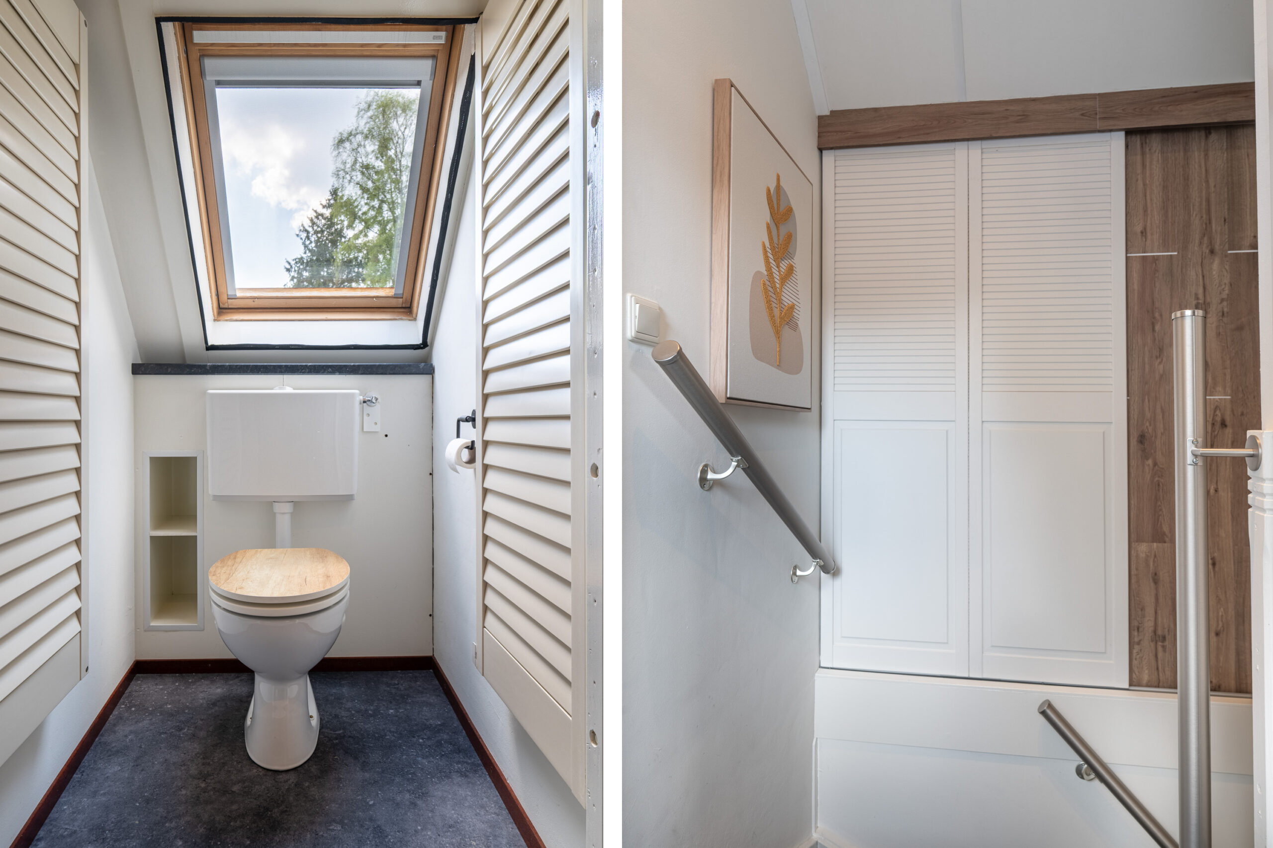Via de trap in de hal, bereiken we de eerste verdieping. Hier kom je uit op een lichte overloop met dakraam en een extra toiletruimte. Vanaf de overloop bereiken we twee fijne (slaap)kamers, elk met voldoende ruimte en praktische opbergmogelijkheden achter de knieschotten. Daarnaast is er nog een handige, verborgen berging, bereikbaar achter de trap, ideaal voor spullen die je uit het zicht wilt houden.
