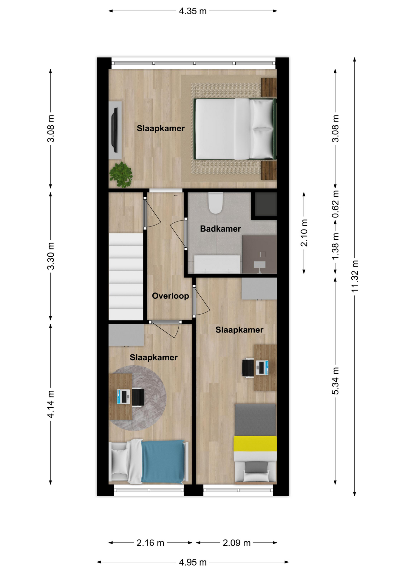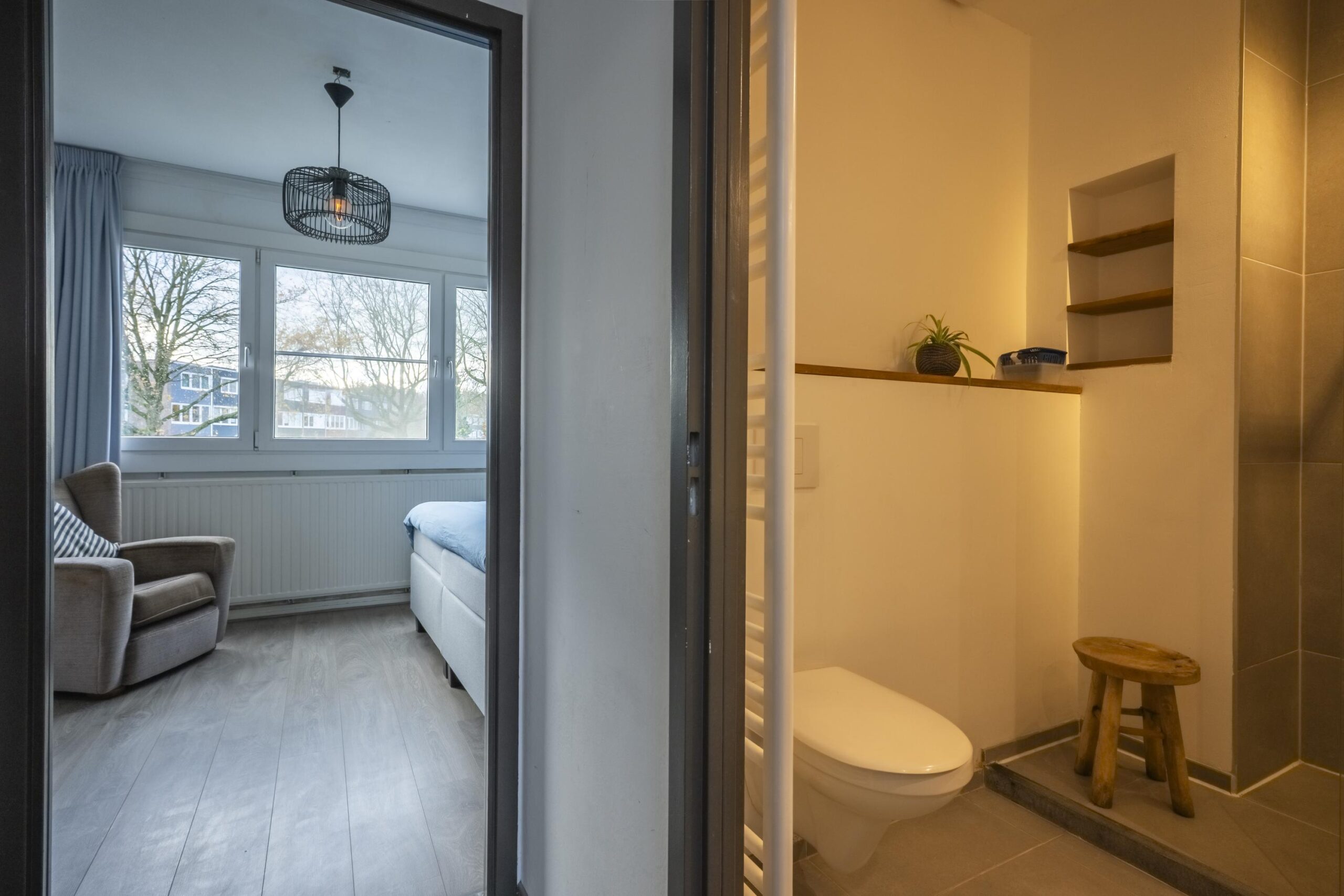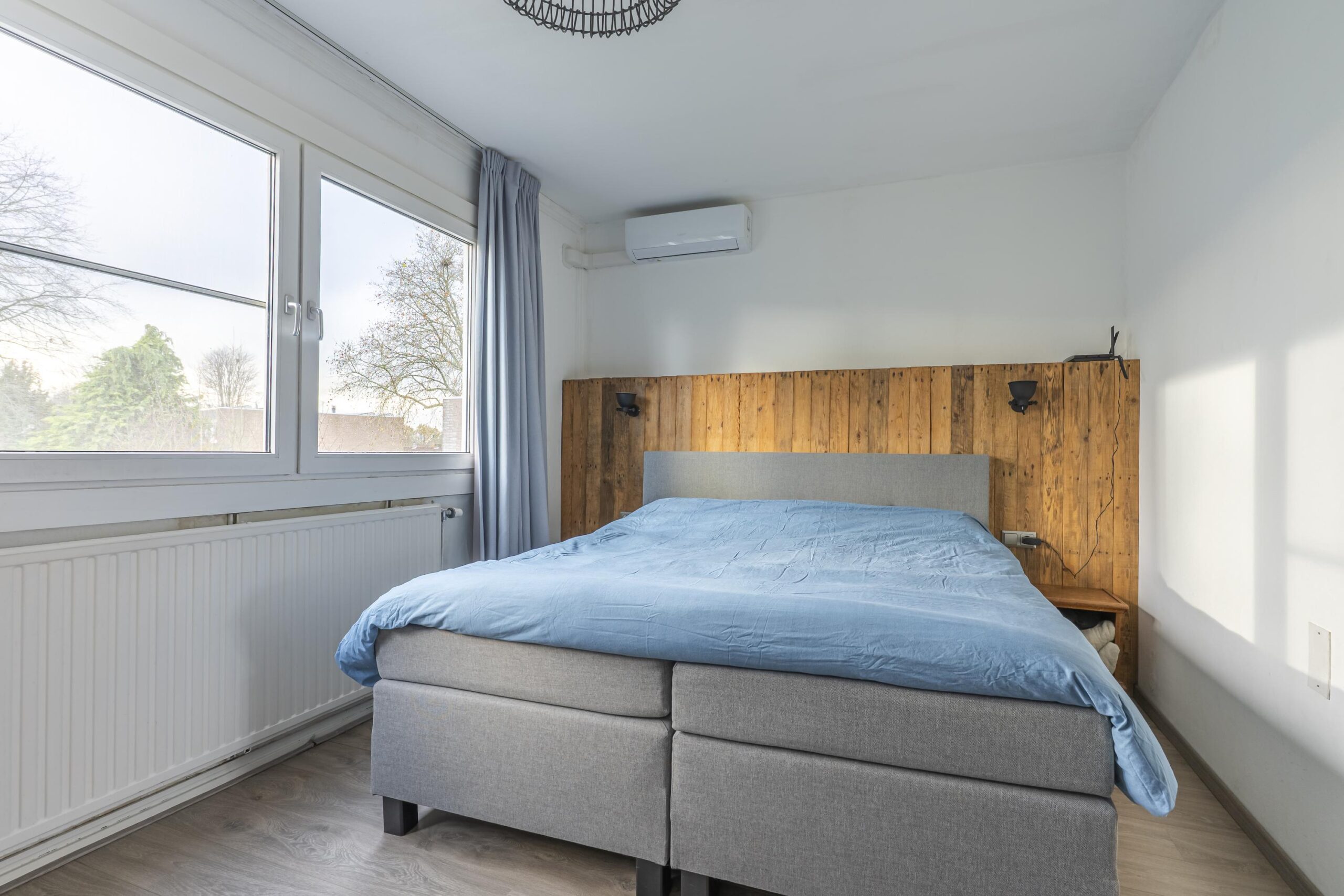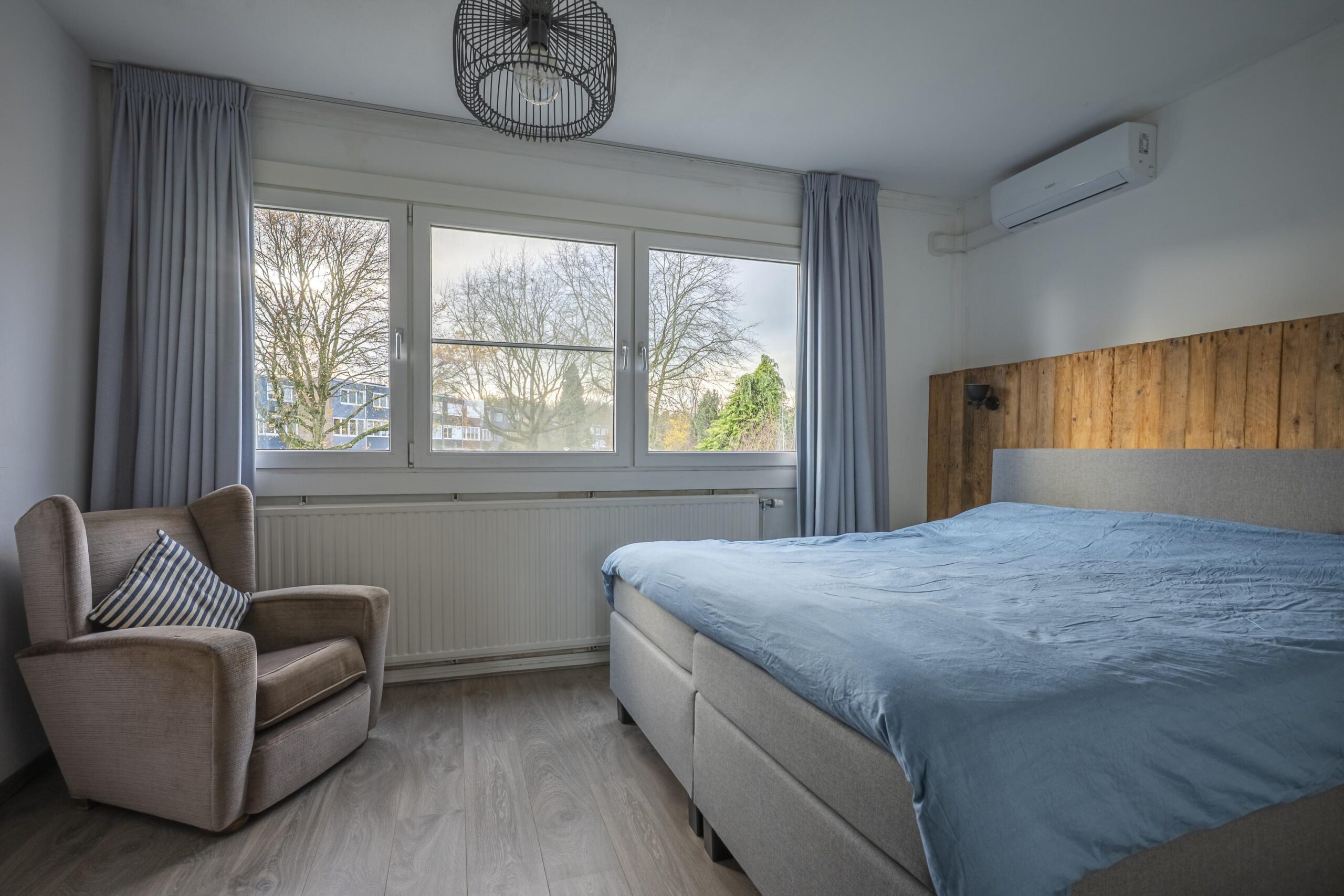 Via de overloop met lichtkoepel toegang tot drie slaapkamers voorzien van laminaatvloeren. De slaapkamer aan de achterkant is tevens voorzien van airconditioning. Moderne badkamer van ca. 5m² voorzien van inloopdouche, toilet en dubbele wastafel met ombouwmeubel.