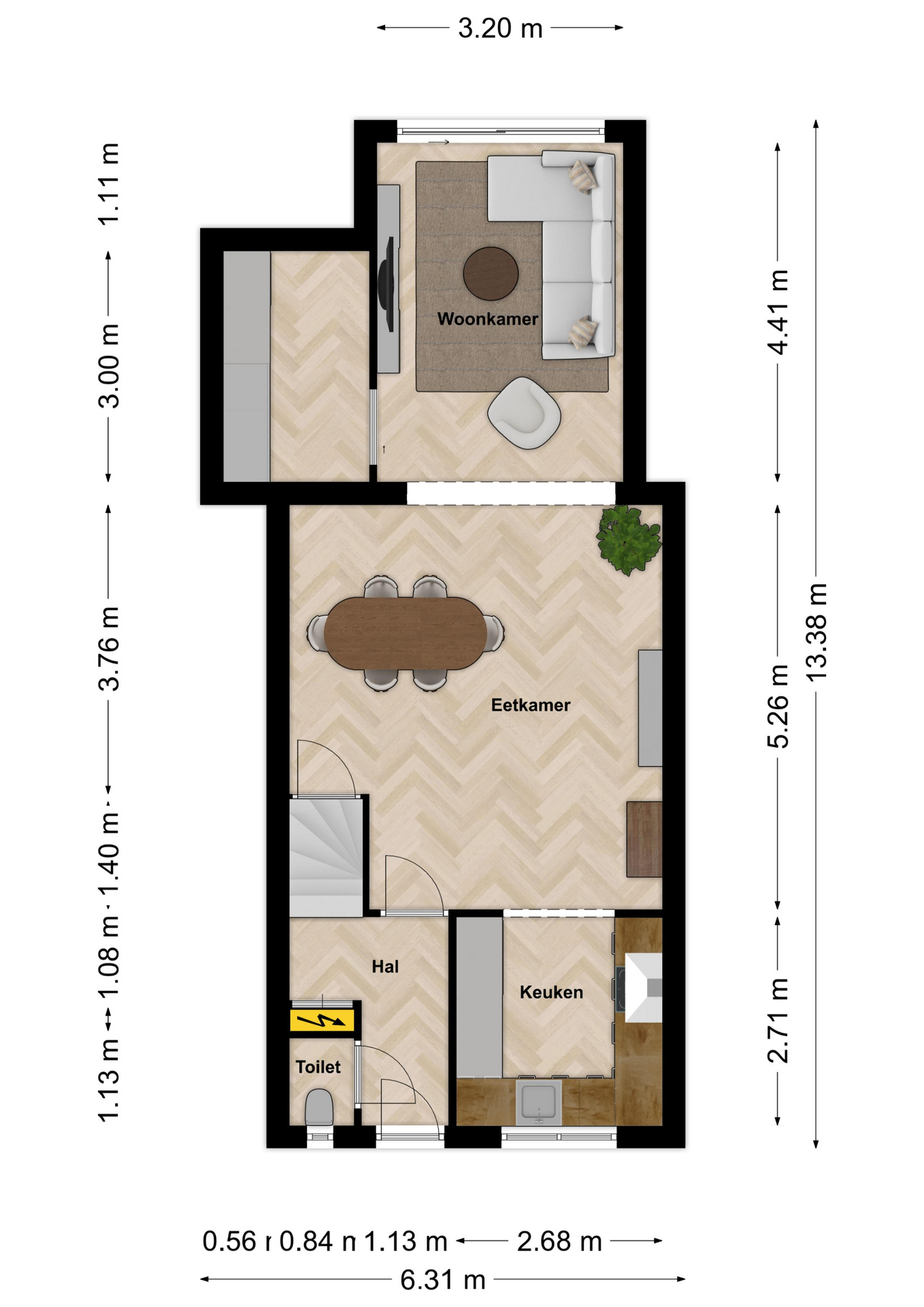 Ontvangsthal met trapopgang naar de eerste verdieping, vernieuwde meterkast en toiletruimte met zwevend toilet.