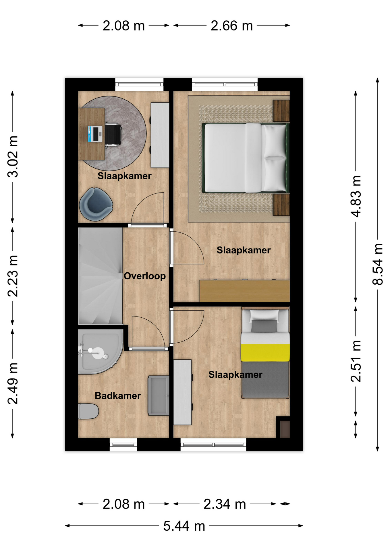 Overloop met toegang naar drie slaapkamers respectievelijk 13m2, 8m2 en 6m2 groot. De slaapkamers zijn afgewerkt met een laminaatvloer en rolluiken. De badkamer is geheel betegeld en uitgerust met een douchecabine, wastafel met meubel en spiegelkast en zwevend toilet.