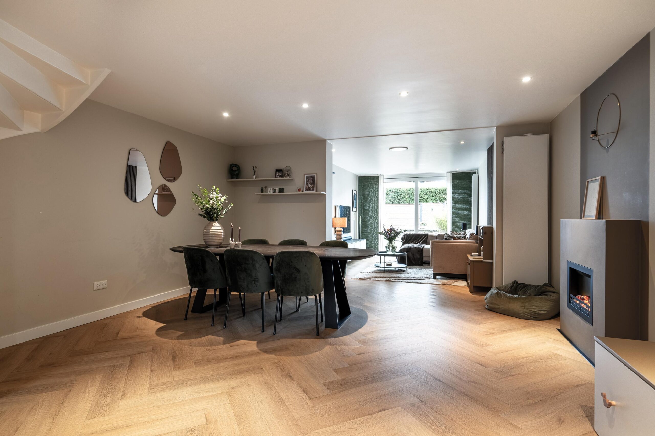 De royale woonkamer is voorzien van een stijlvolle pvc visgraatvloer en staat in open verbinding met de keuken en aanbouw, wat zorgt voor extra leefruimte. De begane grondvloer heeft een totaal oppervlak van 55m2.