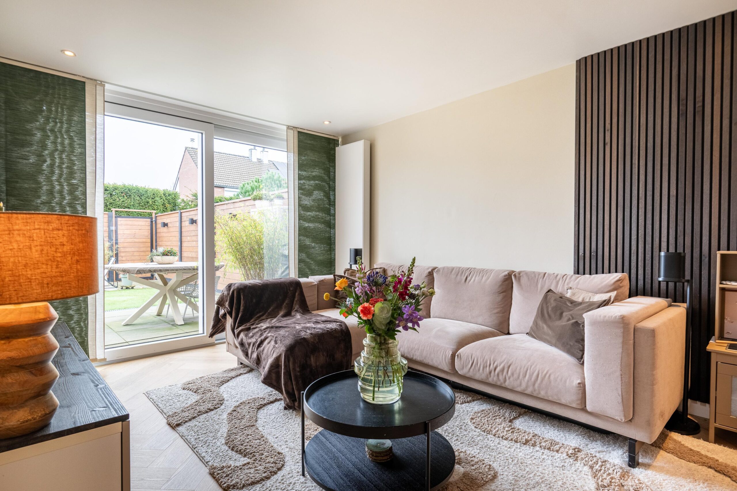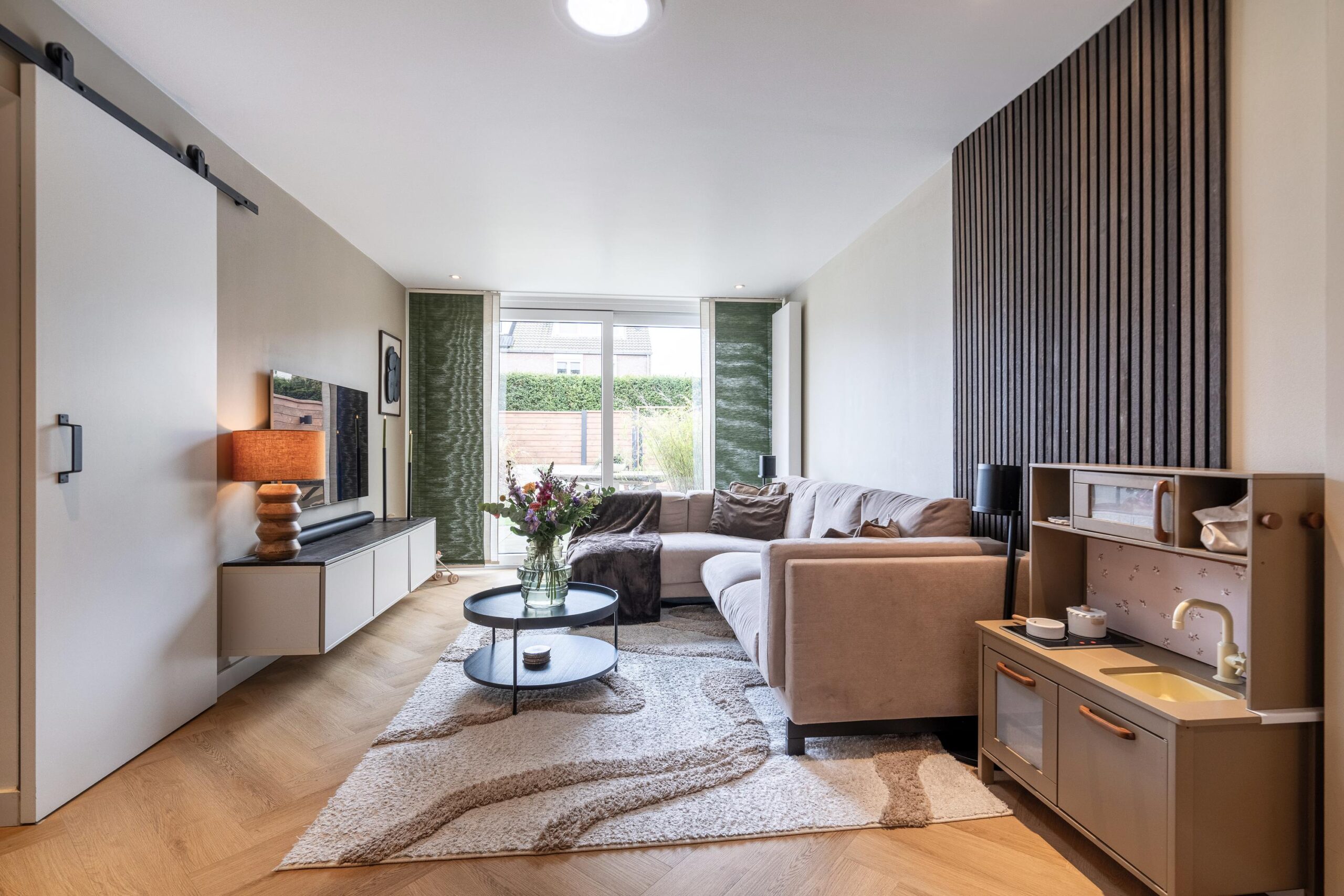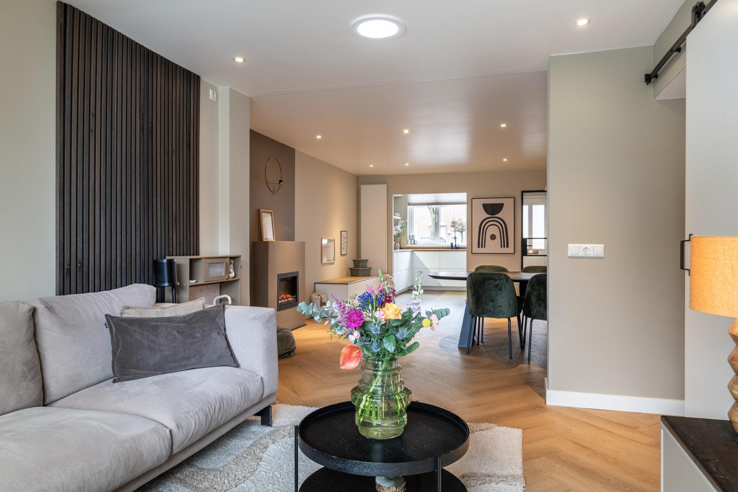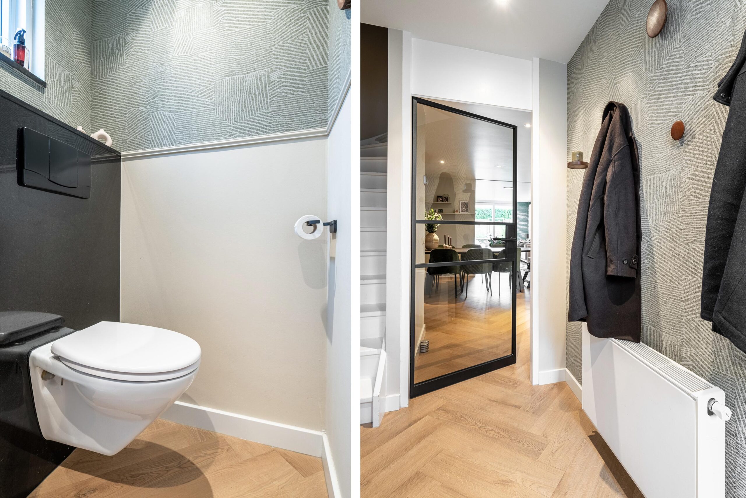 De hal geeft toegang tot de woonkamer via een fraaie zwart stalen deur, die zorgt voor een luxe sfeer.
