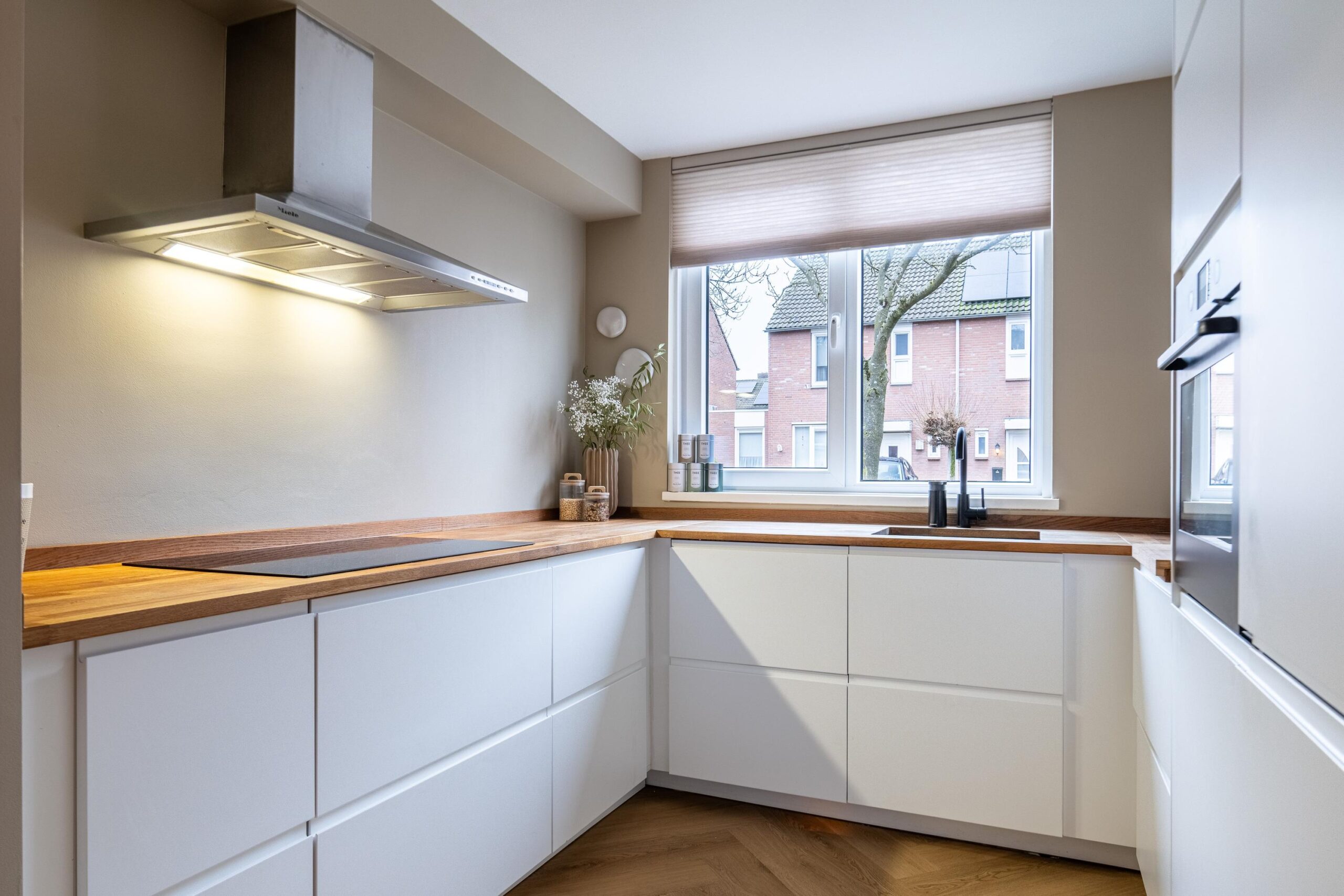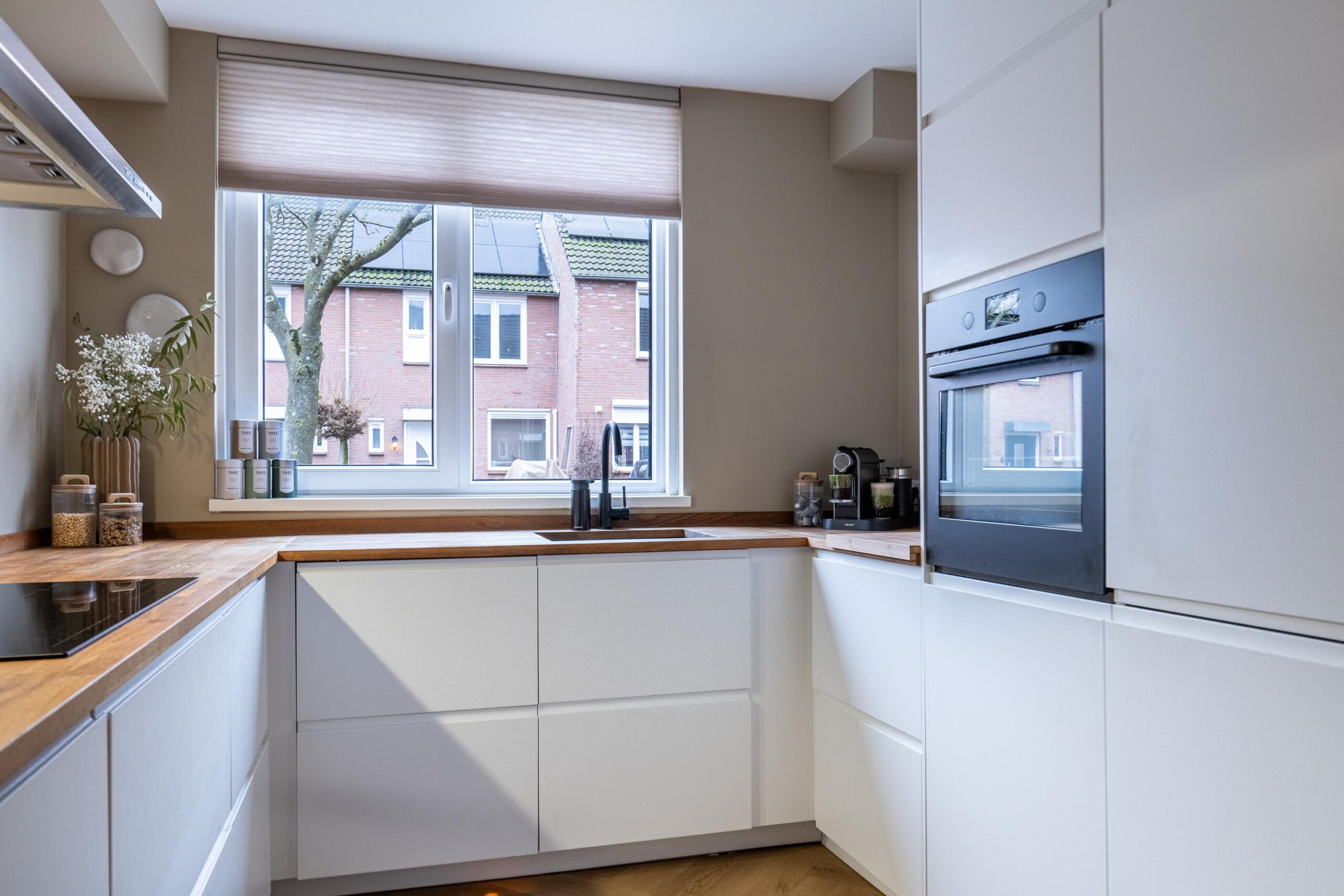 De keuken is uitgevoerd in een praktische U-opstelling en biedt volop werk- en bergruimte. Het werkblad is van hout en de keuken is voorzien van de navolgende apparatuur: inductiekookplaat, afzuigkap, vaatwasser, koelkast met vriesvak en oven. Daarnaast beschikt de woning over een aparte ruimte met een extra kastenwand, ideaal als bijkeuken waar plek is voor een magnetron of andere spullen. Deze ruimte is tevens voorzien van airconditioning.