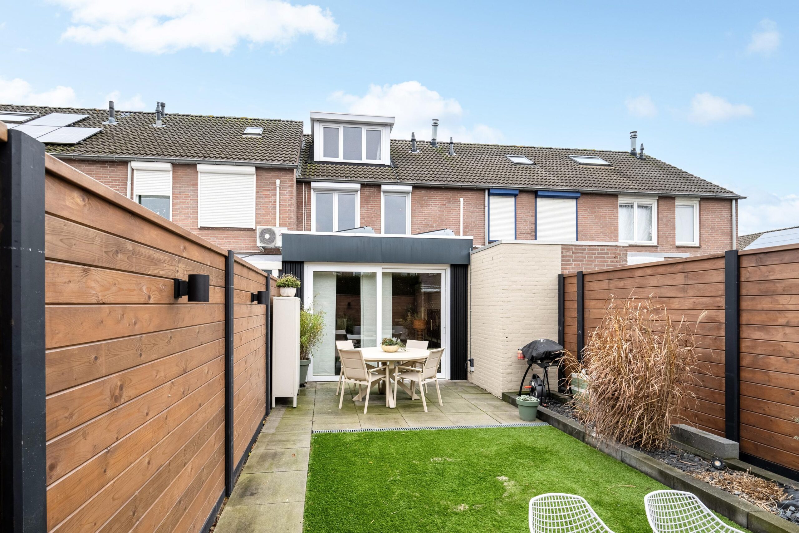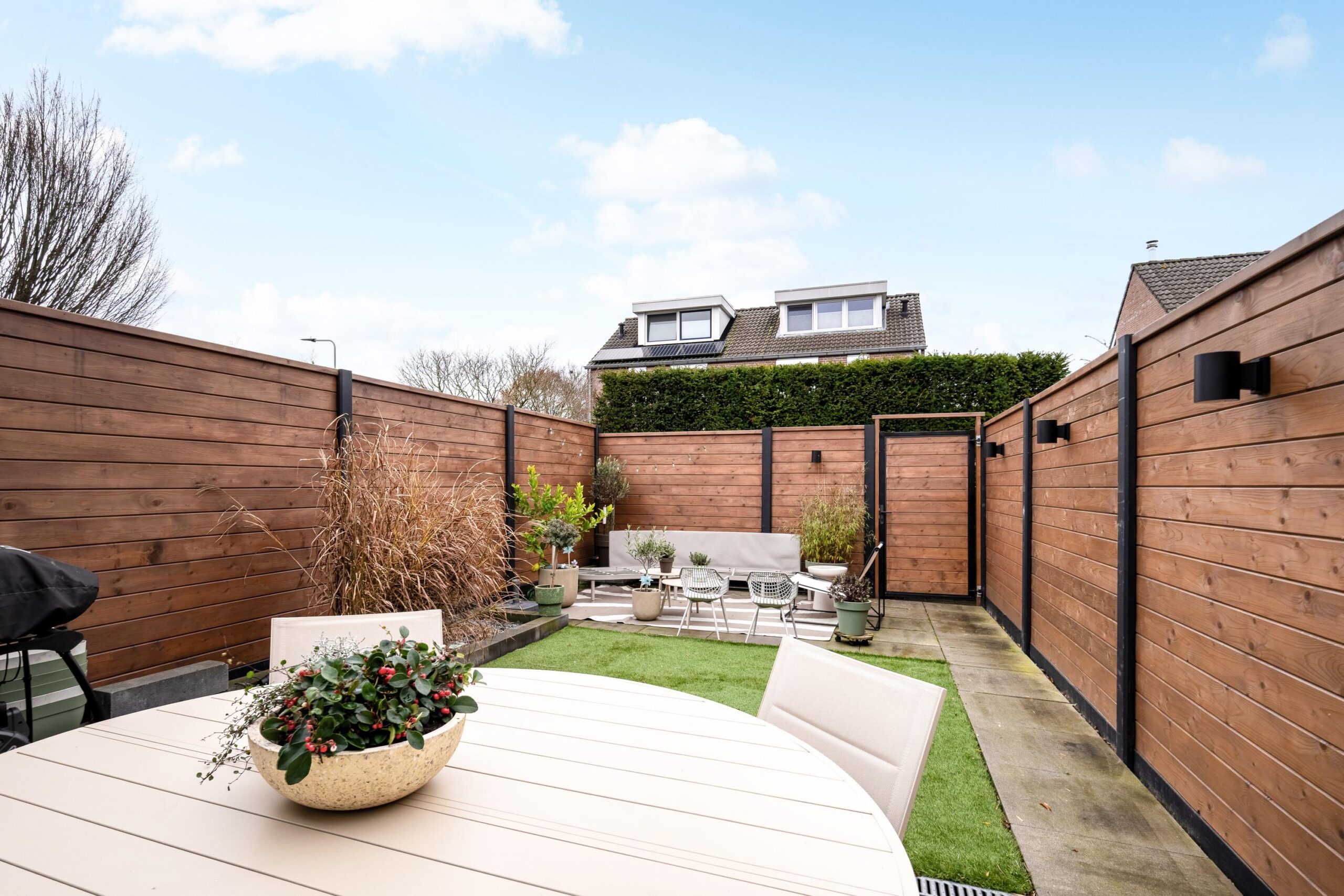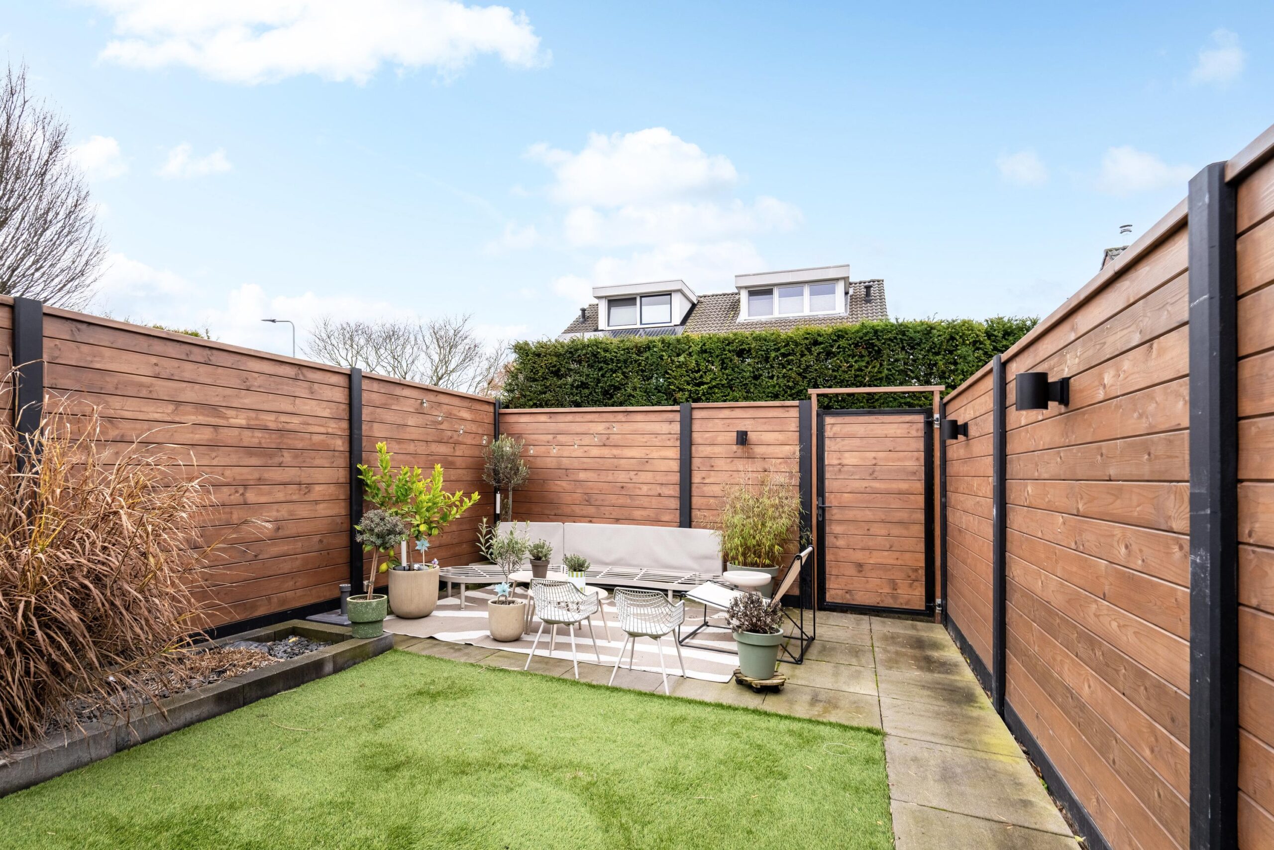 Middels schuifpui is de achtertuin bereikbaar. De tuin, die eveneens recent is gemoderniseerd, is voorzien van een terras met 60×60 tegels en een kunstgrasgazon. De tuin is rondom gesloten middels nieuwe schuttingen en is achterom bereikbaar via een pad.