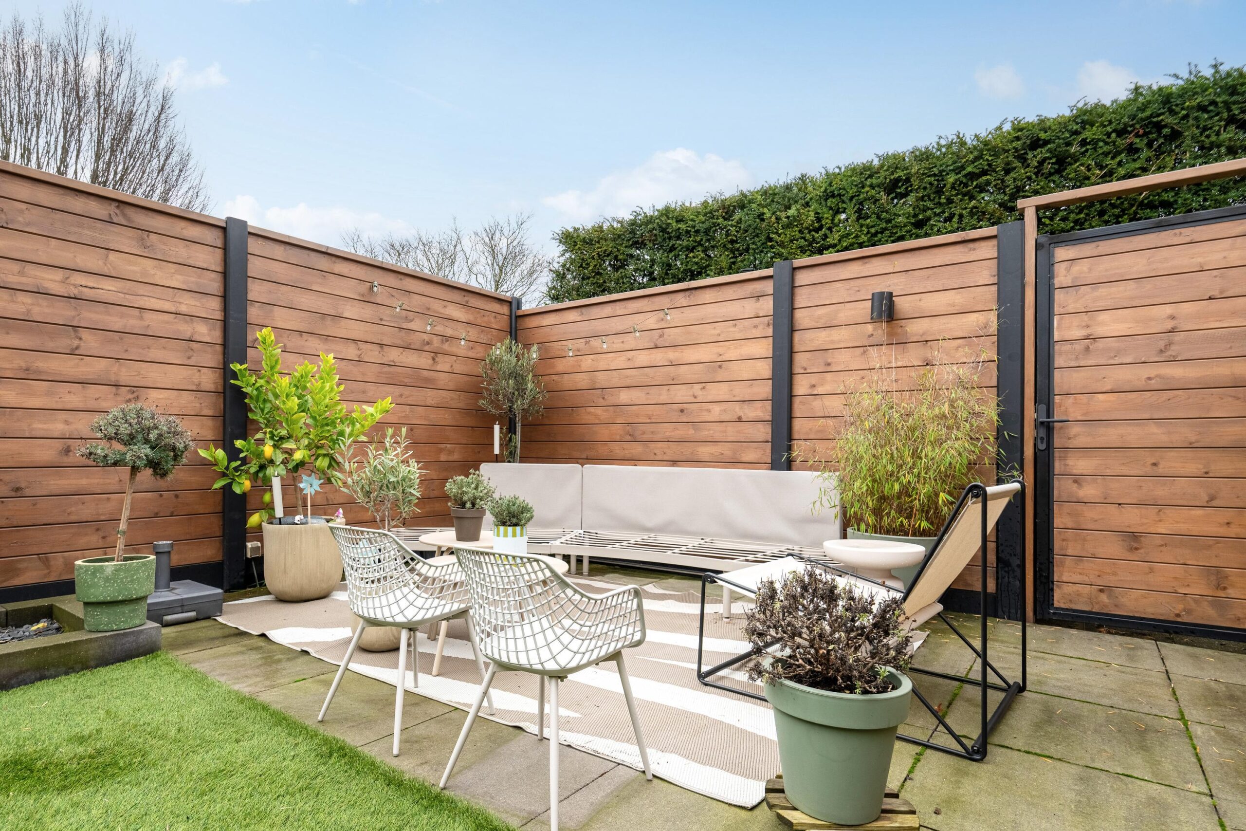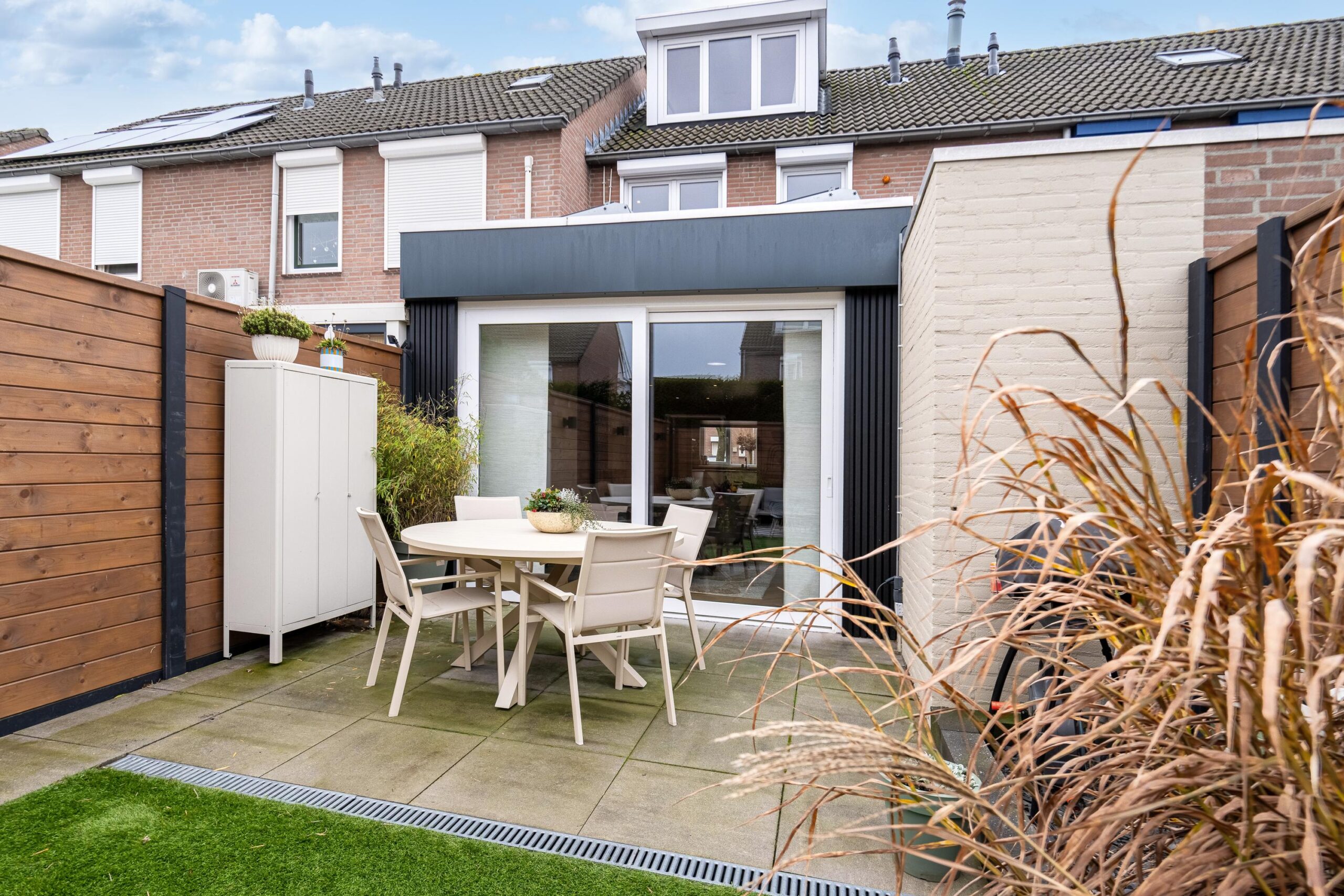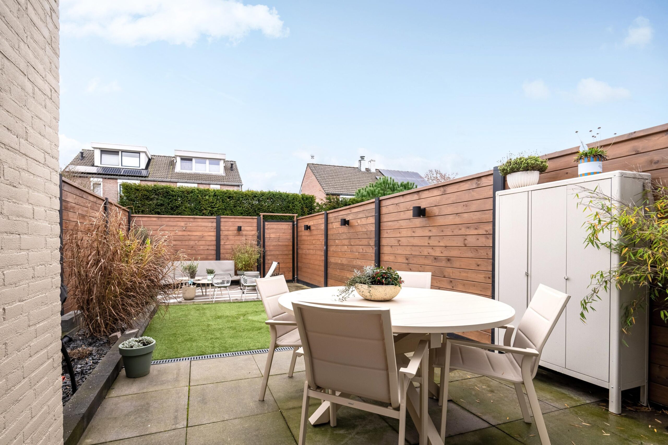 Middels schuifpui is de achtertuin bereikbaar. De tuin, die eveneens recent is gemoderniseerd, is voorzien van een terras met 60×60 tegels en een kunstgrasgazon. De tuin is rondom gesloten middels nieuwe schuttingen en is achterom bereikbaar via een pad.