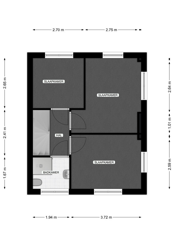 Tweede verdieping: middels vaste trap is deze verdieping bereikbaar met 3 slaapkamer en de badkamer met douche, vaste wastafel en eigen toilet.