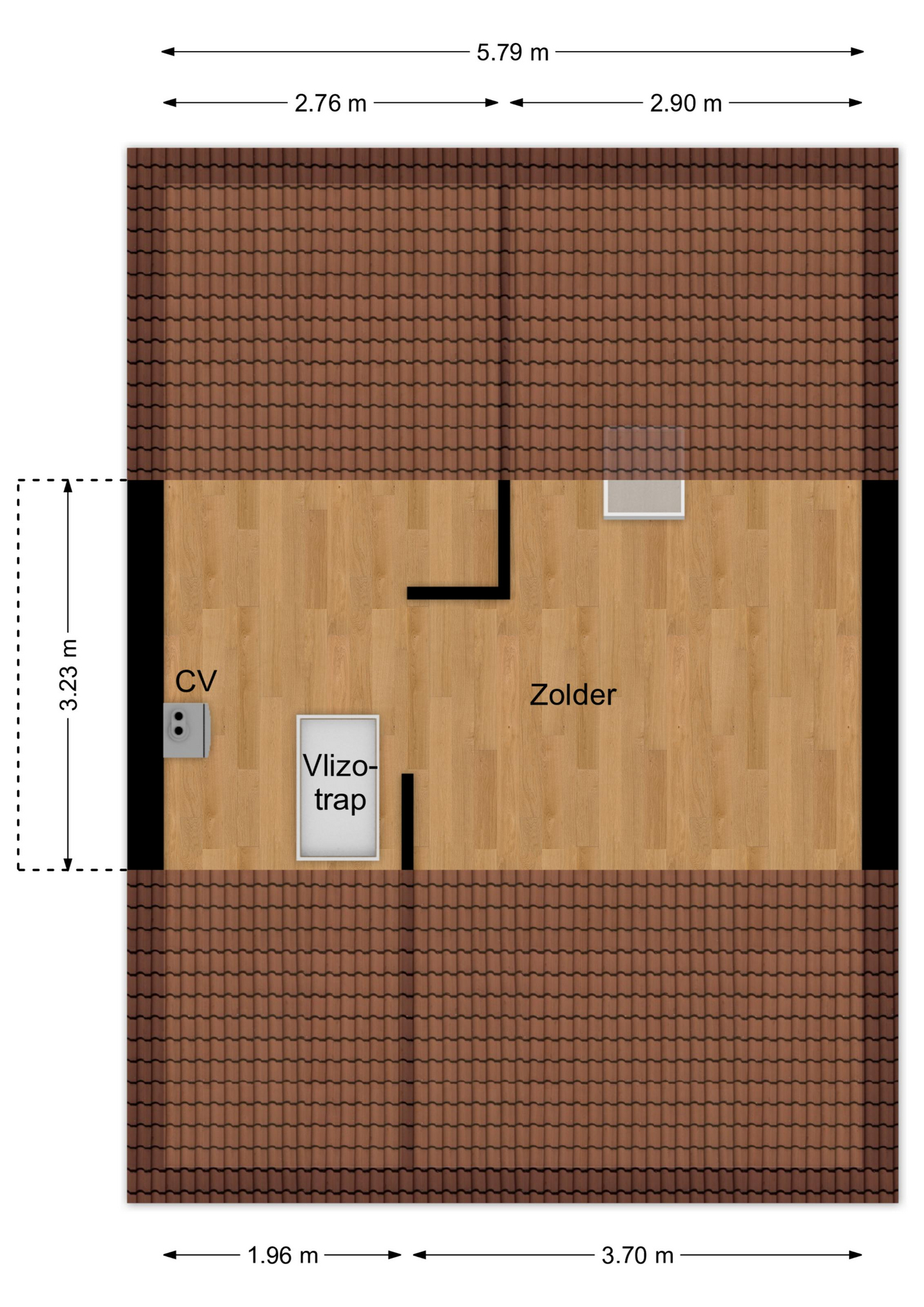 Via een vlizotrap bereikbare zolder met een nokhoogte van ca. 2.27 m. Op zolder is een dakraam en tevens is hier de opstelling van de cv-combiketel (merk Remeha Tzerra, bwjr. 2014, eigendom)