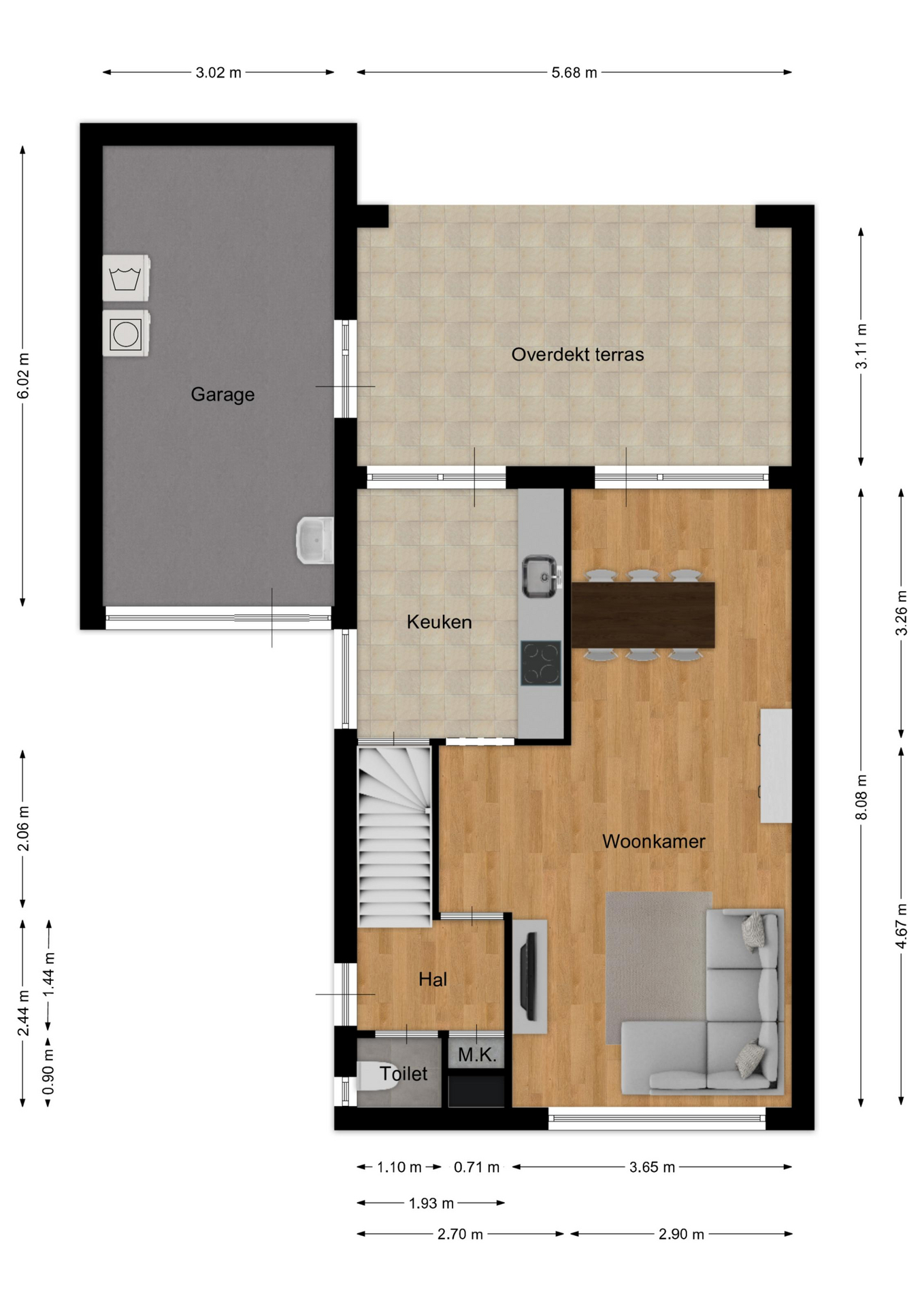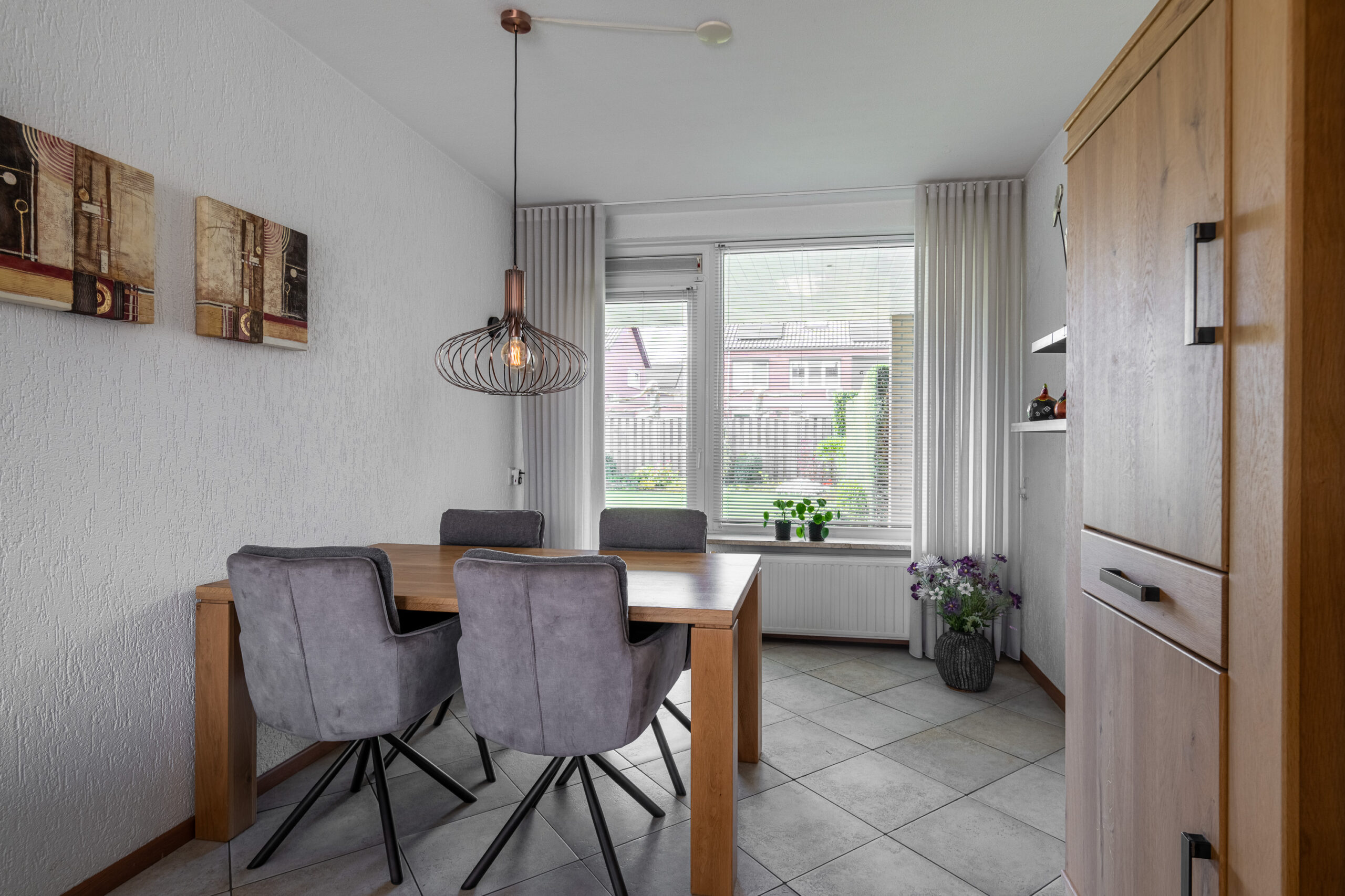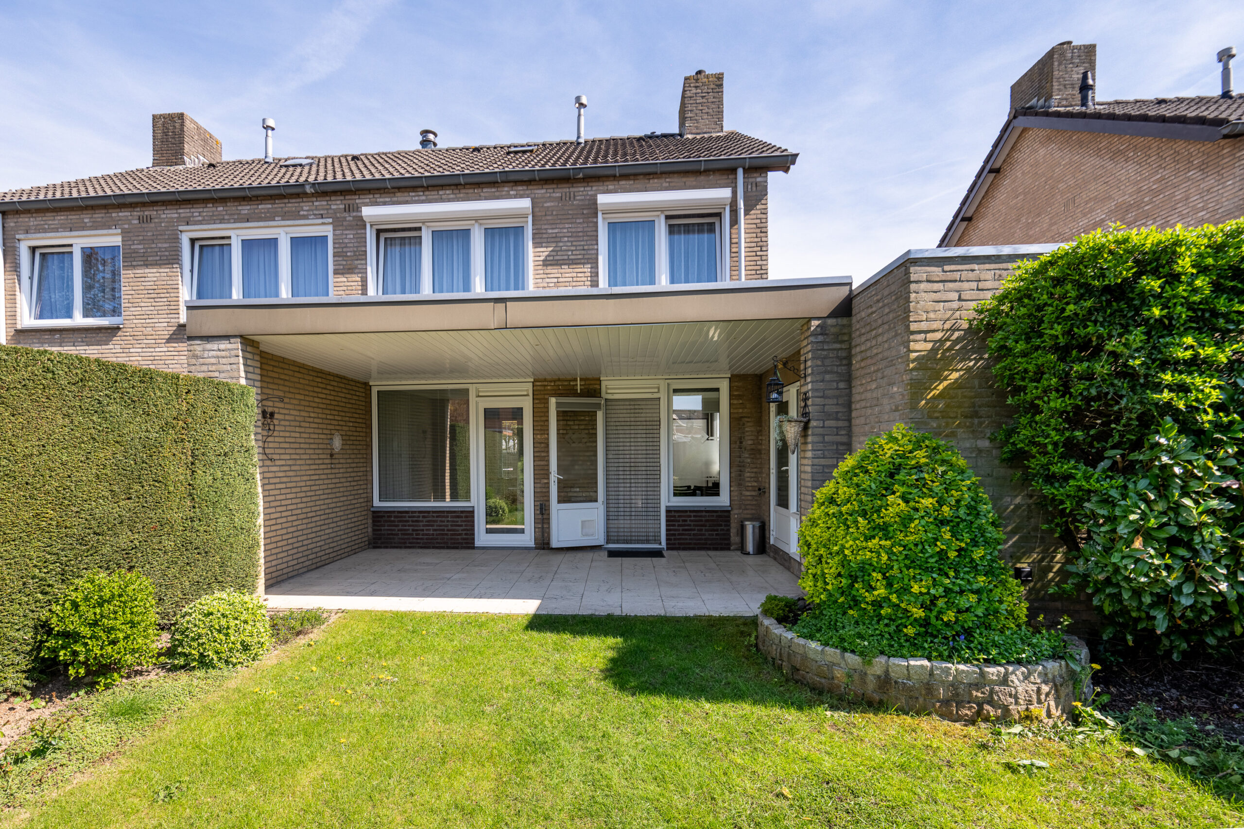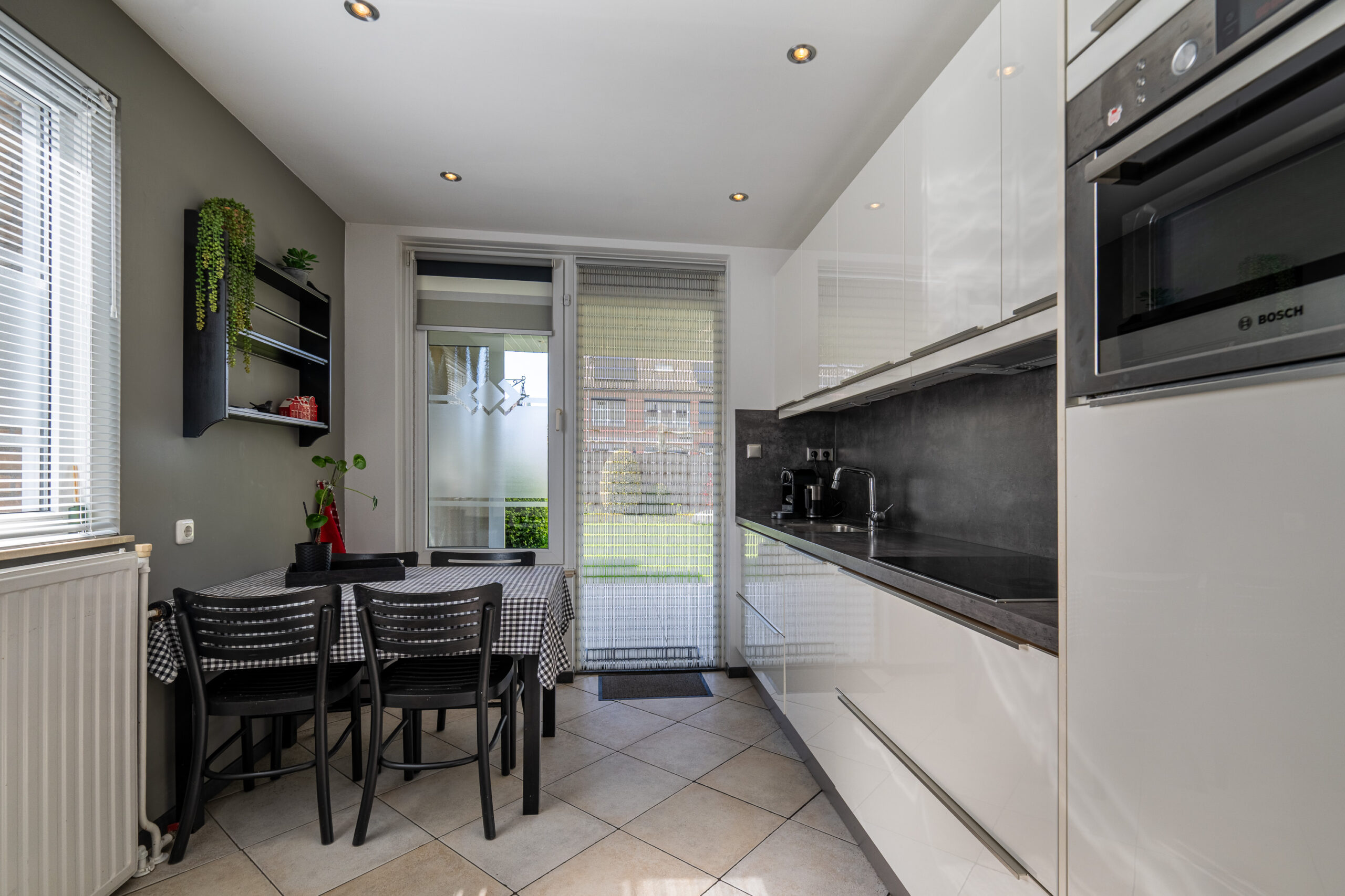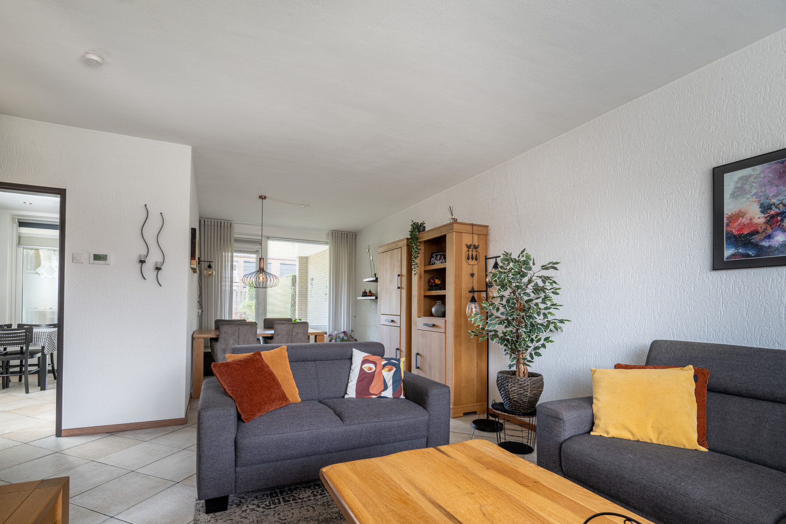 Hal met meterkast (vernieuwde groepenkast met 11 groepen en 4 aardlekschakelaars) en toilet met wandcloset en wastafeltje. Doorzon woonkamer (ca. 29m²) met veel lichtinval en tegelvloer. Keuken (ca. 8.8m²) met moderne aanrechtcombinatie voorzien van de volgende apparatuur: inductiekookplaat, afzuigkap, combimagnetron, koelkast, vaatwasser, en spoelbak. Zowel de woonkamer als de keuken bieden toegang tot het overdekte terras (ca. 19.4 m²). Vanuit het terras is de garage (ca. 18.2 m²) bereikbaar, welke is voorzien van witgoedaansluitingen. Geheel omsloten, zonnige tuin.