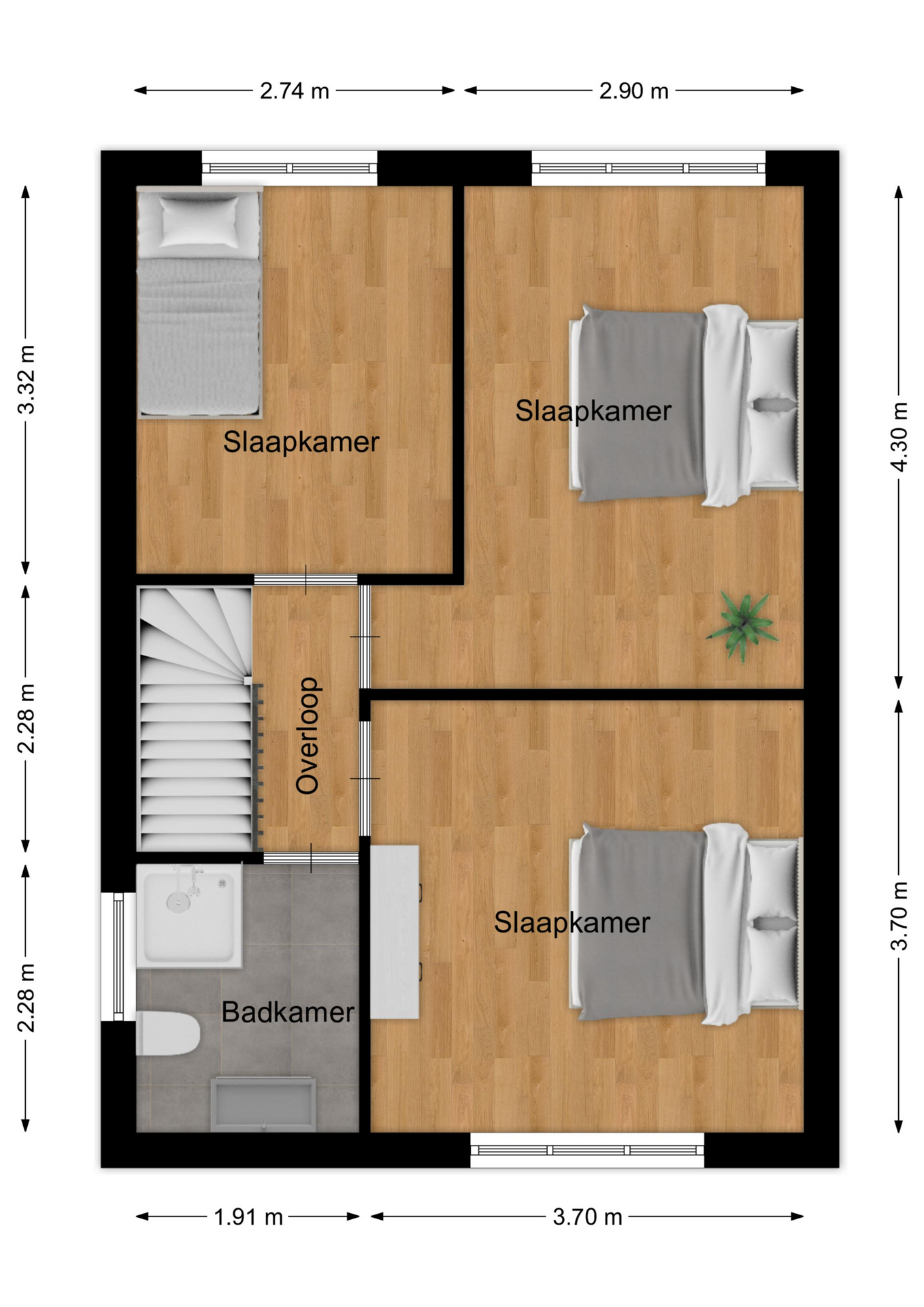 Overloop. Drie slaapkamers (resp. ca. 13.7m², 13.2m², 9m²). Licht betegelde badkamer (ca. 4.4m²) met douche, wandcloset en badmeubel met wastafel.