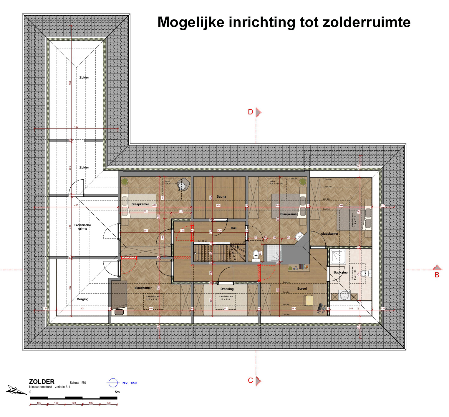 — Verdieping: overloop met sauna, twee slaapkamers, zolderruimtes en technische ruimte;