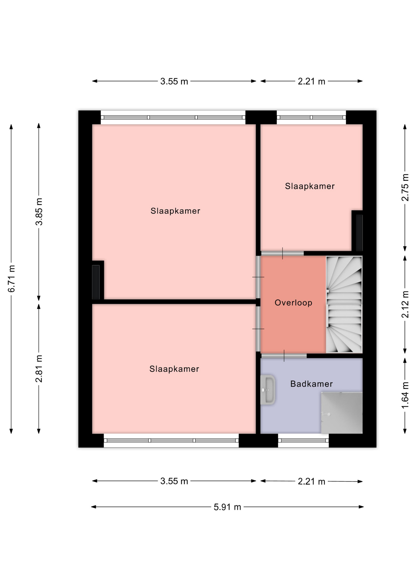 Vanaf de overloop zijn drie slaapkamers bereikbaar (ca. 13 m², 10 m² en 6 m²), allen met een prettige lichtinval. De badkamer (ca. 4 m²) is eenvoudig uitgevoerd en voorzien van een douche en wastafel.