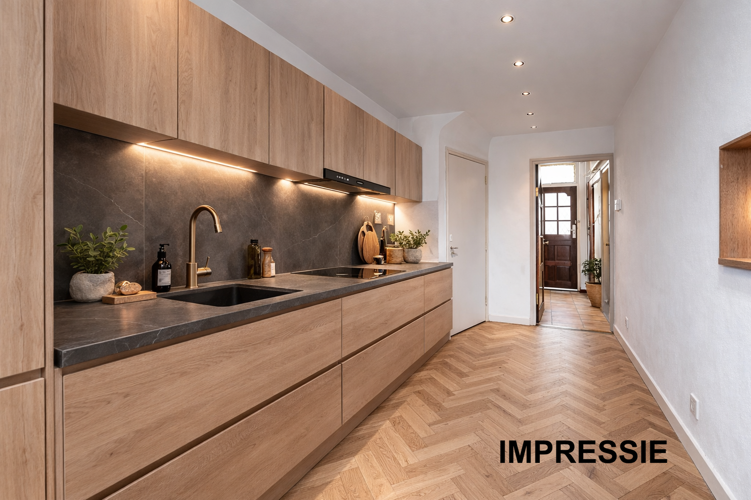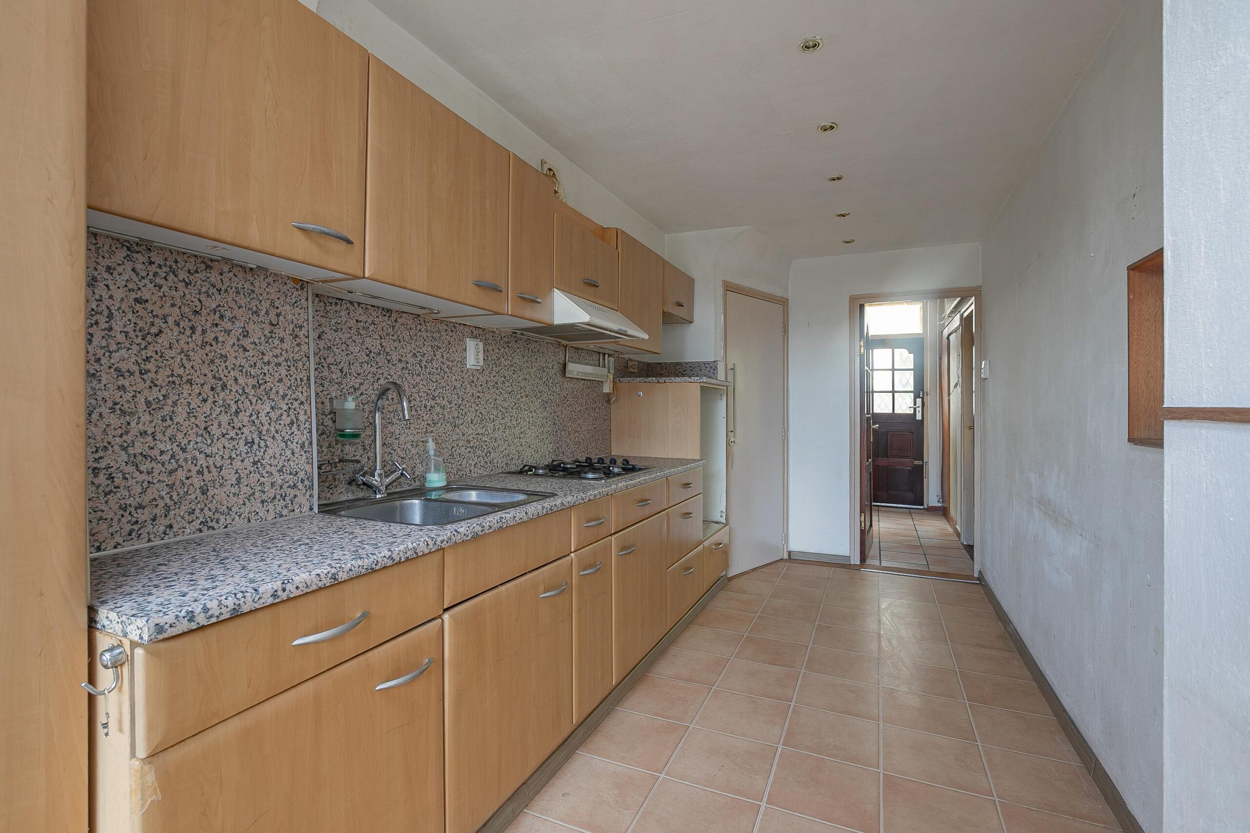De separate keuken (ca. 12 m²) is voorzien van een gasfornuis, spoelbak en afzuigkap en biedt mogelijkheden voor modernisering naar eigen smaak. Vanuit de keuken is er toegang tot zowel de hal als de tuin.