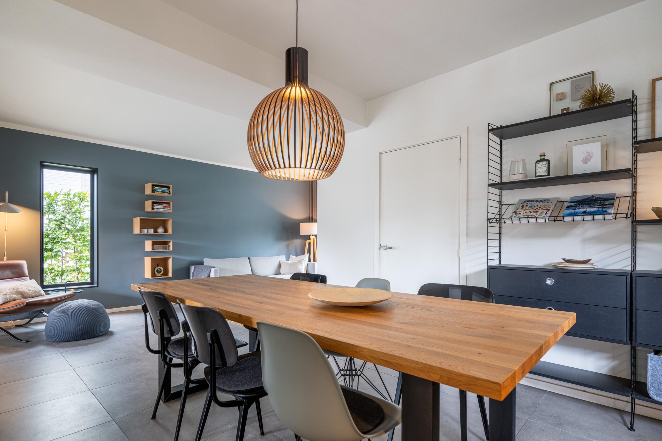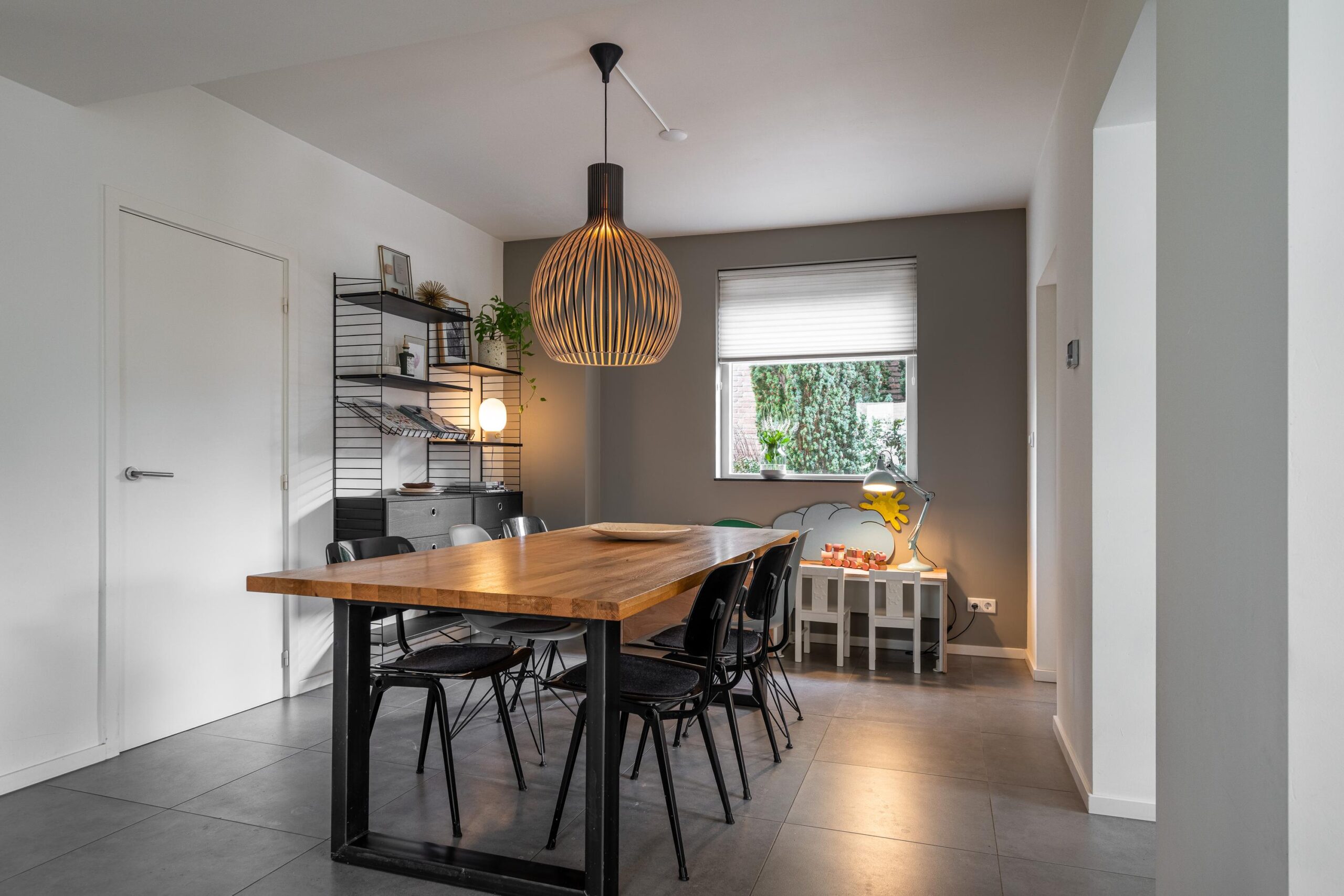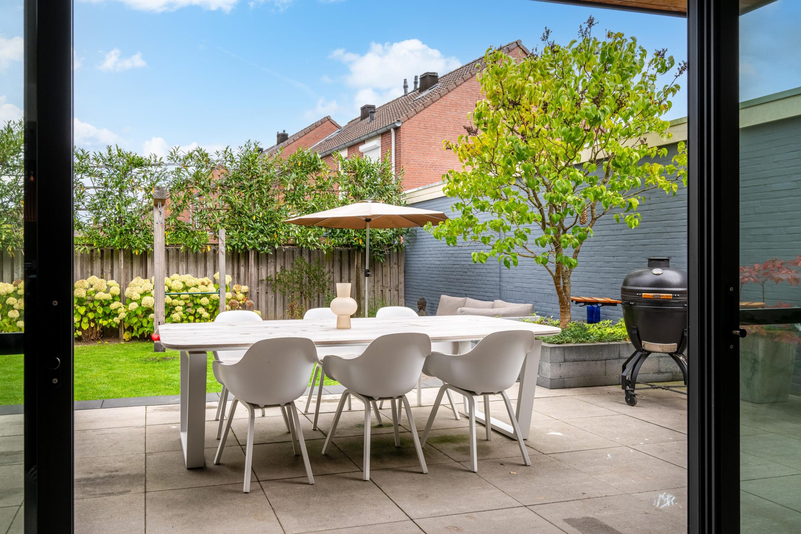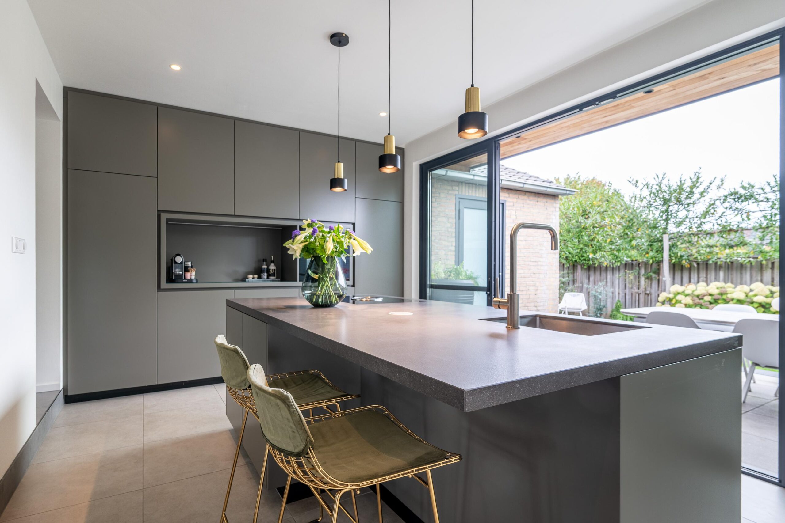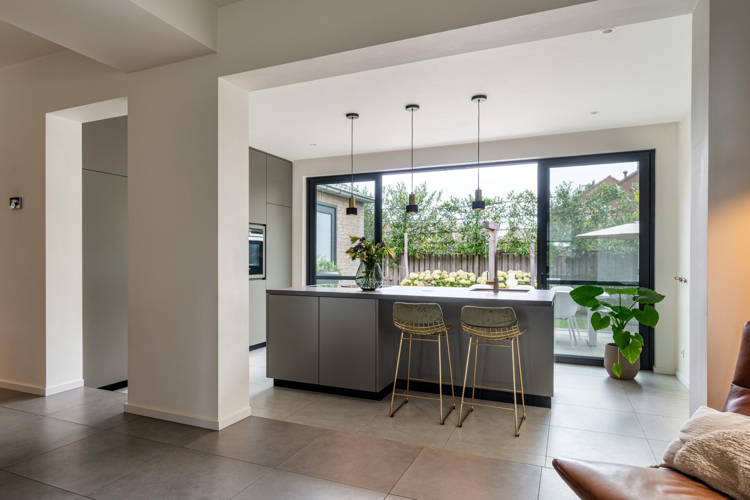 De keuken beschikt over een grote schuifpui naar de achtertuin, wat zorgt voor veel lichtinval en een prettig tuincontact.