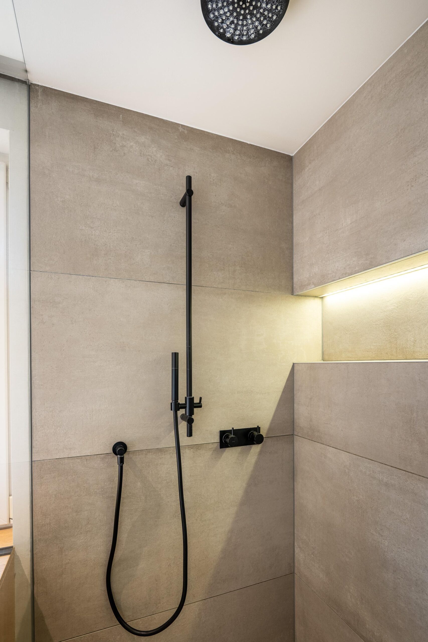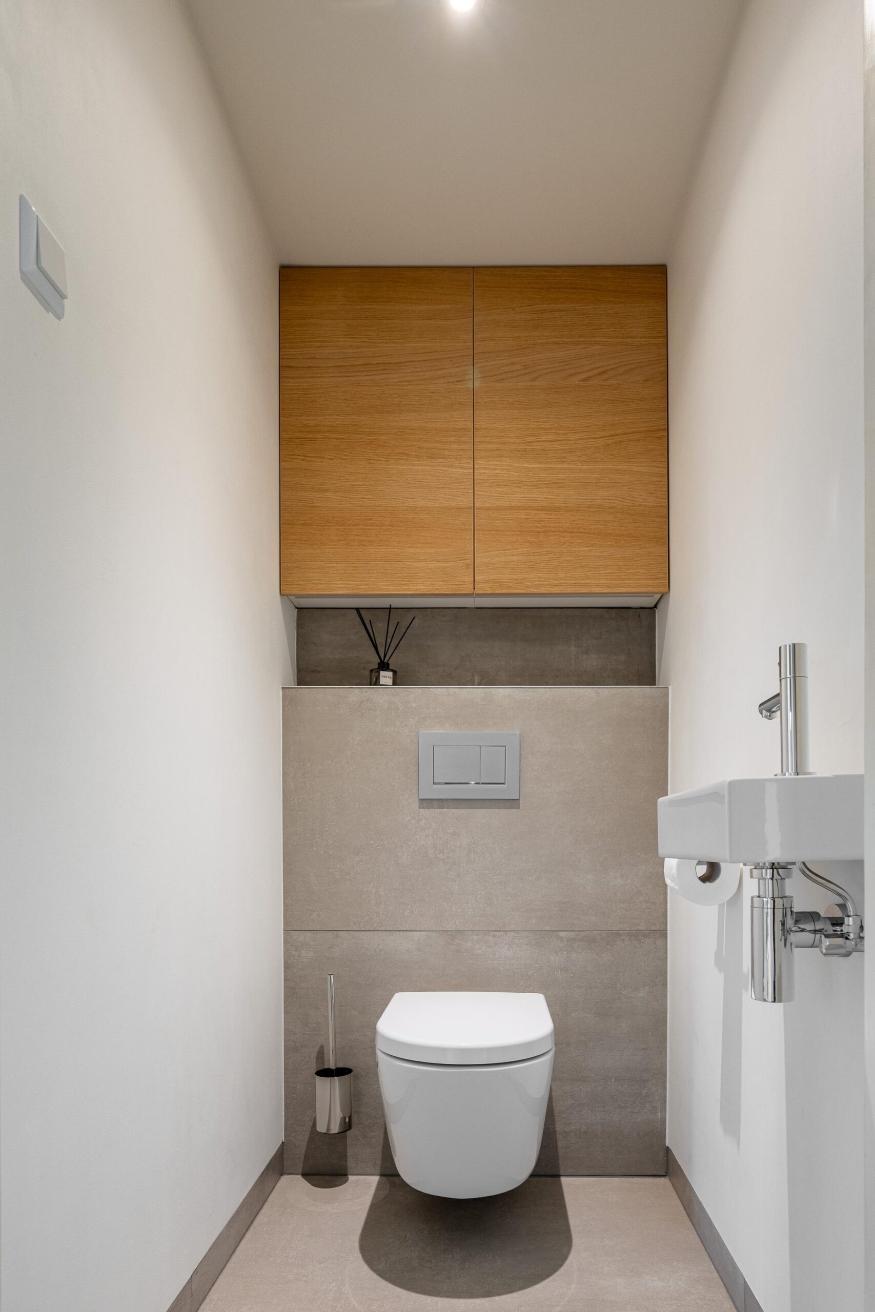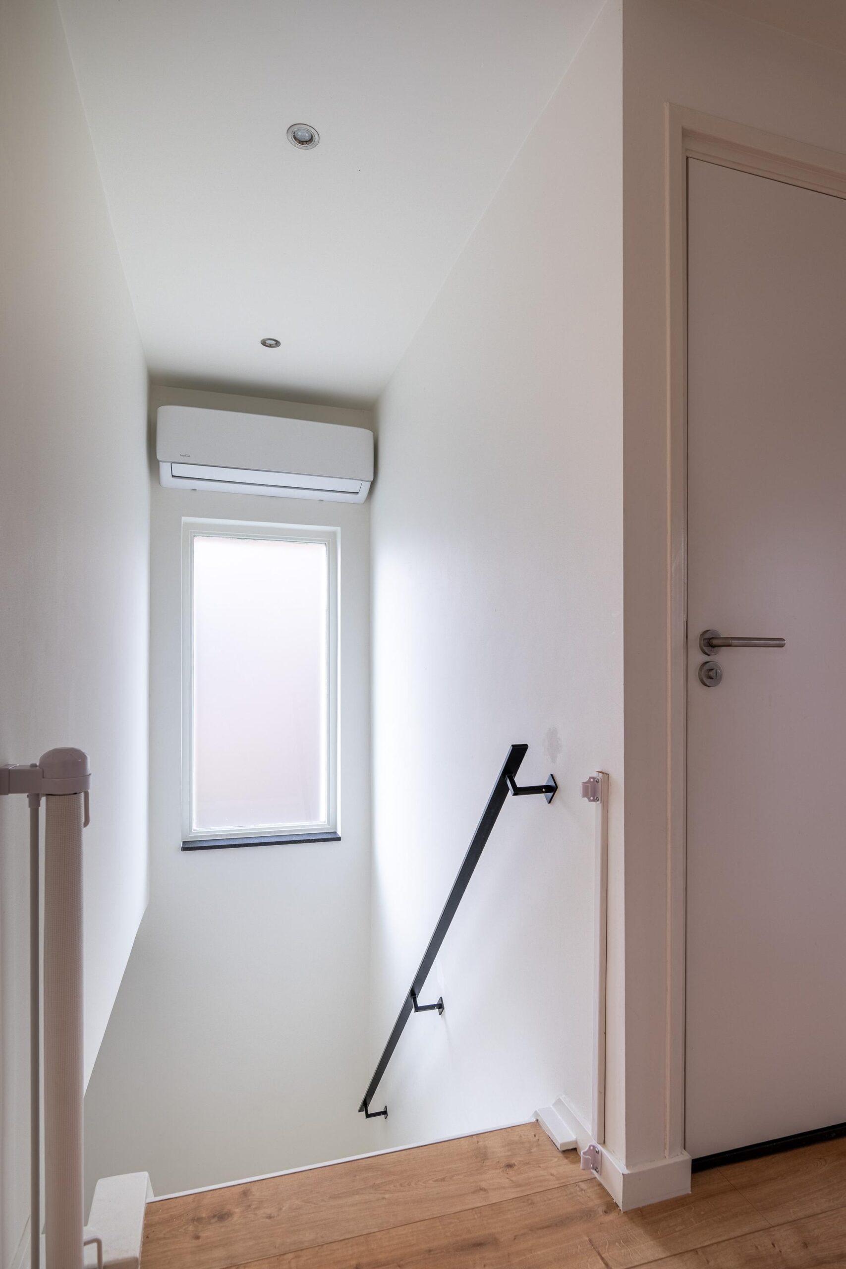De badkamer (circa 5 m²), met vloerverwarming, is in 2017 vernieuwd en voorzien van een inloopdouche en dubbele wastafelmeubel. Daarnaast is er op de overloop een separaat toilet gerealiseerd. Op de overloop is een airconditioning geplaatst.