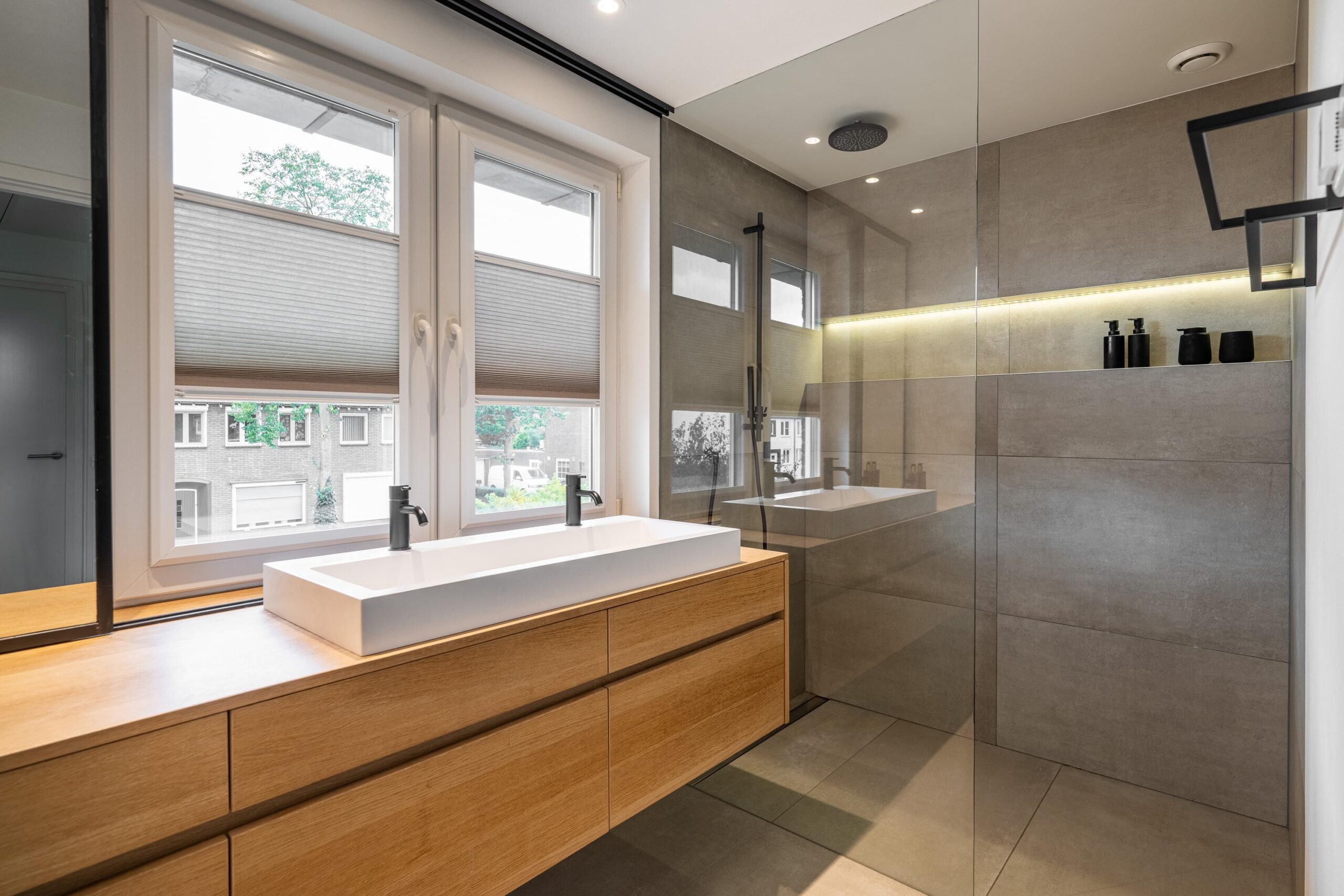 - Badkamervoorzieningen Dubbele wastafel, inloopdouche