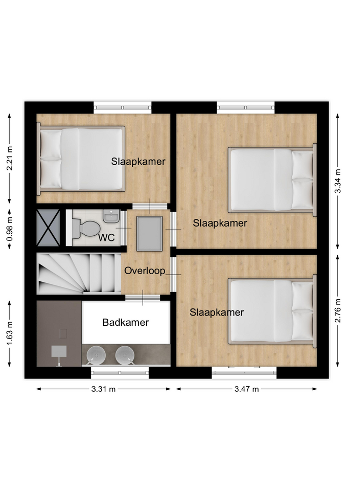 Op de eerste verdieping bevinden zich drie slaapkamers van circa 7 m², 10 m² en 12m².