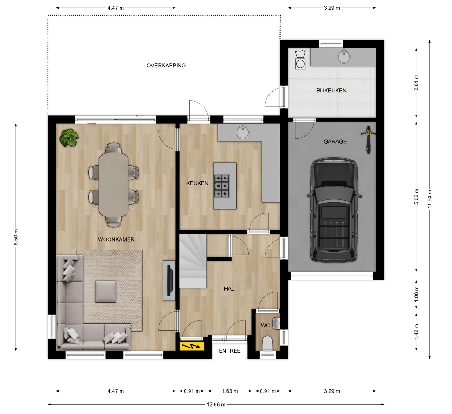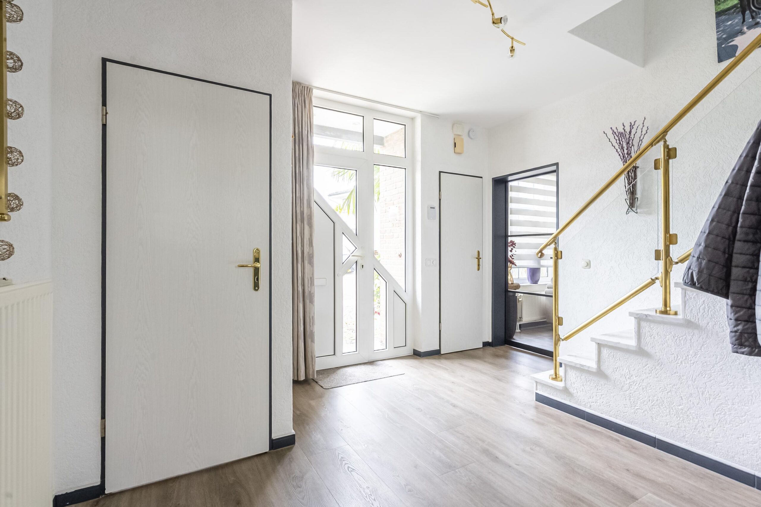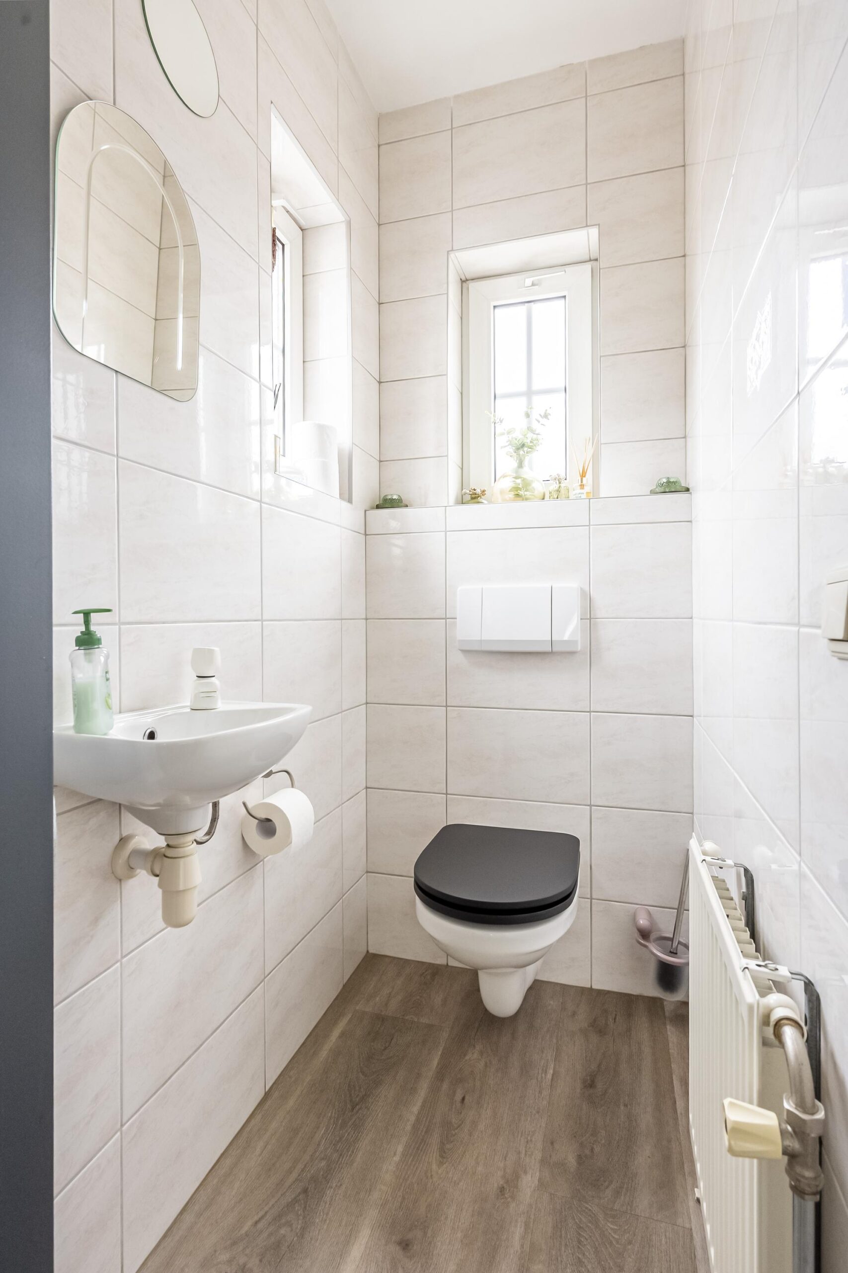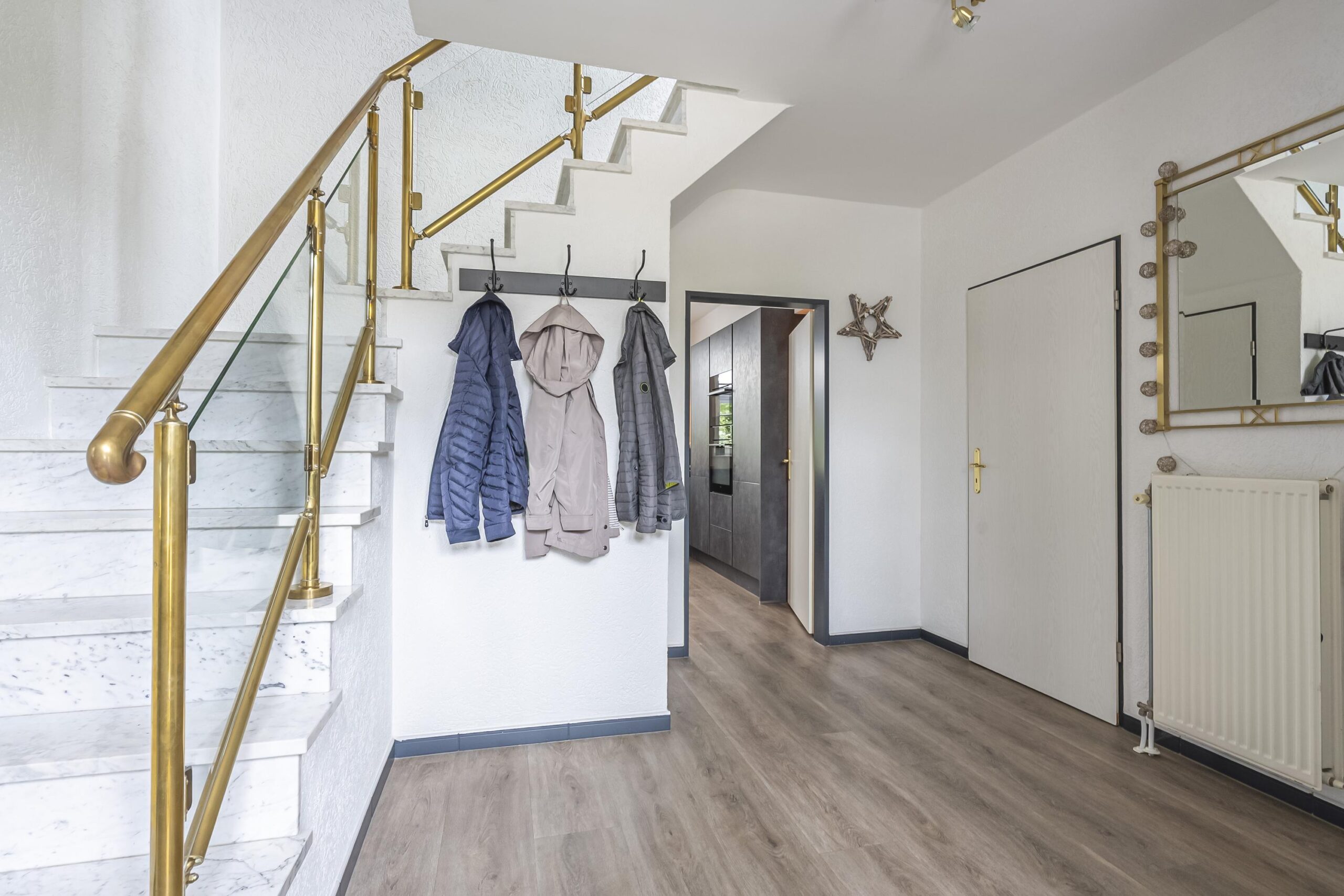 Hal met meterkast, gastentoilet met zwevend toilet en fonteintje, trapopgang en trapkast biedt toegang tot de woonkamer, de gesloten keuken en de garage.