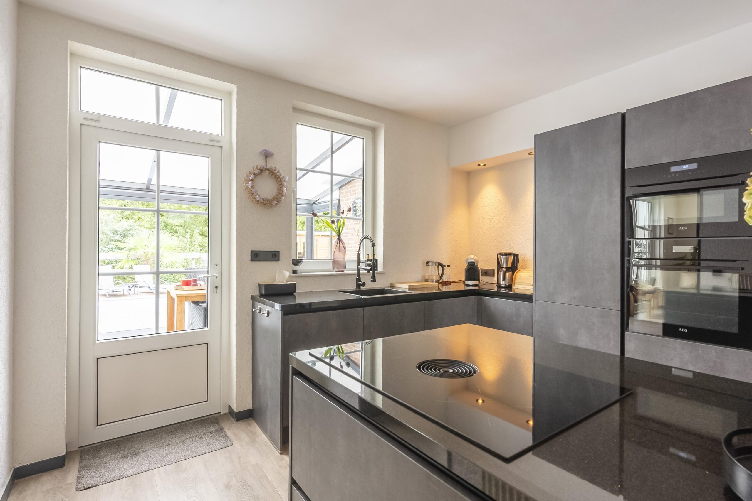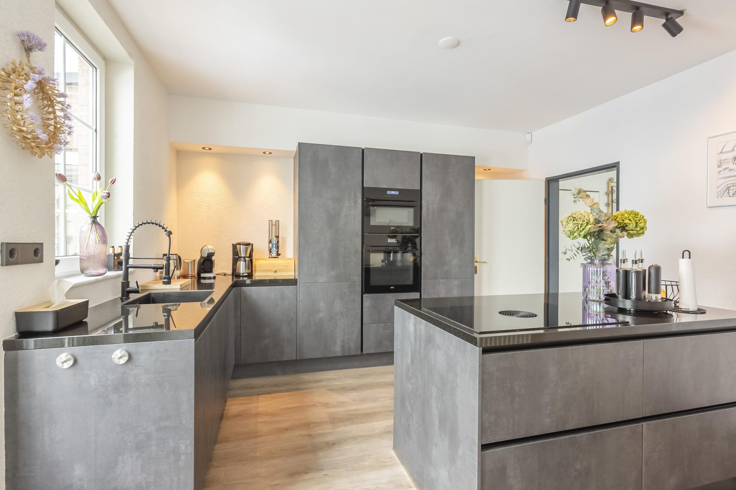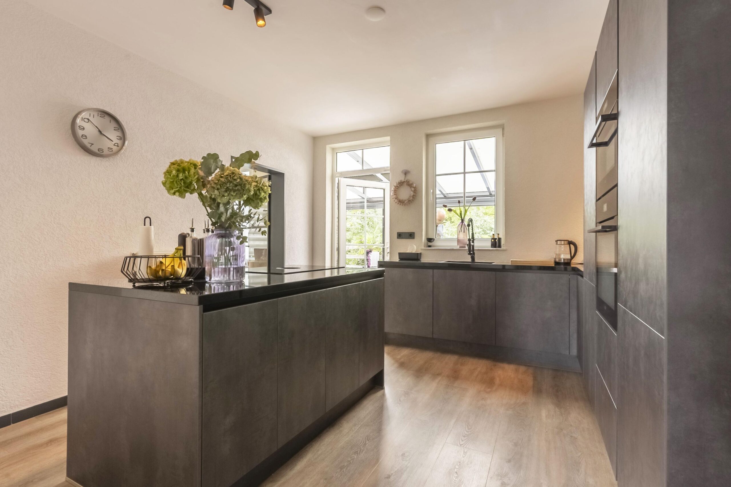 De keuken is groot ca. 15 m² en is voorzien van een PVC vloer en moderne keuken in hoekopstelling met kookeiland, welke is voorzien van de navolgende apparatuur: Bora inductiekookplaat met geïntegreerde afzuiging, vaatwasser, koelkast, combimagnetron, oven en vaatwasser.