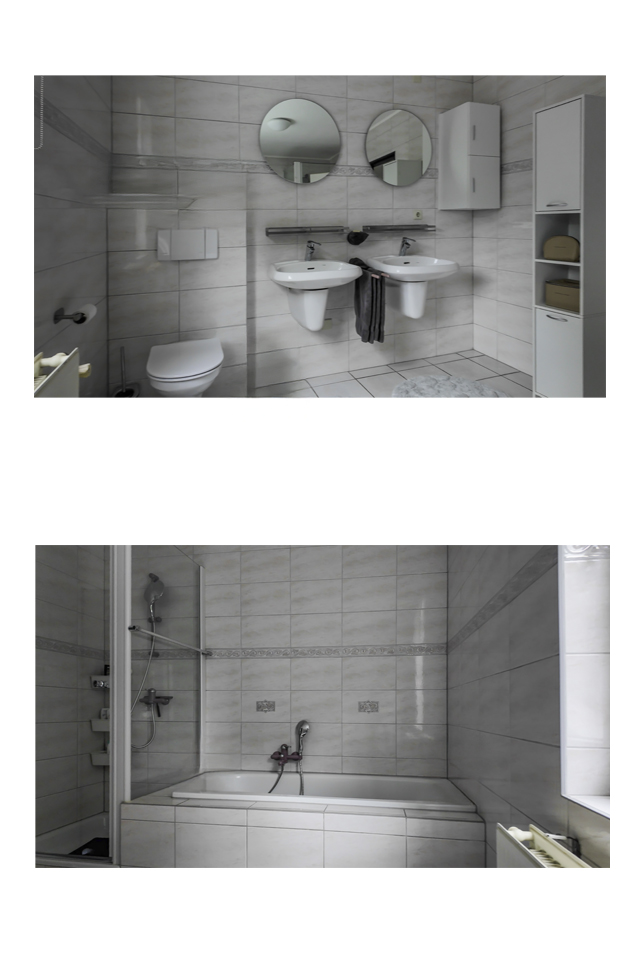 De geheel betegelde badkamer is groot ca. 10 m² en is voorzien van een ligbad, douche, dubbele wastafel en zwevend toilet.