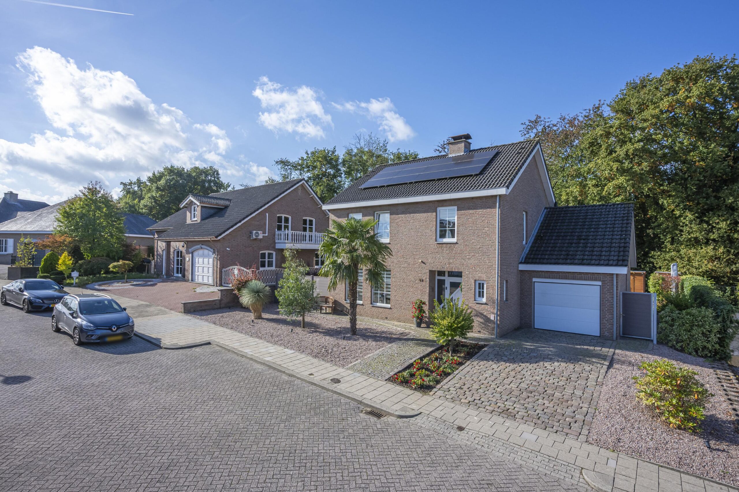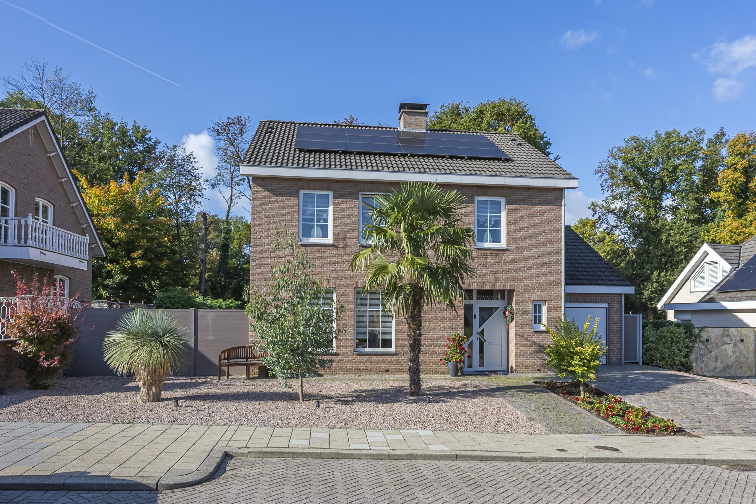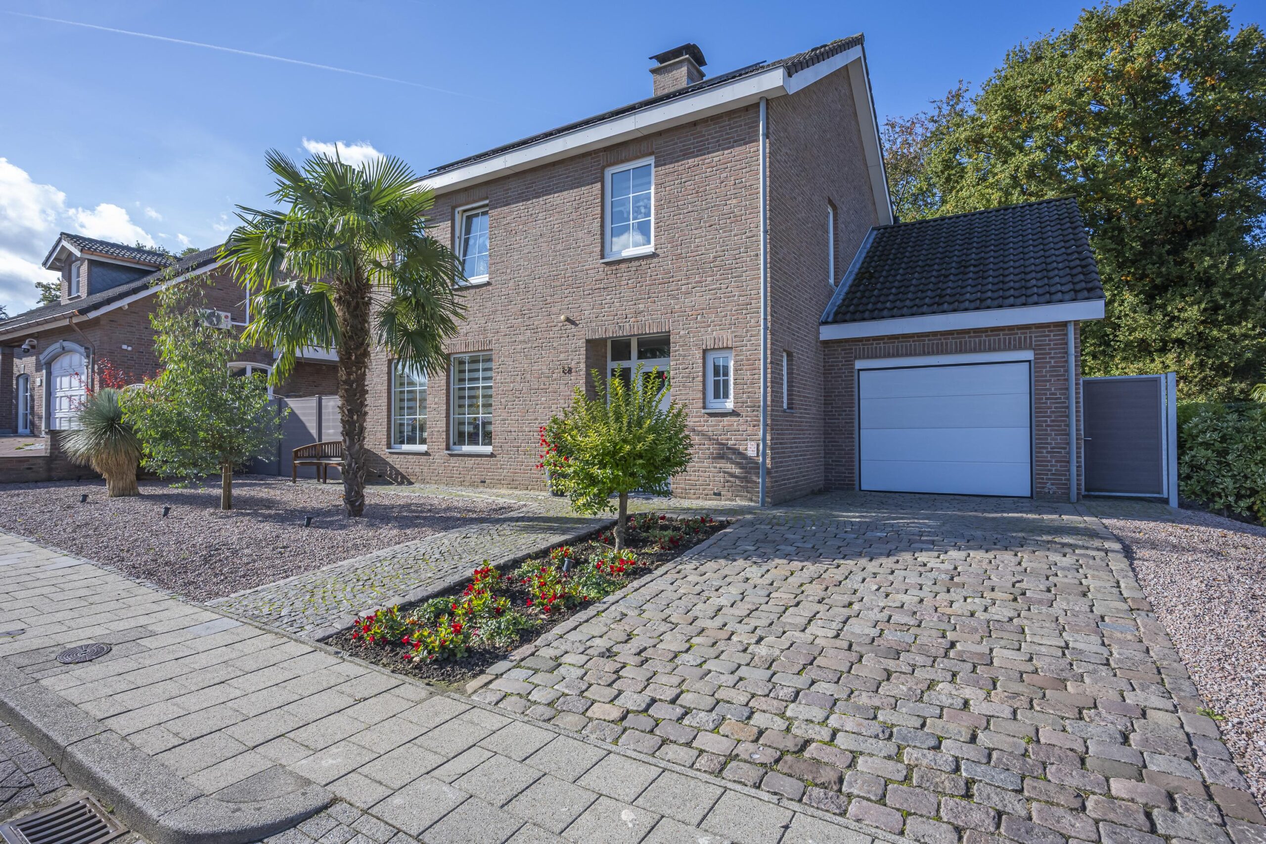 Fraai aangelegde voortuin met ruime oprit voor meerdere auto’s en overdekte entree.