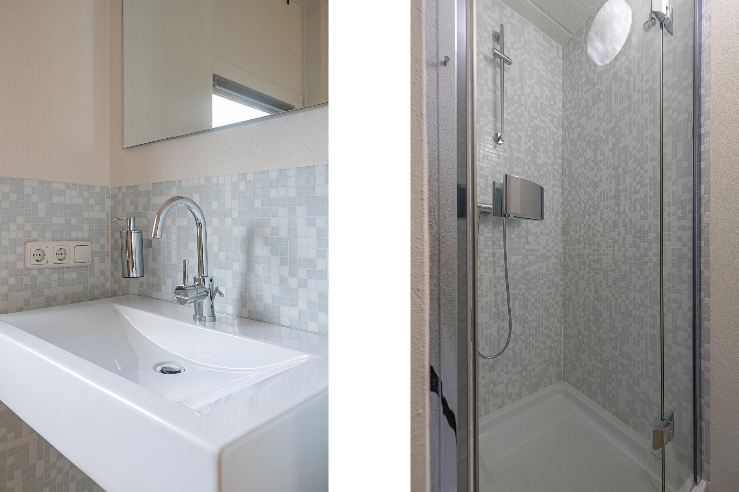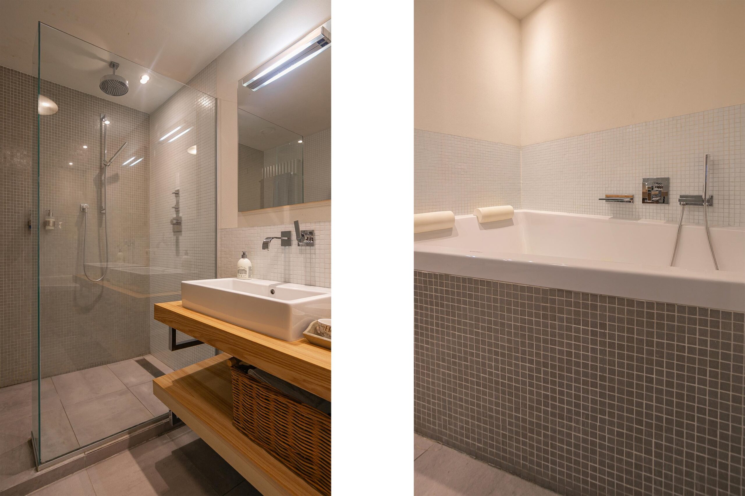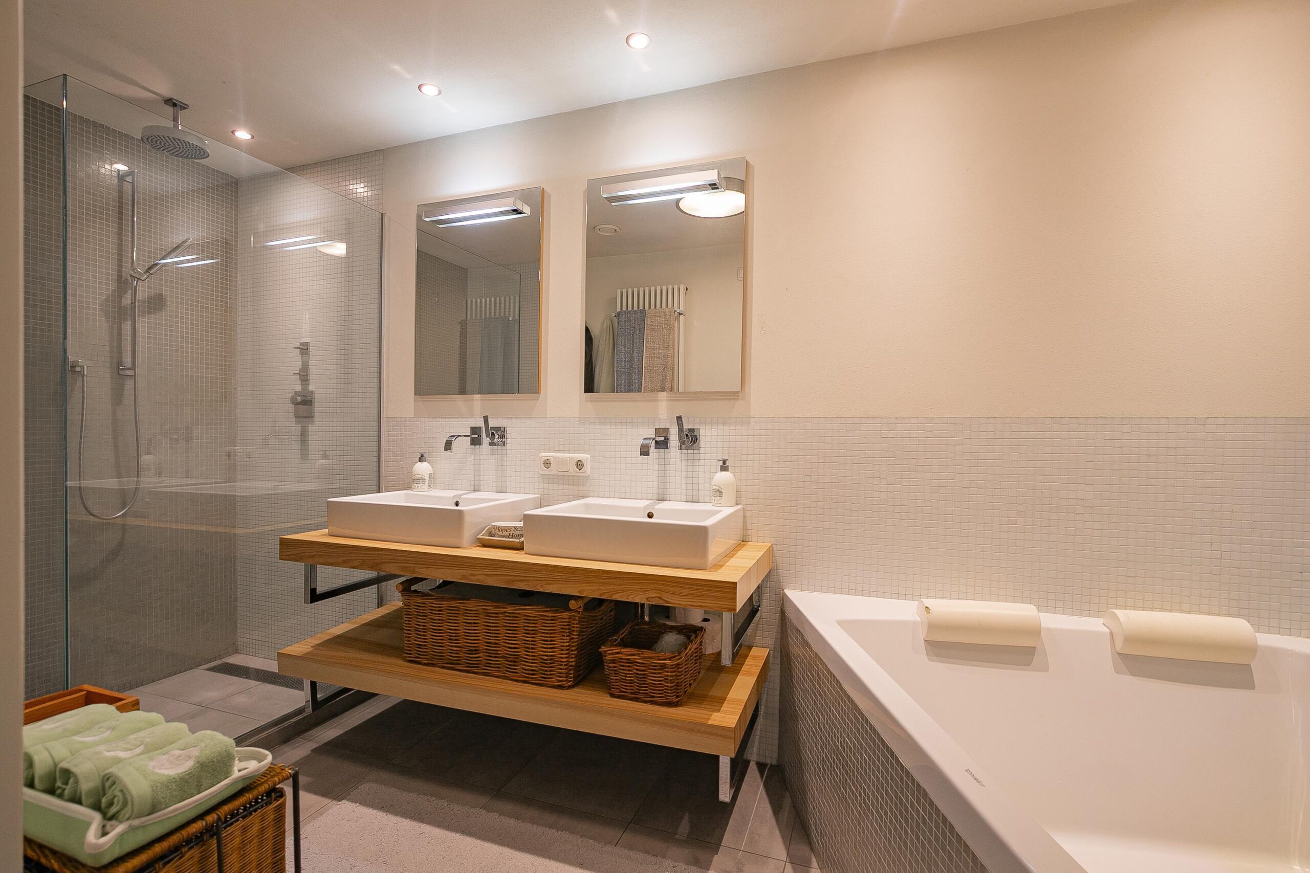 - Badkamervoorzieningen Ligbad, dubbele wastafel, inloopdouche, vloerverwarming