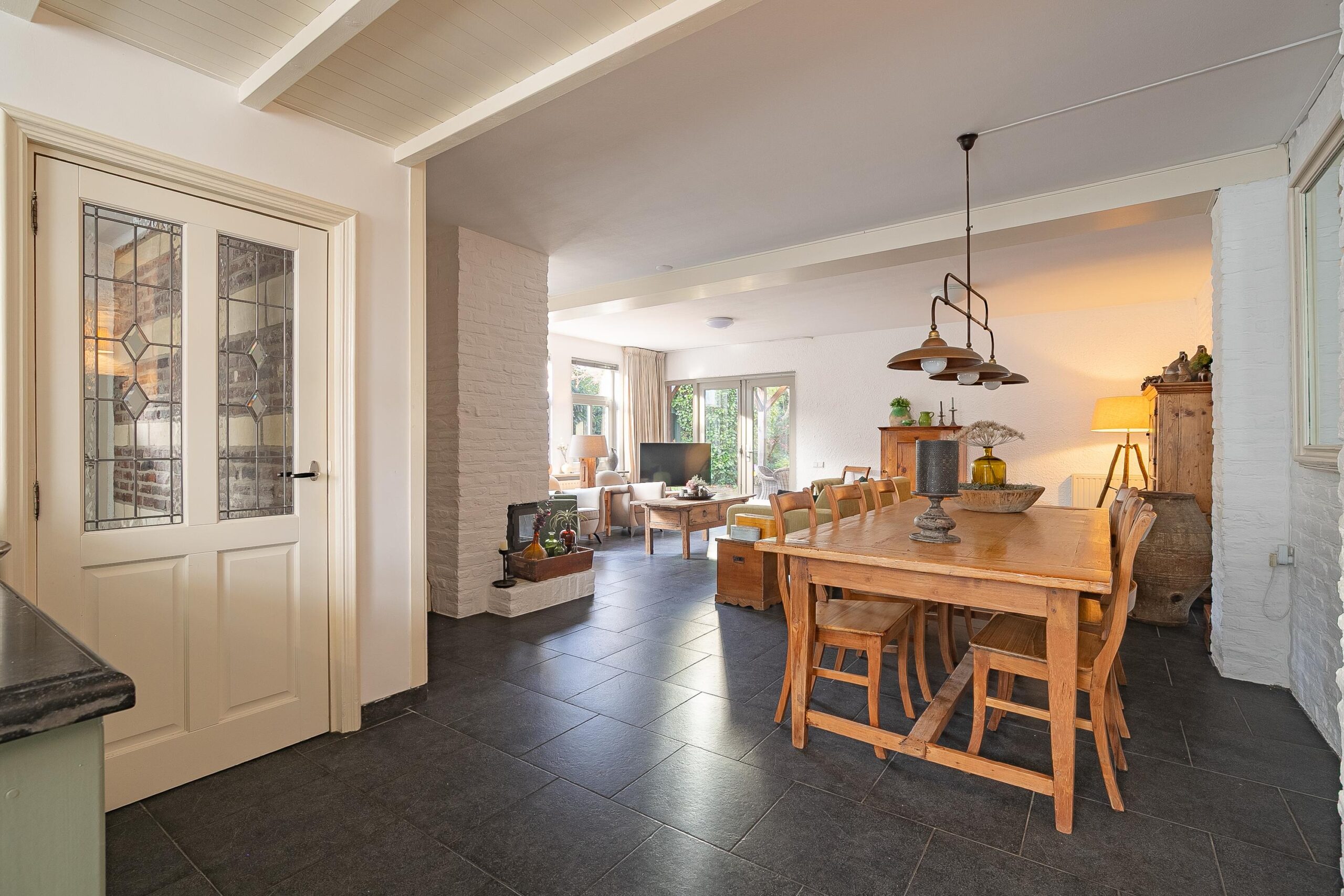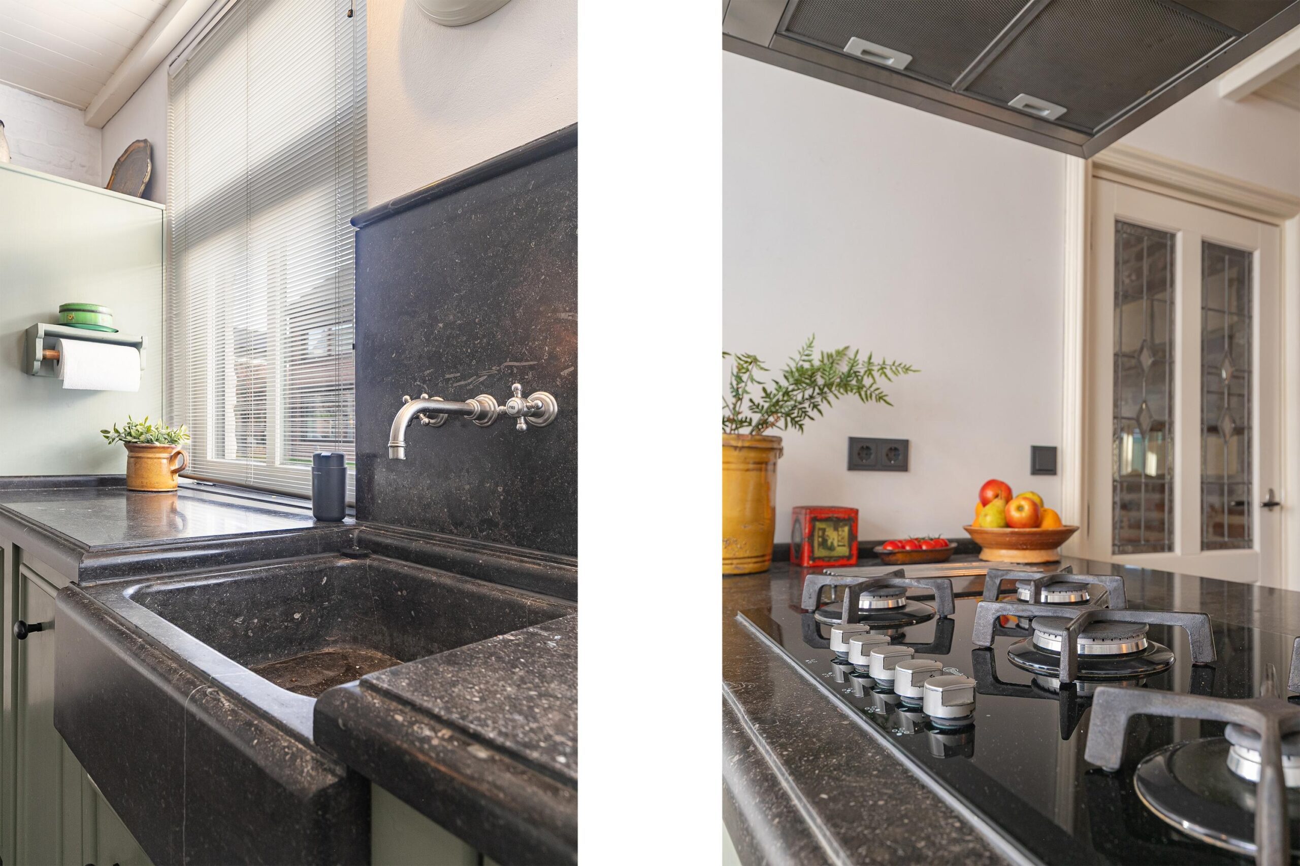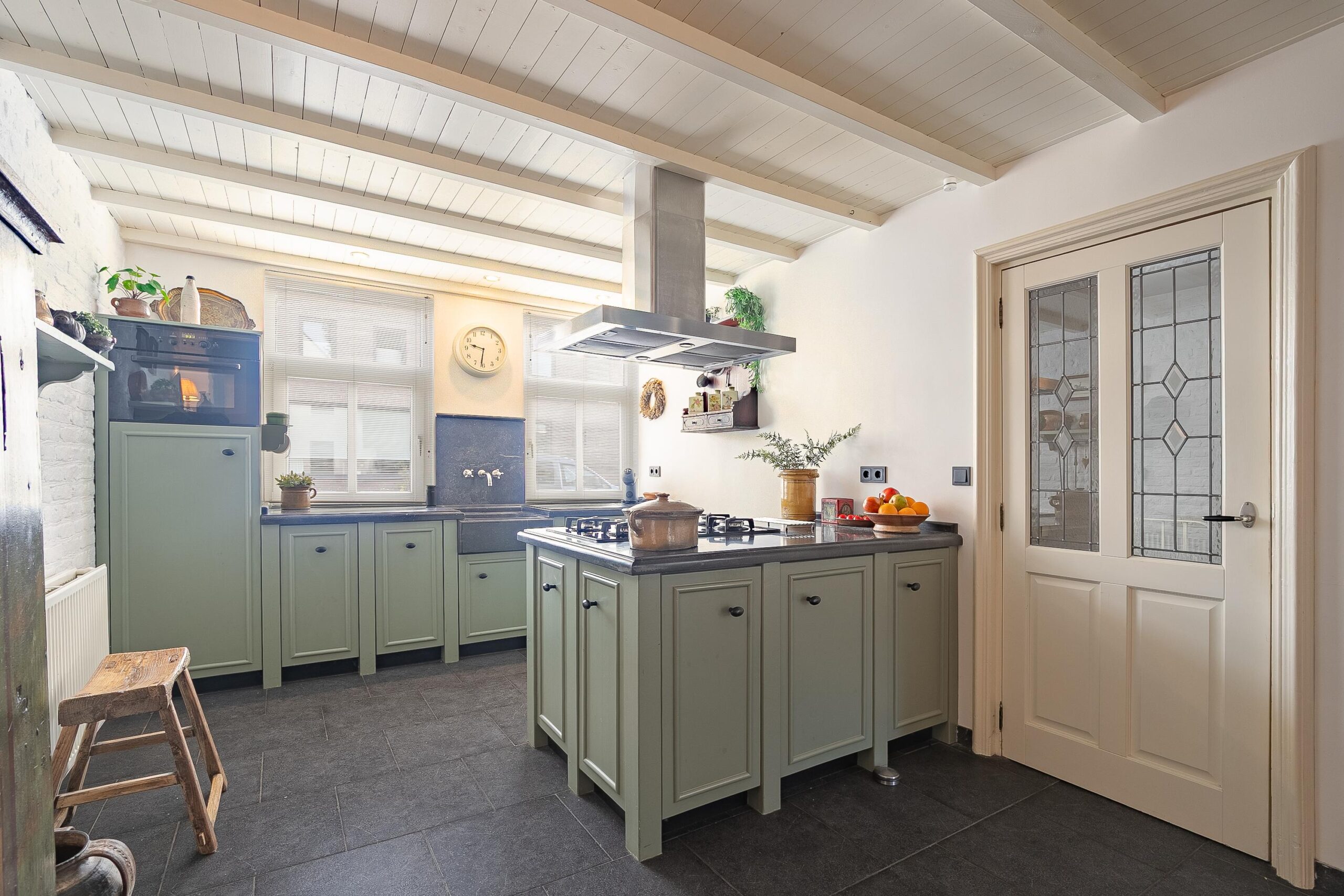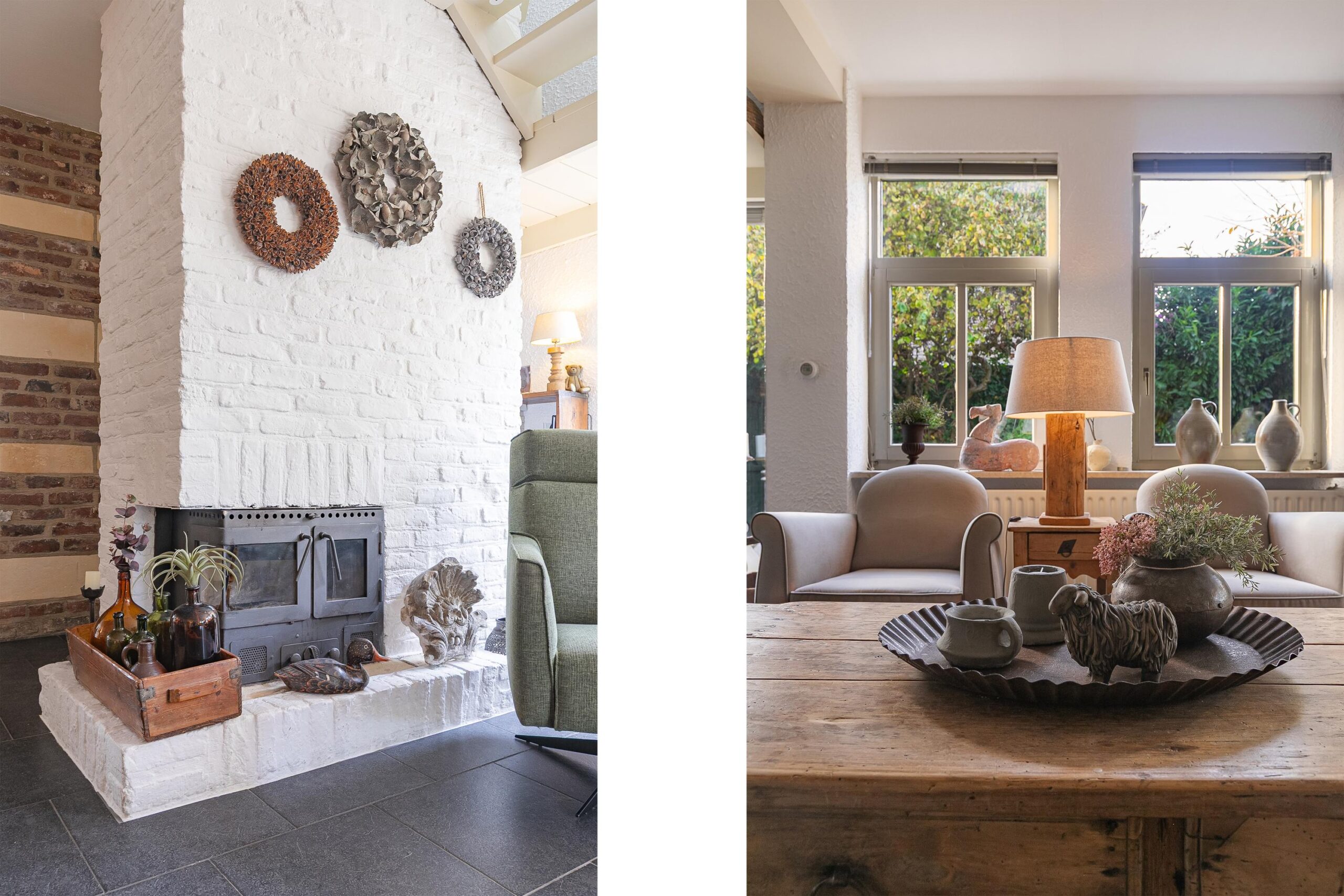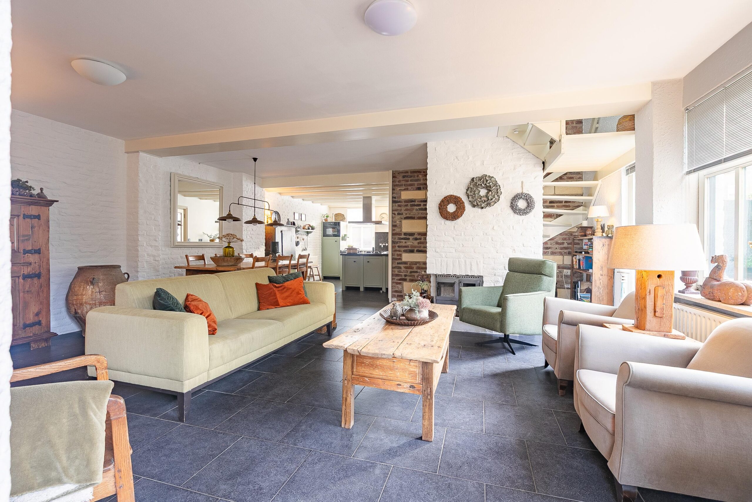 Entree/hal met toegang tot de toiletruimte, meterkast, de sfeervolle leefruimte en het souterrain. De volledig betegelde toiletruimte is uitgerust met een hangcloset, fonteintje en mechanische ventilatie. De leefruimte (ca. 44m²) heeft een royale en karakteristieke uitstraling en vormt het hart van de woning. De landelijke keuken (ca. 13m²) is voorzien van een ruim kookeiland met 5-pits gaskookplaat, spoelbak, vaatwasser, koelkast, oven en afzuigkap. Vanuit de keuken loopt u vloeiend door naar de open eetruimte en het gezellige zitgedeelte. In de zithoek zorgt de houthaard voor extra sfeer en warmte, terwijl de grote raampartijen zorgen voor veel natuurlijke lichtinval. De gehele begane grond is afgewerkt met een donkere tegelvloer en beschikt over houten kozijnen met dubbele beglazing, wat bijdraagt aan een solide en warme uitstraling.