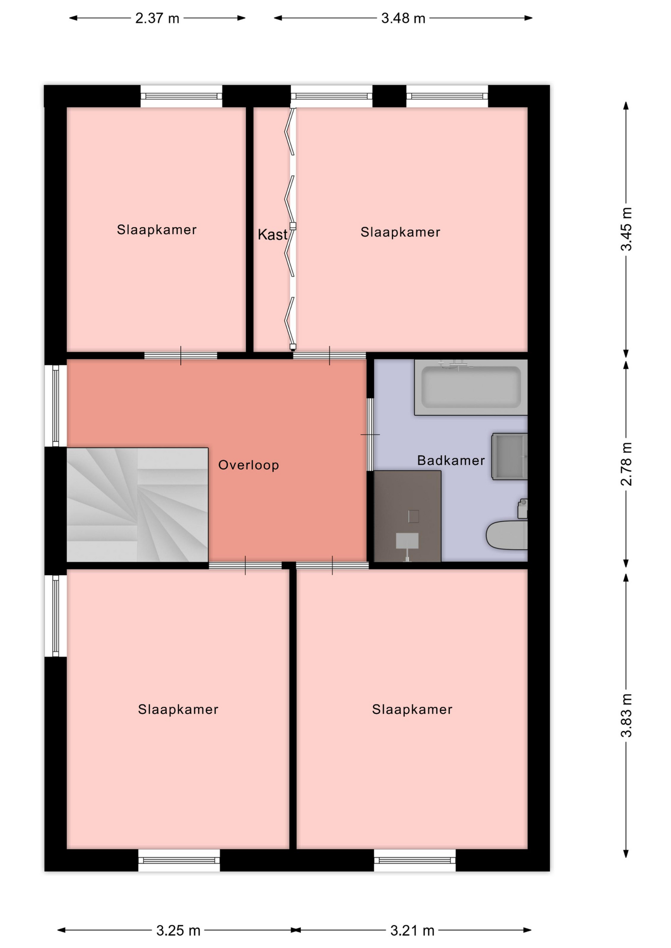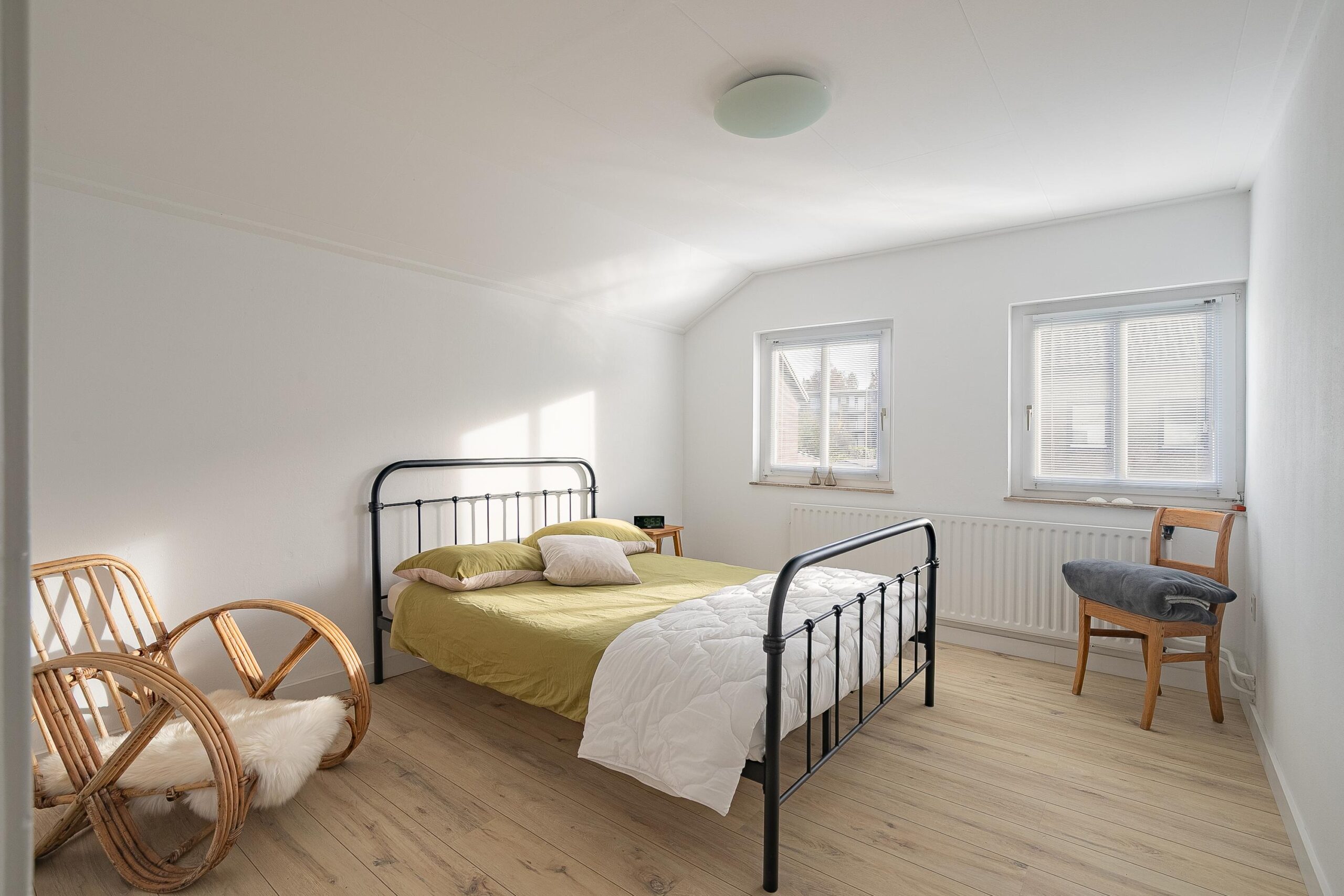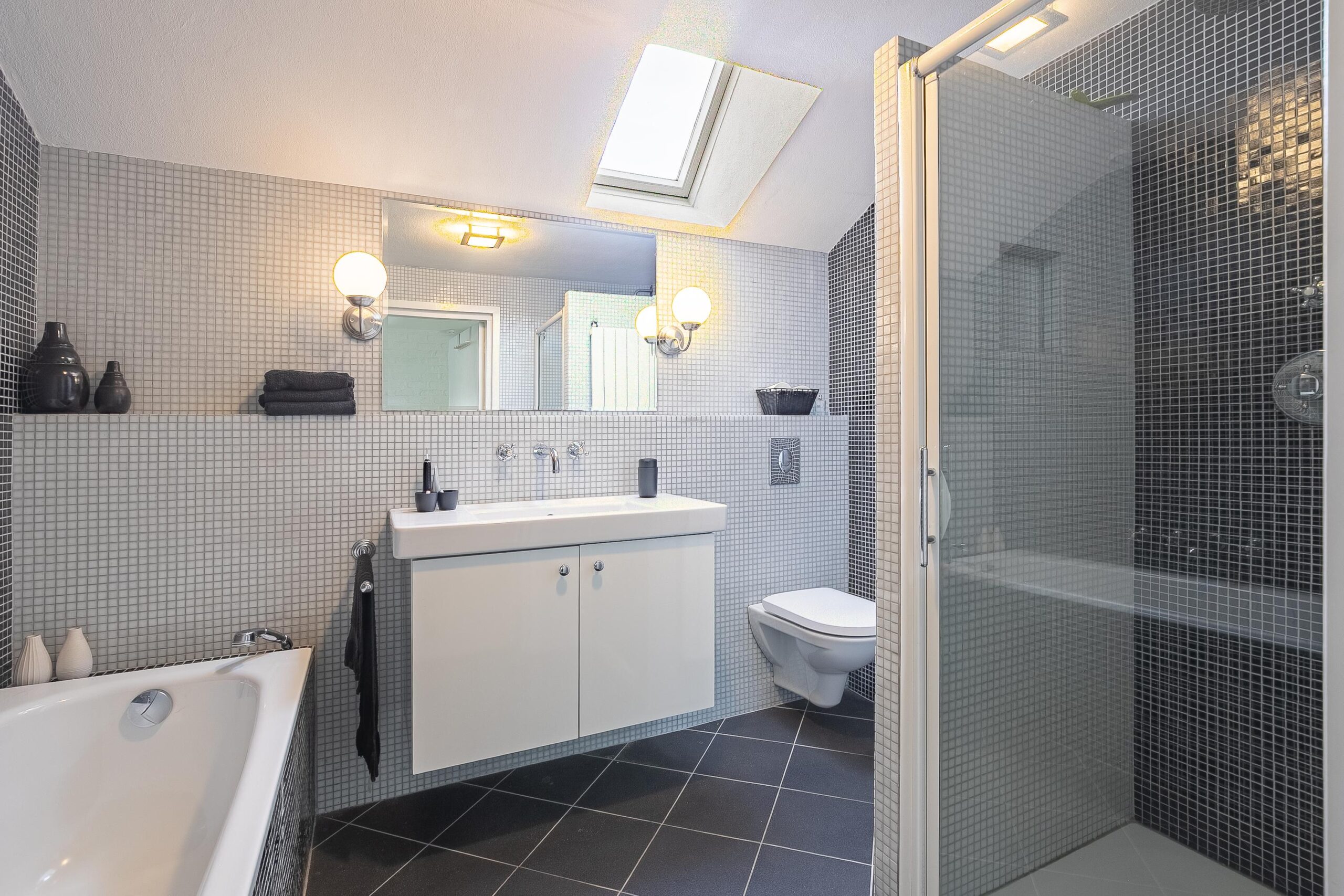 Via de trap in de woonkamer bereikt u de overloop op de eerste verdieping, met toegang tot vier slaapkamers en de badkamer. De badkamer (ca. 6m²) is compleet ingericht met een ligbad, wastafelmeubel, douche en een dakraam met rolgordijn, waardoor er prettig daglicht binnenvalt. Alle slaapkamers (ca. 12m², 11m², 11m² en 8m²) zijn voorzien van een net afgewerkte laminaatvloer en bieden een comfortabele basis voor slapen, werken of spelen.