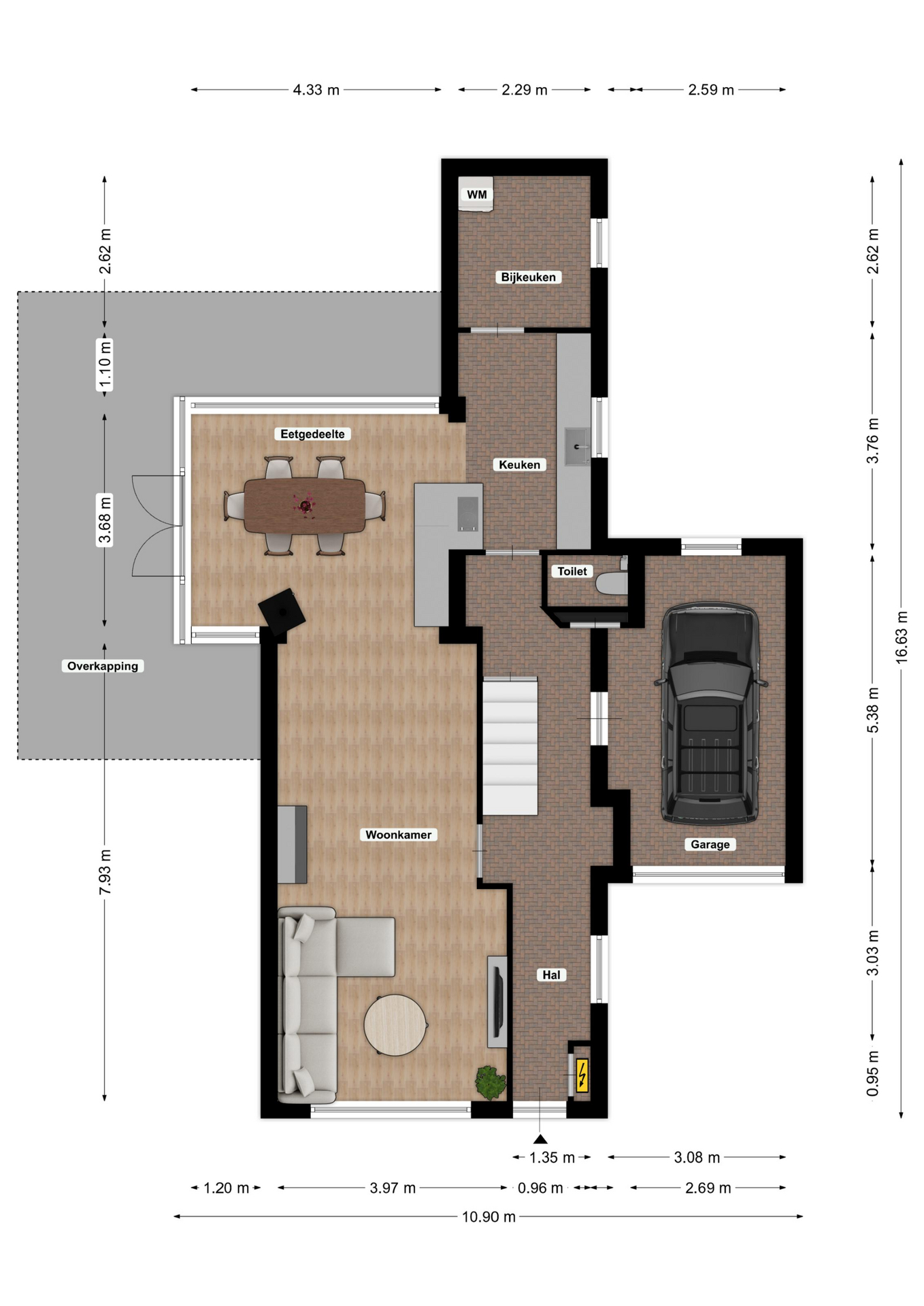 Aansluitend bevindt zich de praktische bijkeuken met aansluitingen voor wasapparatuur. Vanuit de hal is de inpandige, verwarmde garage bereikbaar.