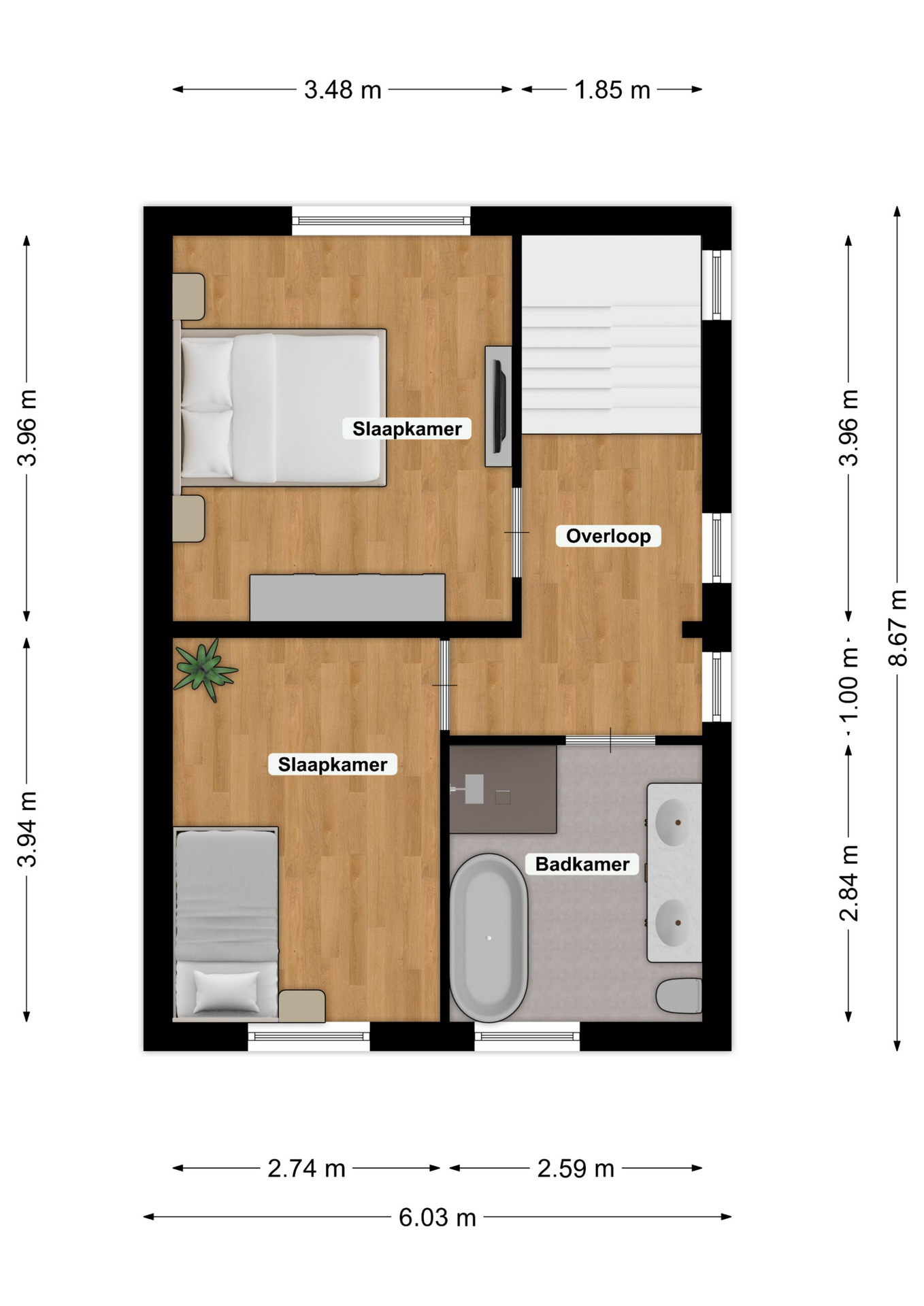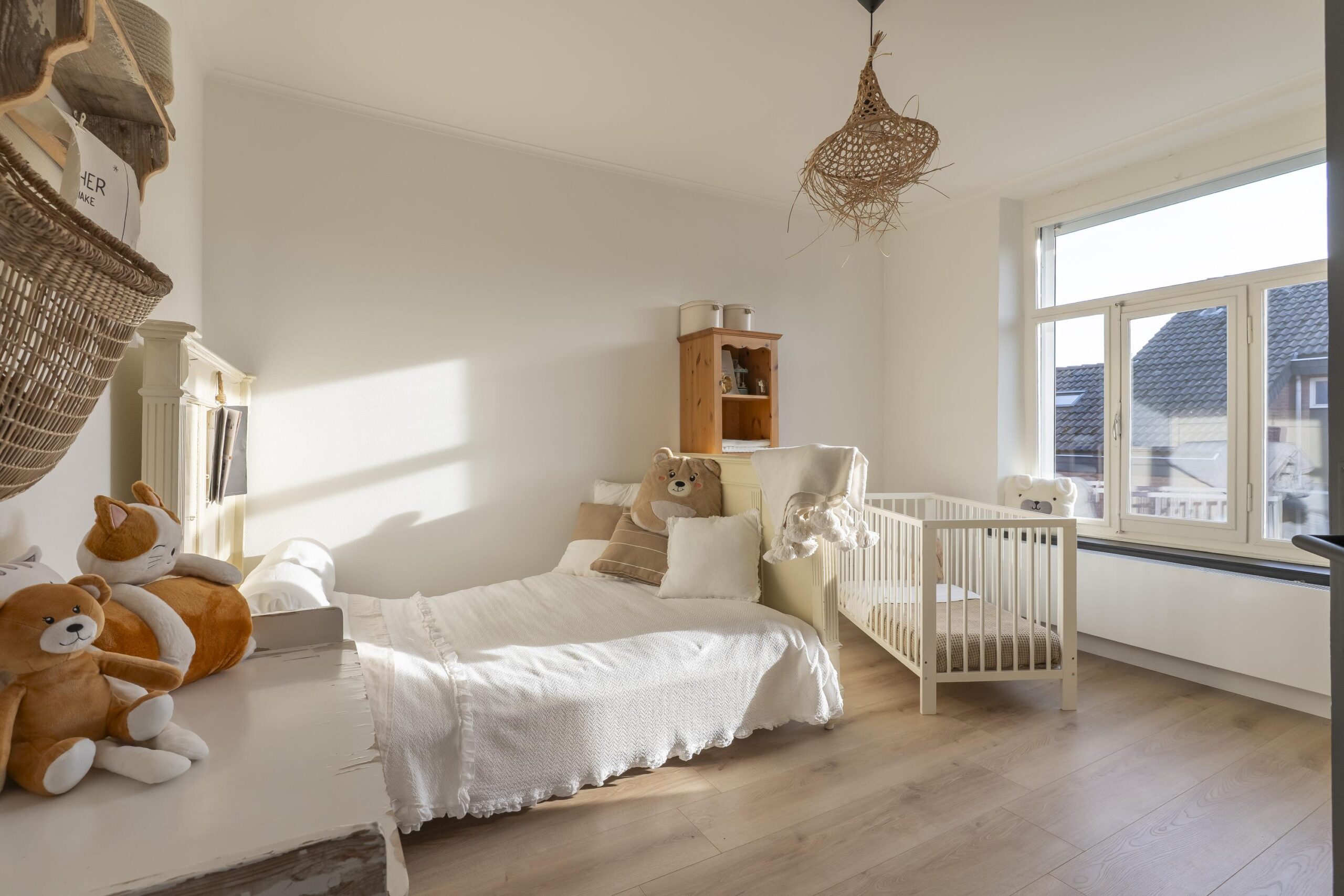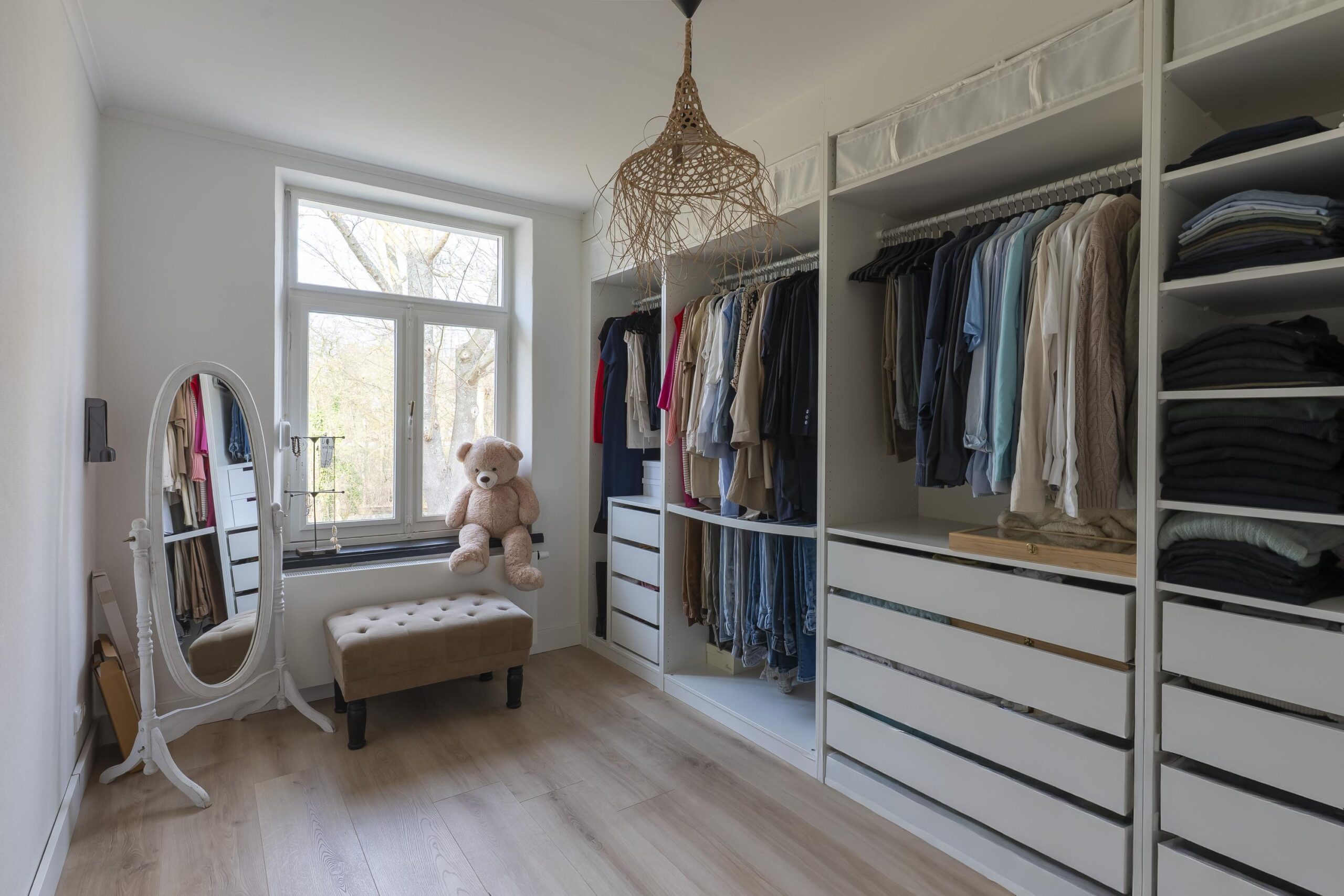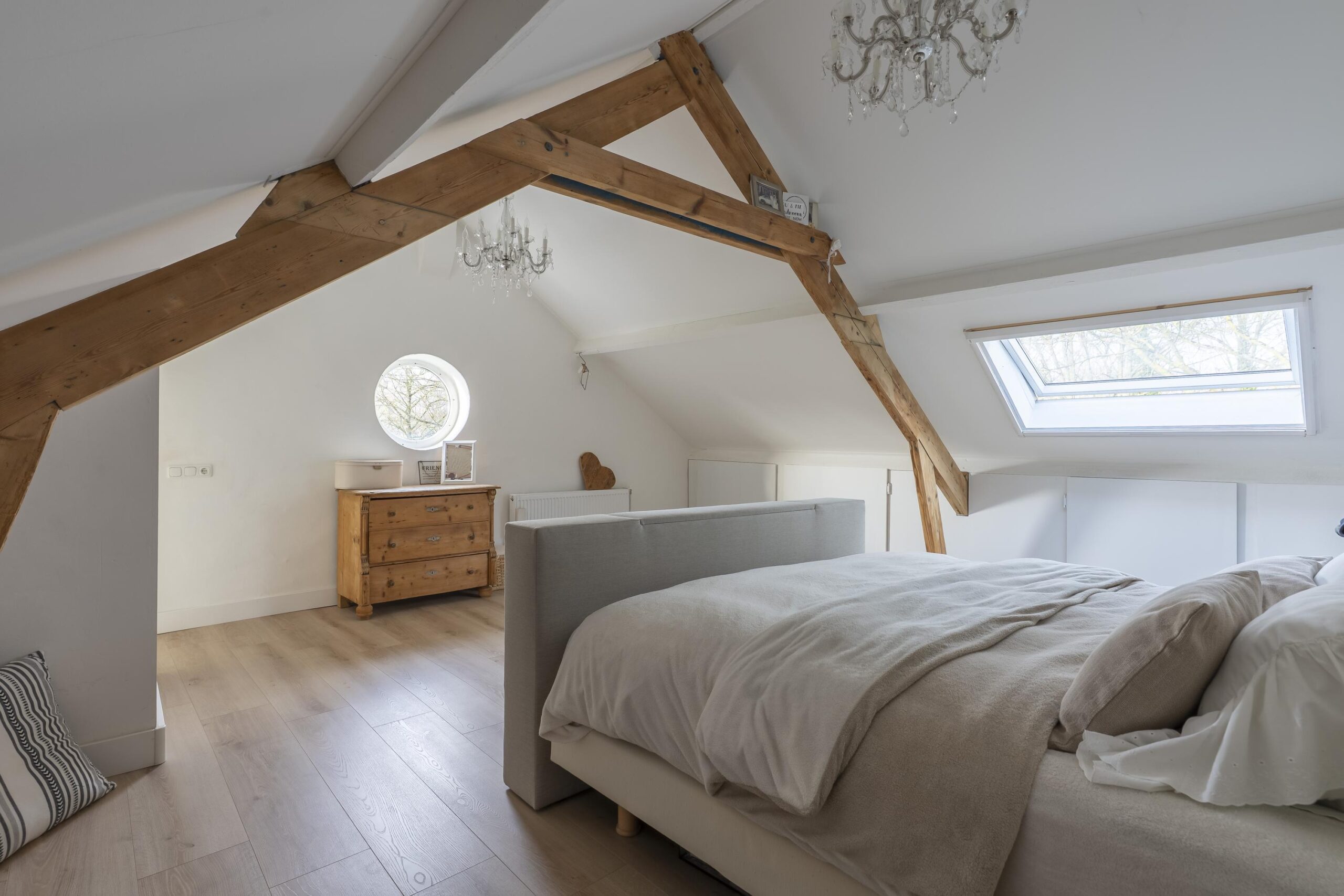 Via een bordestrap komt men op de ruime overloop met toegang tot twee goed afgewerkte slaapkamers, waarvan één momenteel is ingericht als walk-in closet. De slaapkamers zijn respectievelijk: