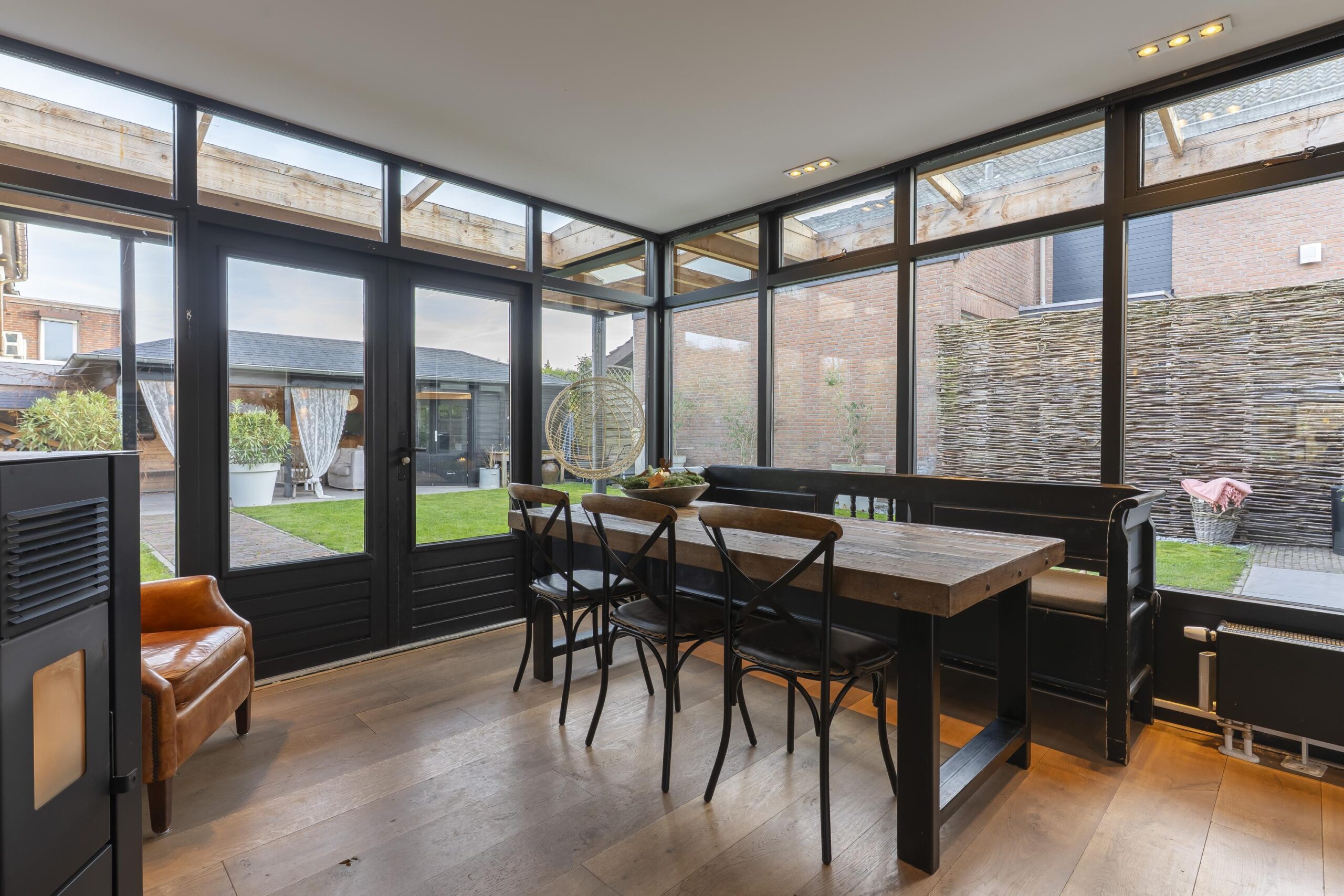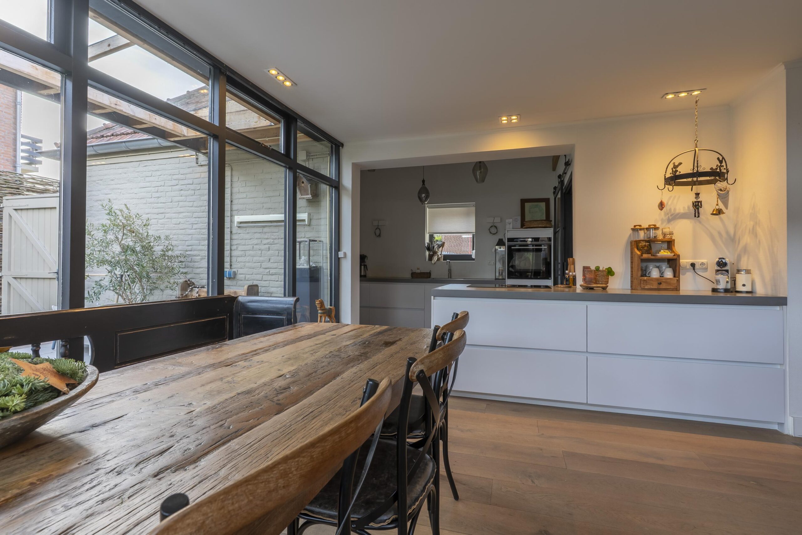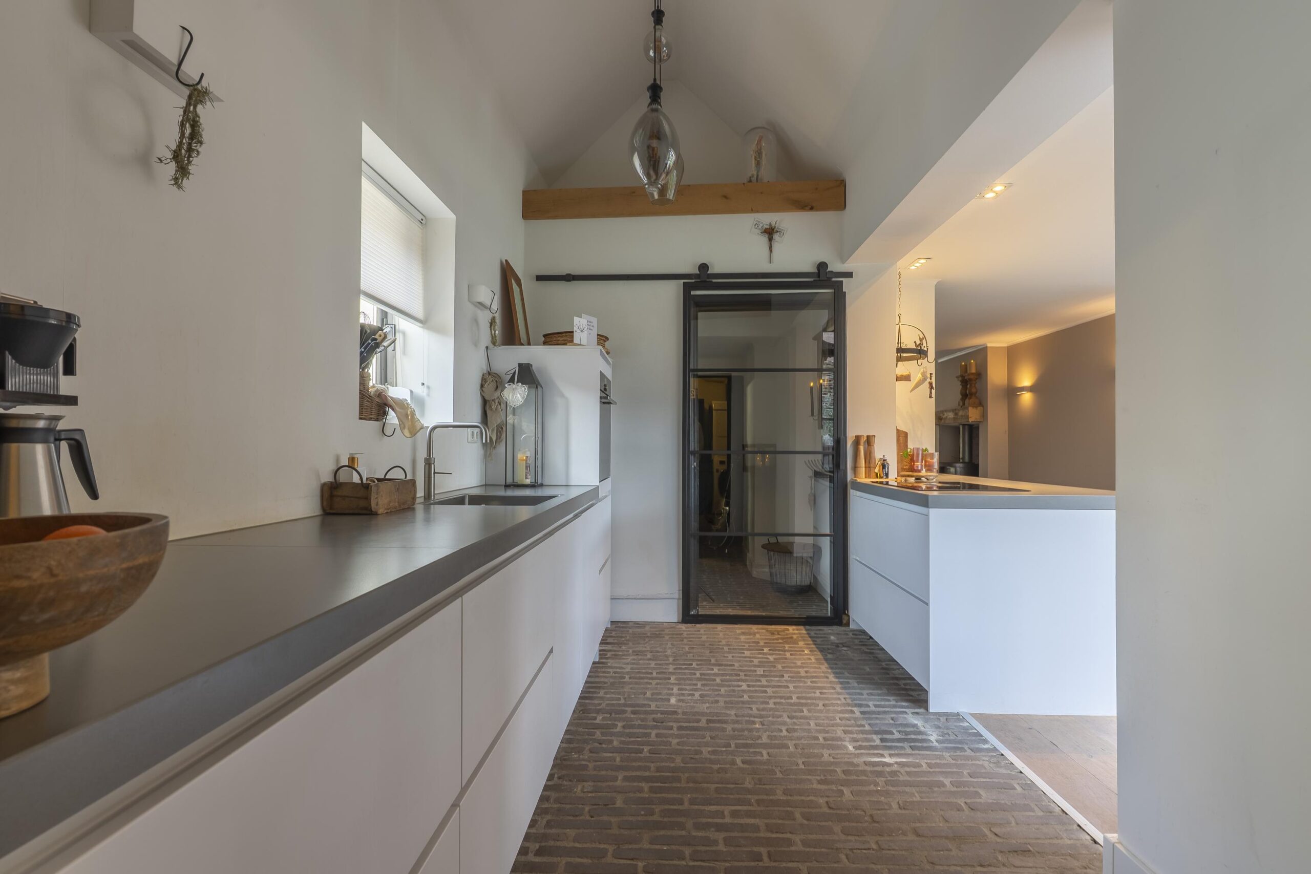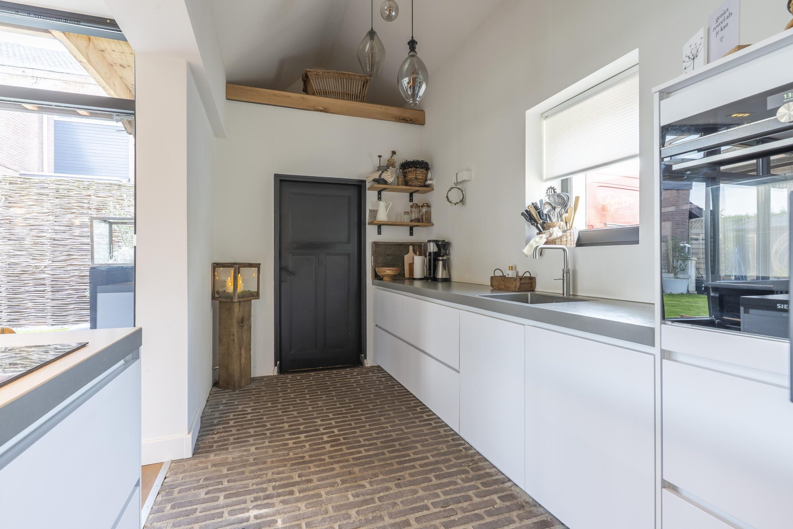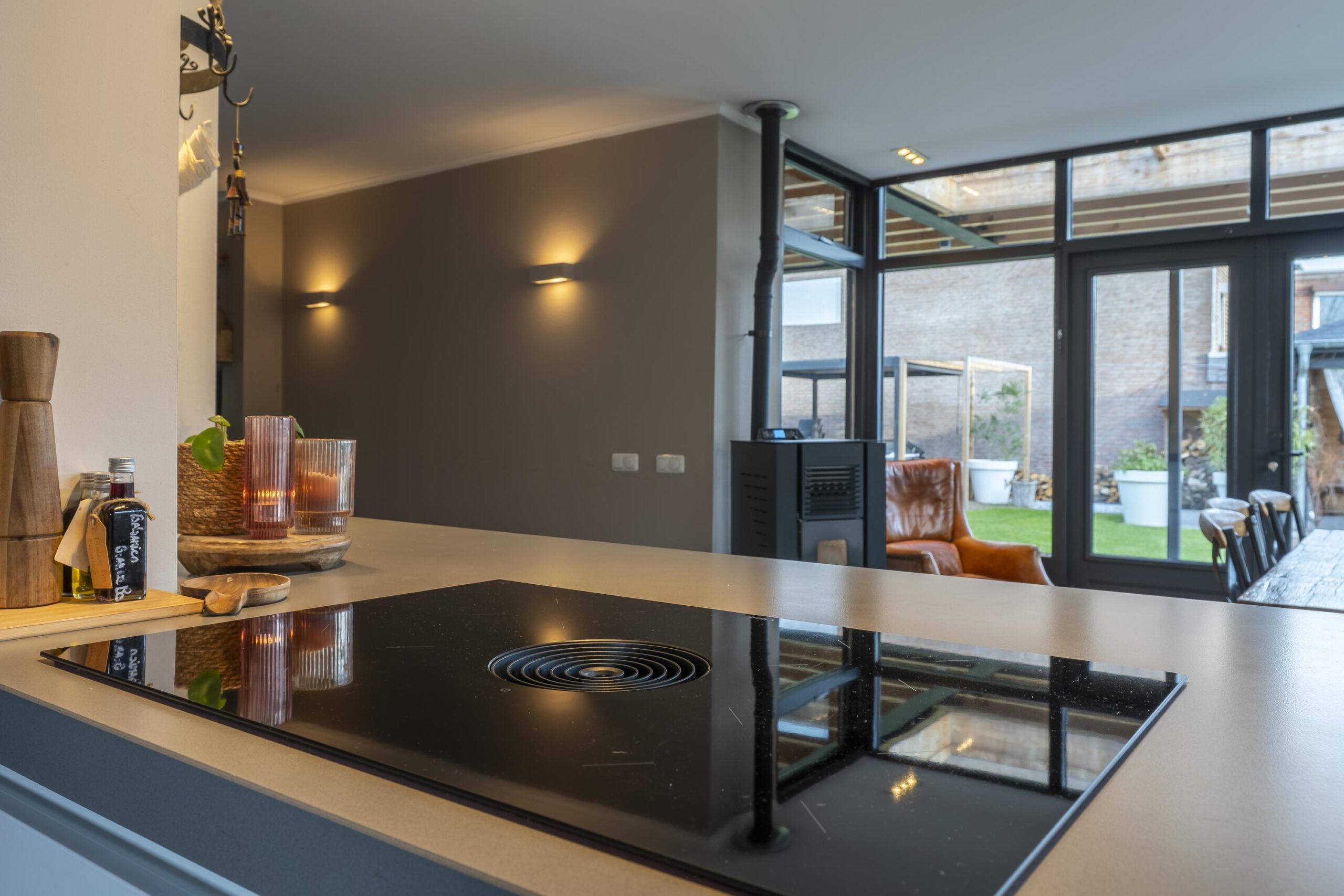 De open leefkeuken vormt een harmonieus geheel met de woonkamer en biedt uitstekend tuincontact/lichtinval. De moderne, greeploze keuken met hoog plafond en kookeiland is uitgerust met hoogwaardige apparatuur, waaronder: inductiekookplaat met geïntegreerde Bora-afzuiging, Siemens oven, Quooker, vaatwasser en spoelbak. De leefkeuken wordt bijgewarmd met een fraaie vrijstaande pelletkachel.