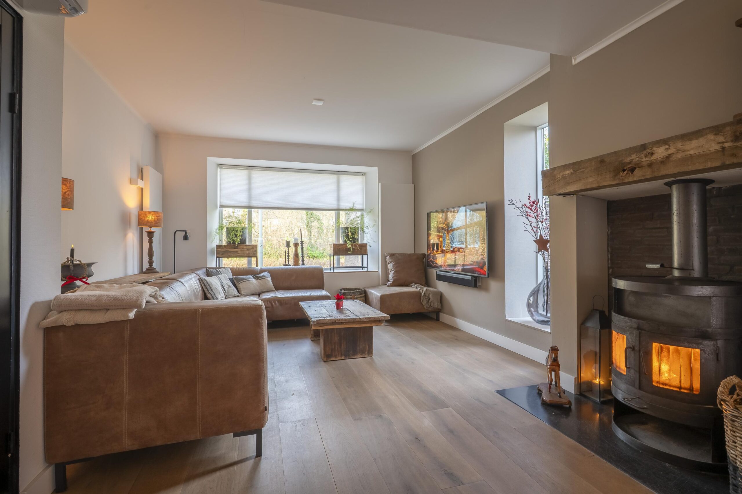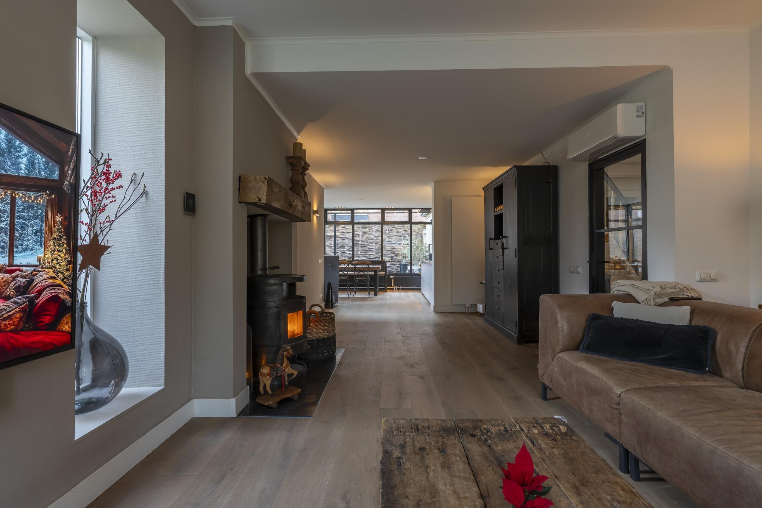 Via een glazen toegangsdeur bereikt men de sfeervolle living. Deze ruimte kenmerkt zich door veel lichtinval, een massief houten plankenvloer en een fraaie schouwpartij met vrijstaande gietijzeren houtkachel. Daarnaast is de living voorzien van airconditioning en een massief houten plankenvloer.