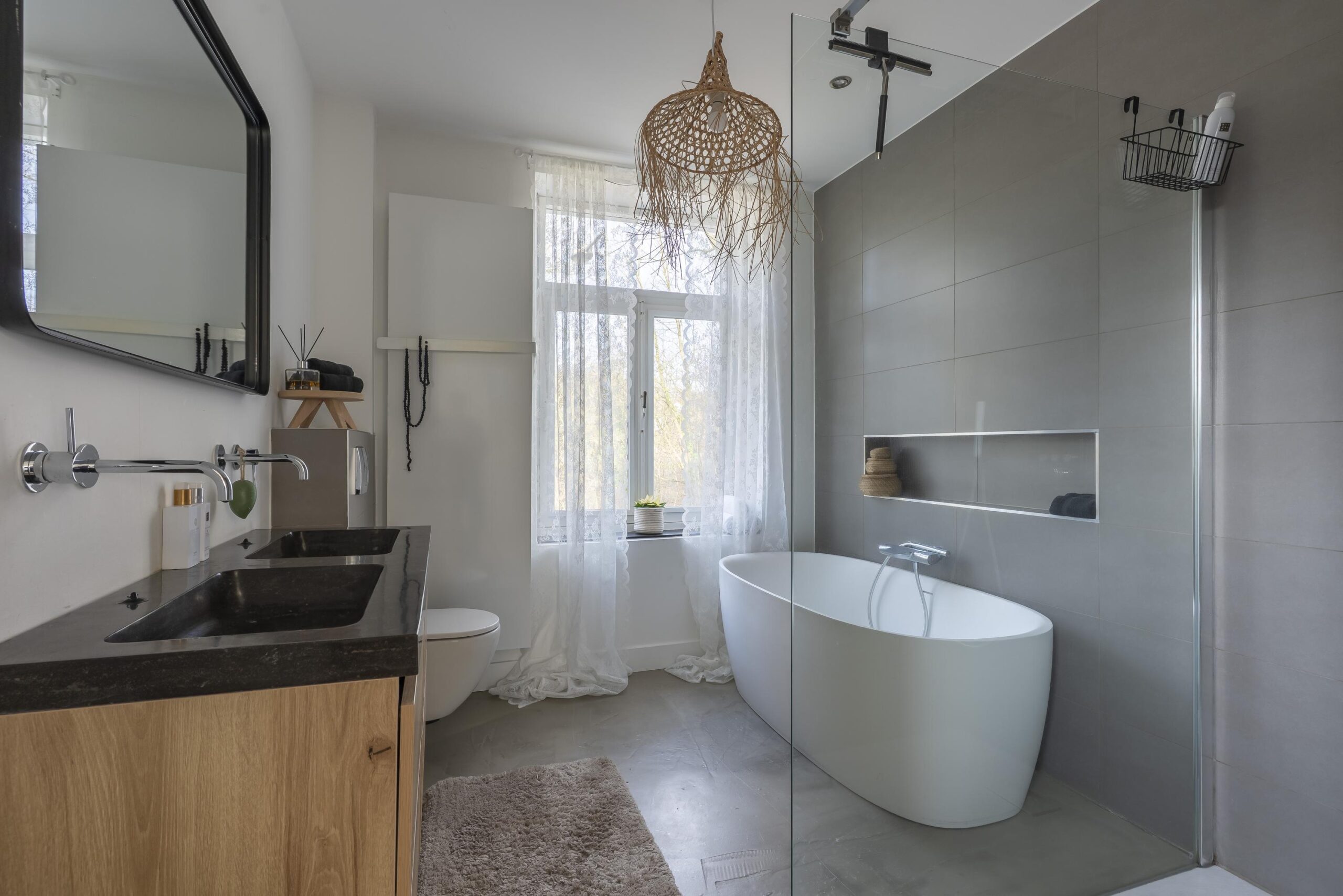 - Badkamervoorzieningen Ligbad, toilet, dubbele wastafel, wastafelmeubel, inloopdouche