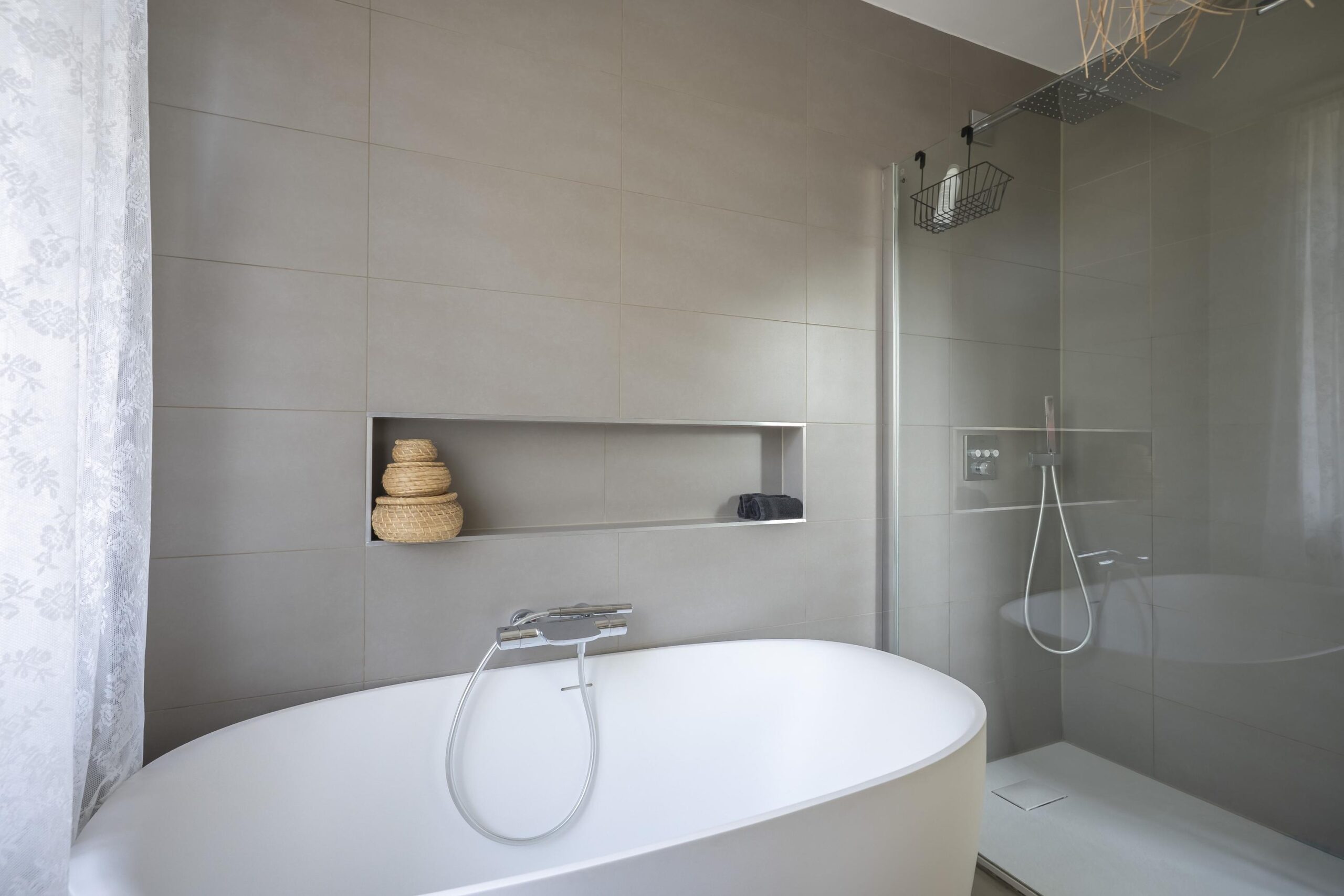 De luxe, volledig betegelde badkamer is bereikbaar via stijlvolle loftdeuren en is voorzien van: kunststof vrijstaand ligbad, inloop-regendouche met ingebouwde Grohe thermostaatkraan, dubbele granieten wastafel met ingebouwde kranen, tweede vrijhangend toilet en designradiator.
