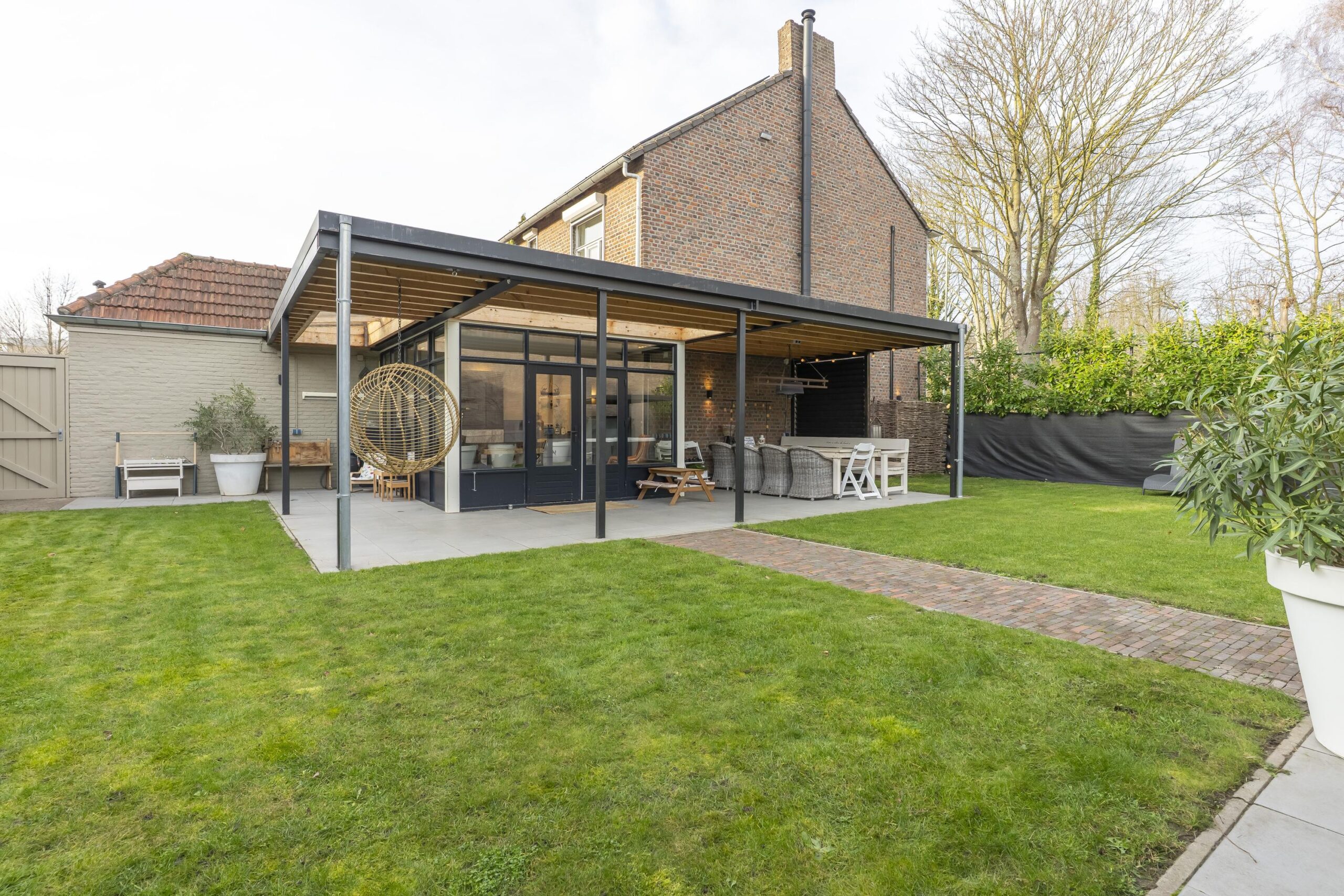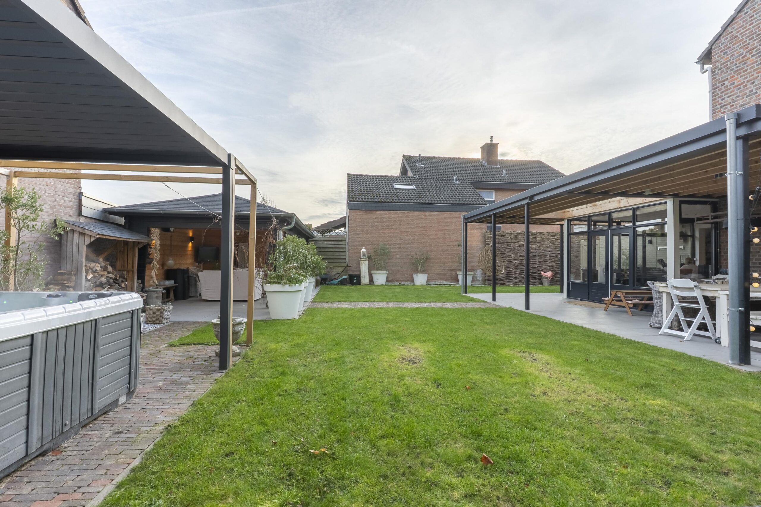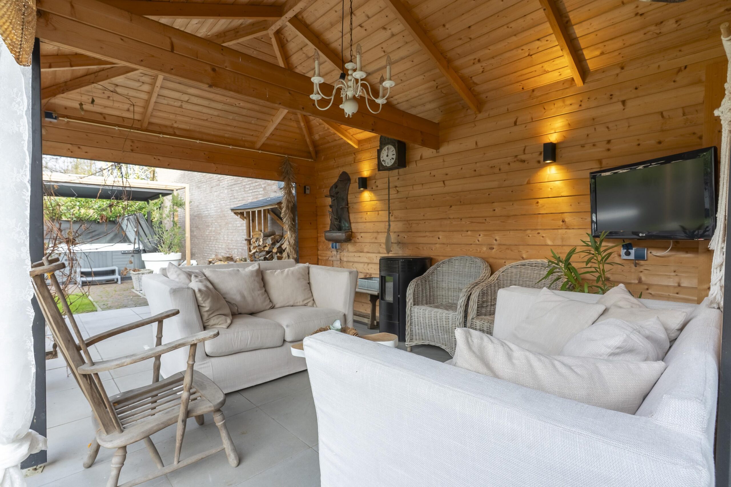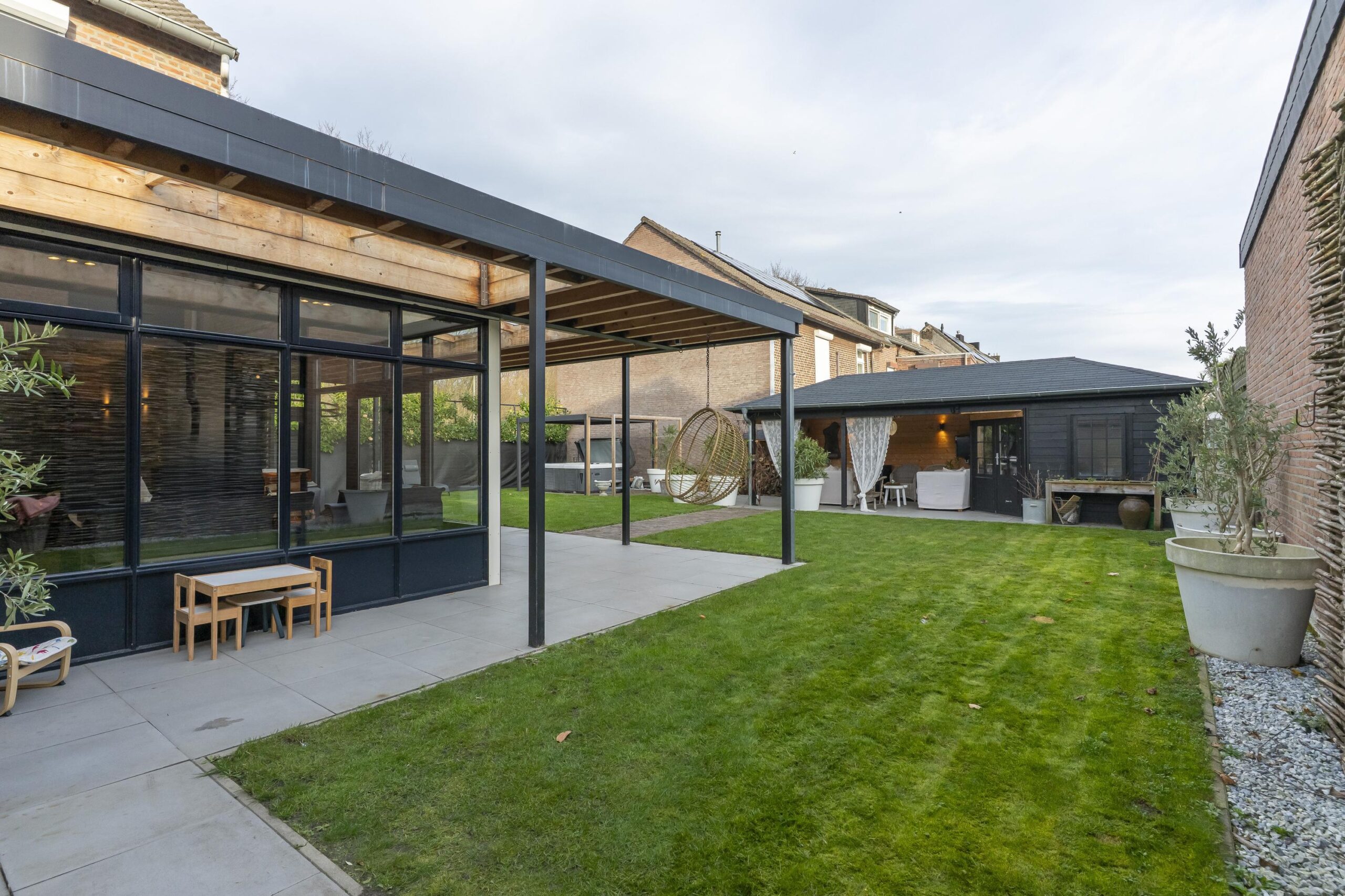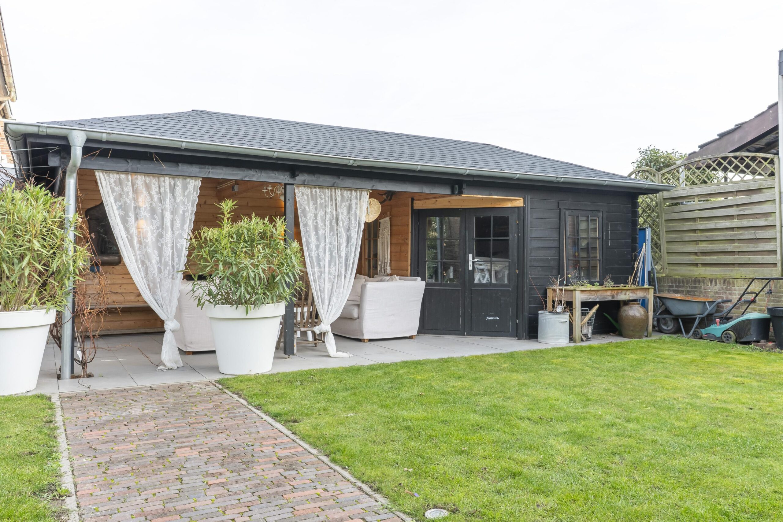 Via openslaande deuren vanuit de living, evenals via een zij-ingang, bereikt men de geheel omsloten en zonnige tuin. De tuin is fraai aangelegd en beschikt over een ruime terrasoverkapping met lichtstraten, twee prieeltjes en een royaal tuinhuis, waardoor optimaal kan worden genoten van het buitenleven.
