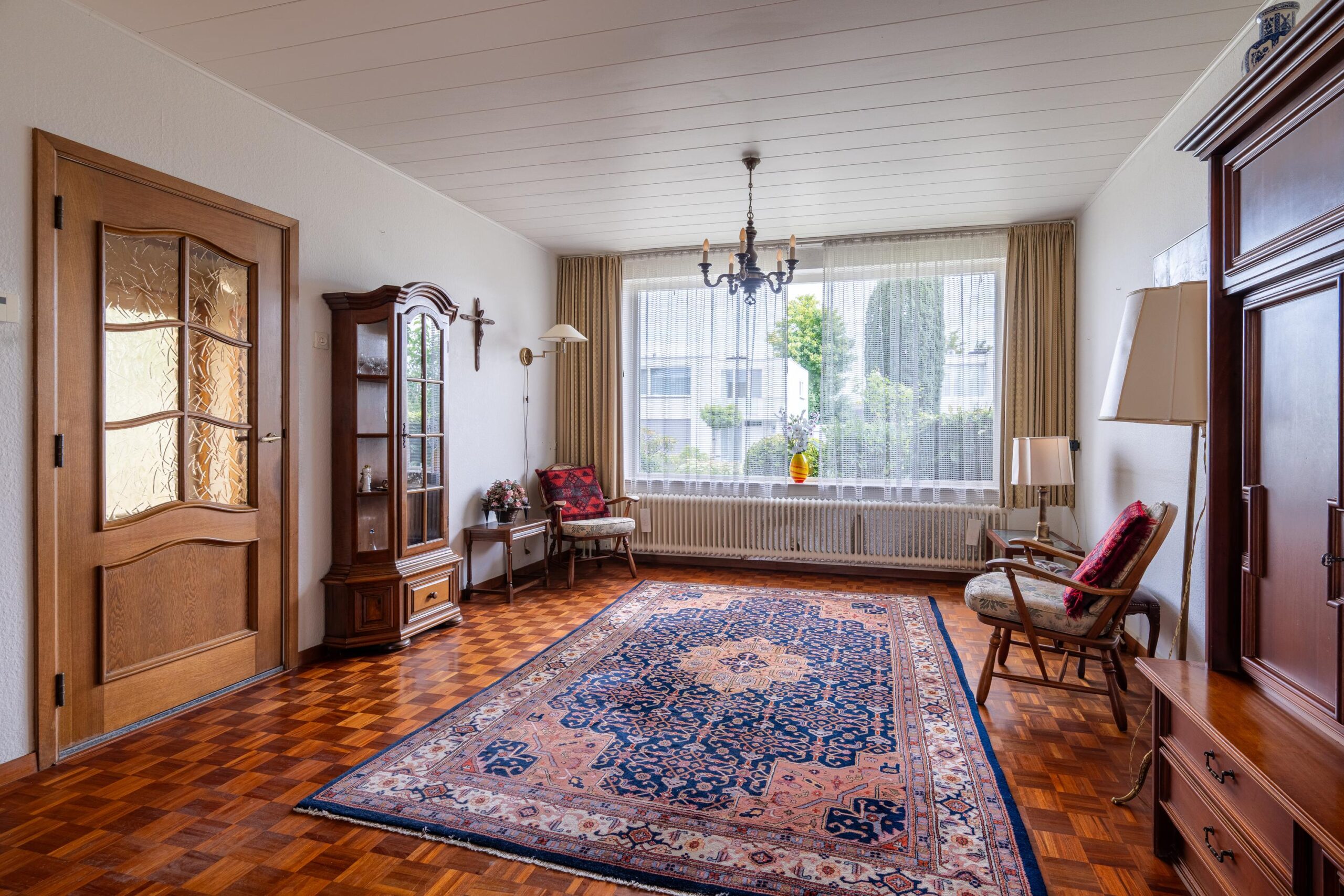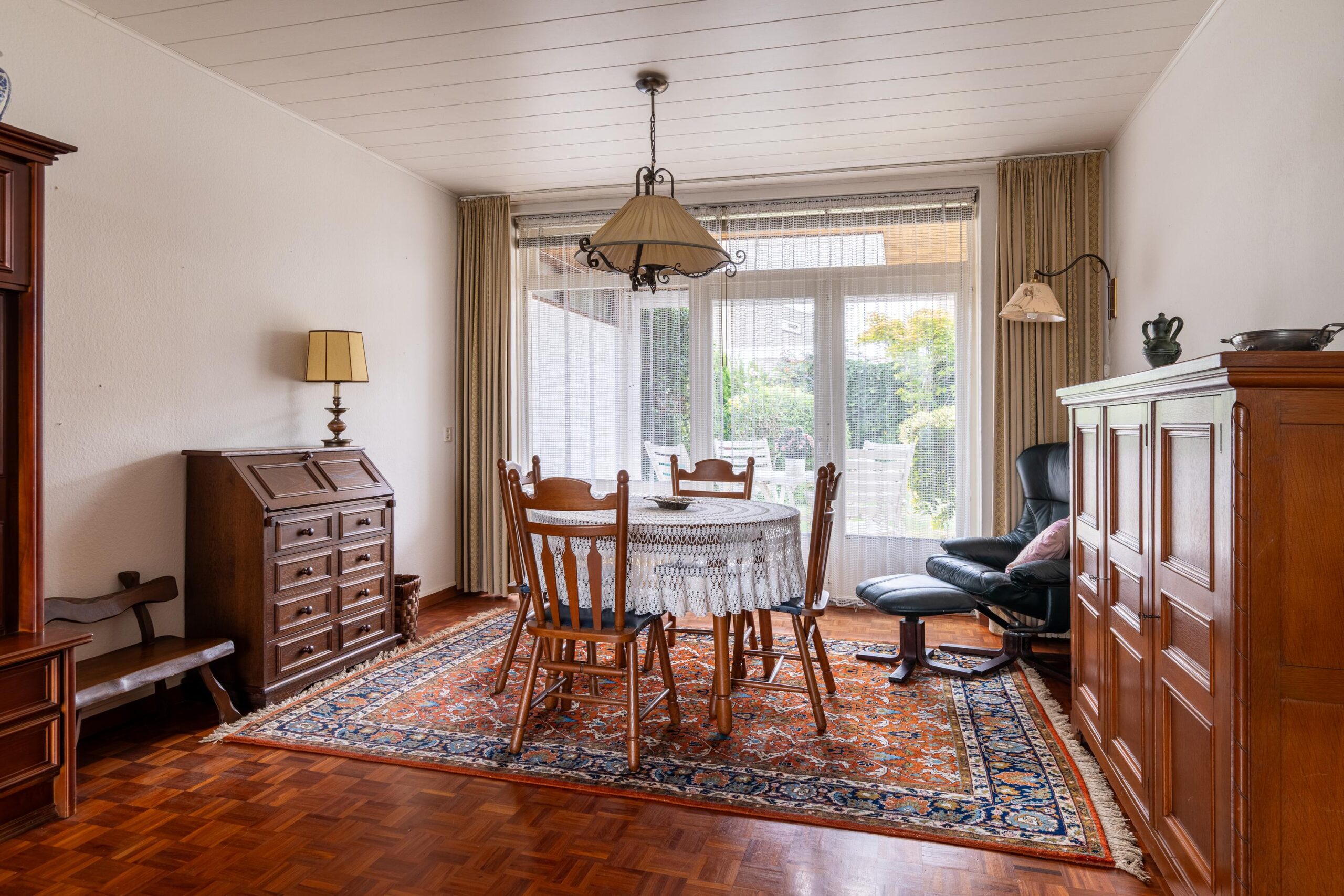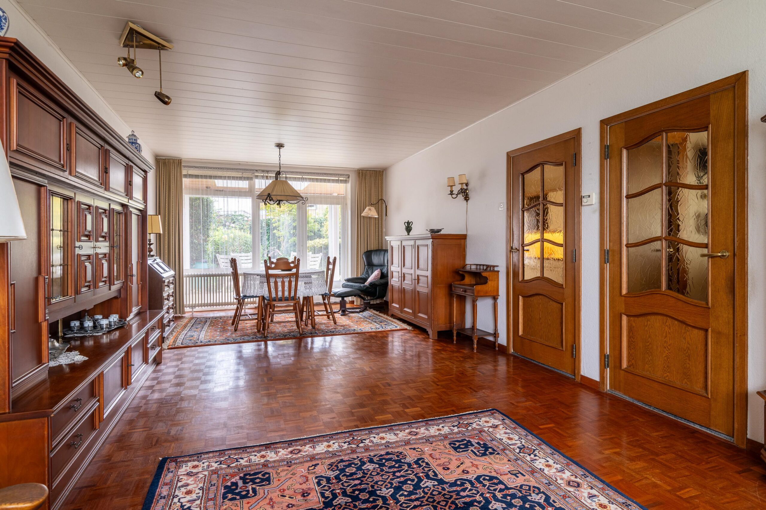 De woonkamer is ca. 34m² en voorzien van een houten blokparketvloer en biedt toegang tot de tuin.