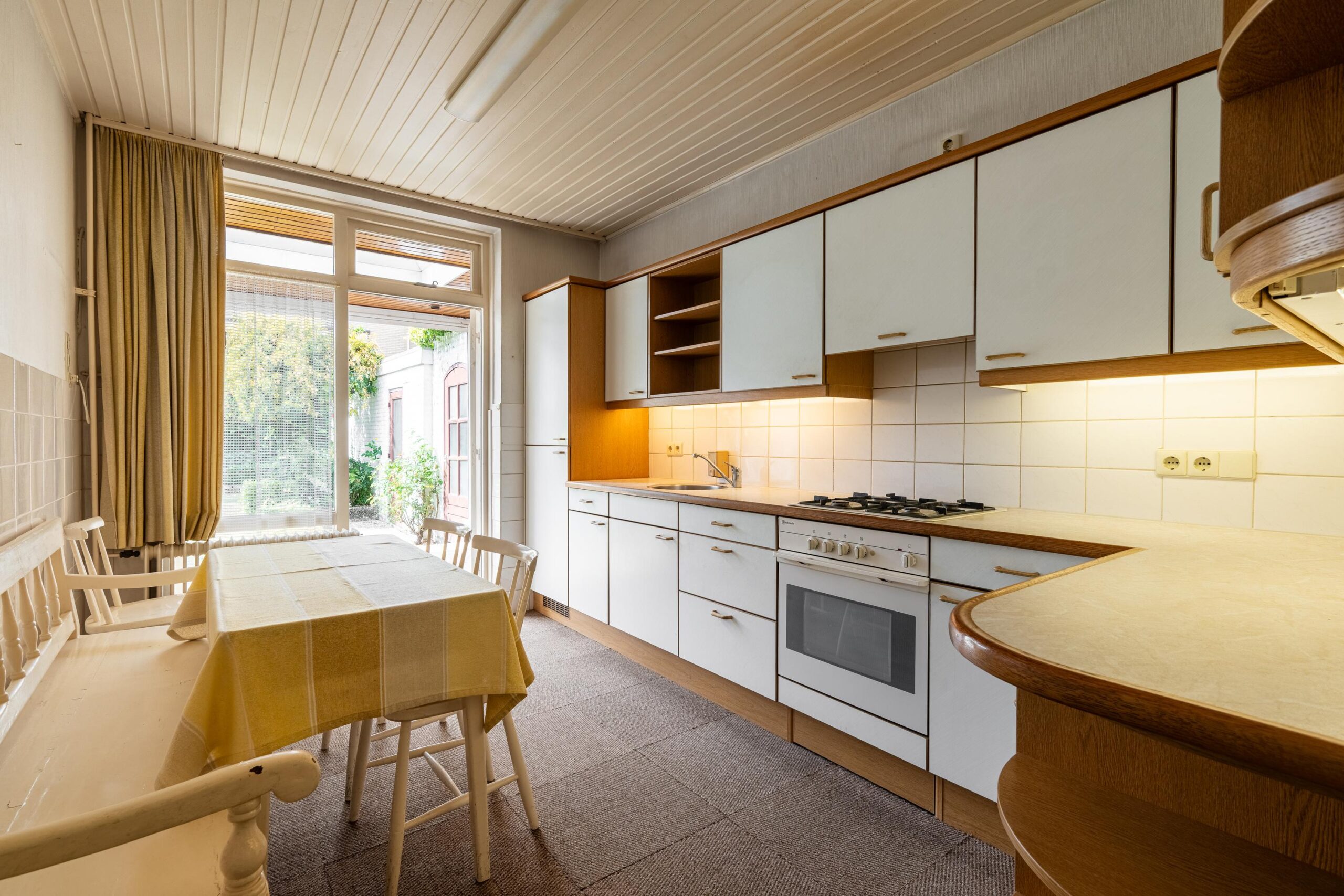 Gesloten keuken ca. 12m² met aanbouwkeuken in L- /wandopstelling met navolgende inbouwapparatuur: gaskookplaat, oven, afzuigkap en koel- /vriescombinatie. De keuken biedt eveneens toegang naar de tuin.
