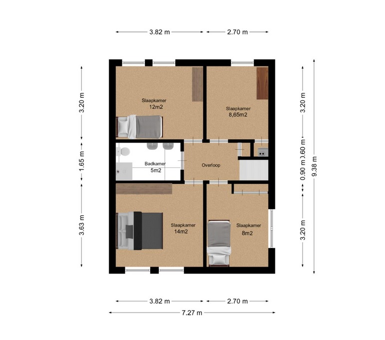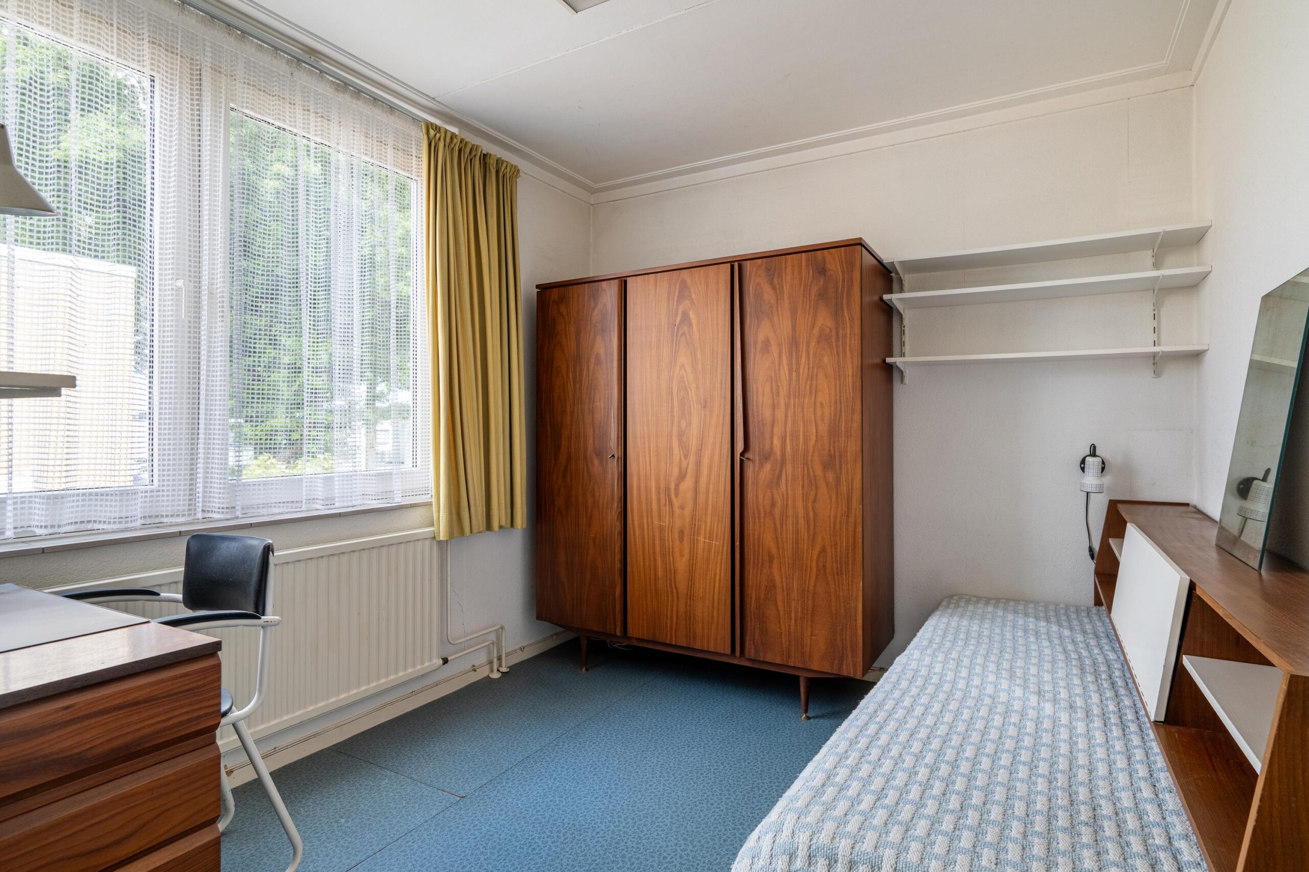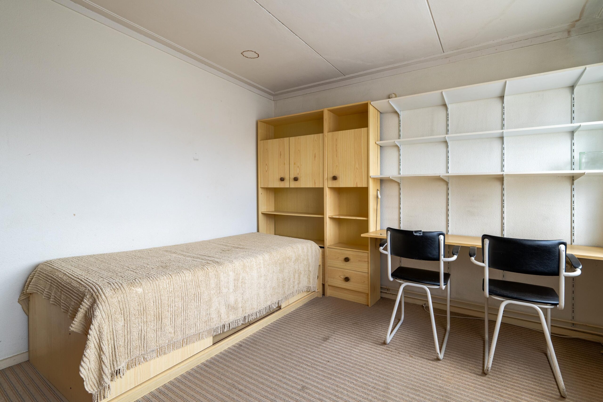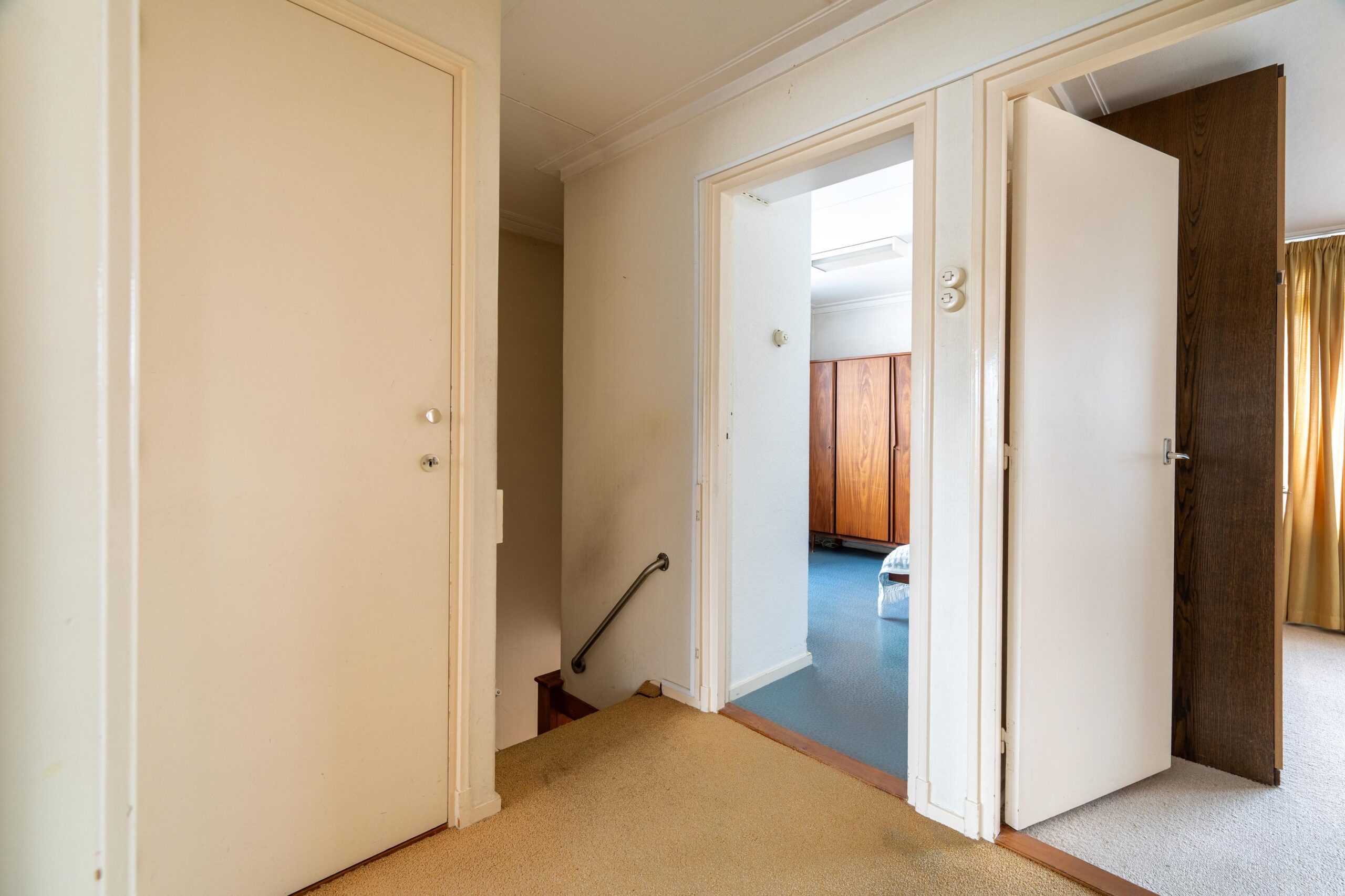 Overloop met berging en toegang naar vier slaapkamers respectievelijk 14m², 12m², 8.5m² en 8m²groot waarvan twee met muurkast. De badkamer is geheel betegeld en voorzien van een ligbad, toilet en wandmeubel met wastafel.