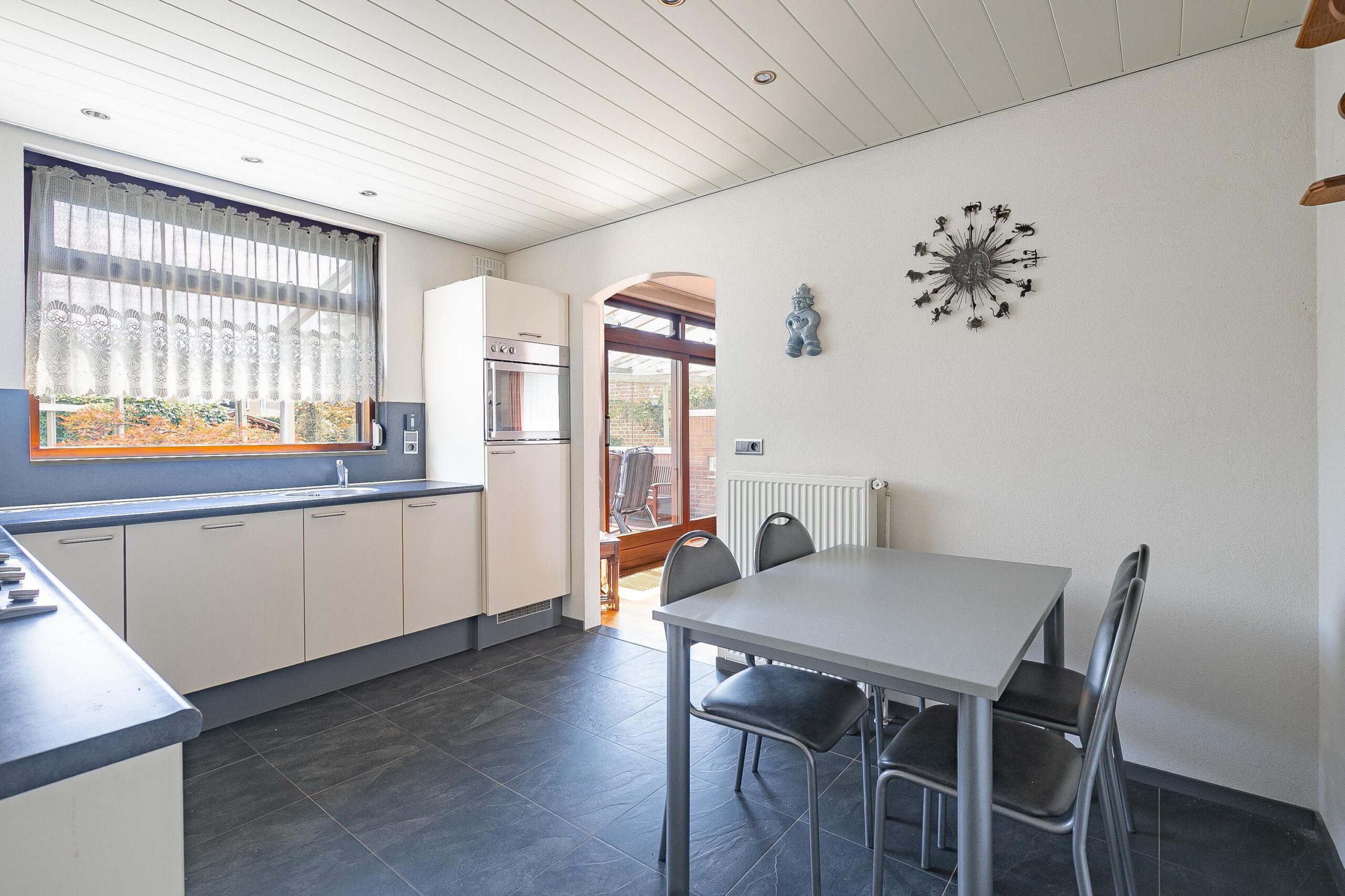 Ruime ontvangsthal met vide. De hal heeft een fijne garderobenis, meterkast en een geheel betegelde toiletruimte met toilet en fonteintje. De L-vormige woonkamer is ruim opgezet met een oppervlakte van circa. 40 m², deze is voorzien van een parketvloer en een schuifpui voor optimaal tuincontact. Er is een gesloten keuken (circa. 11,4 m²) met een hoekinstallatie voorzien van inbouwapparatuur. Ook vanuit de keuken is er fijn tuincontact. De keuken geeft toegang tot een praktische bijkeuken (circa. 5,8 m²), ook voorzien van een keukeninstallatie en hier zijn de aansluitpunten voor de wasapparatuur. De garage is inpandig bereikbaar en beschikt ook over een tegelvloer en een radiator.