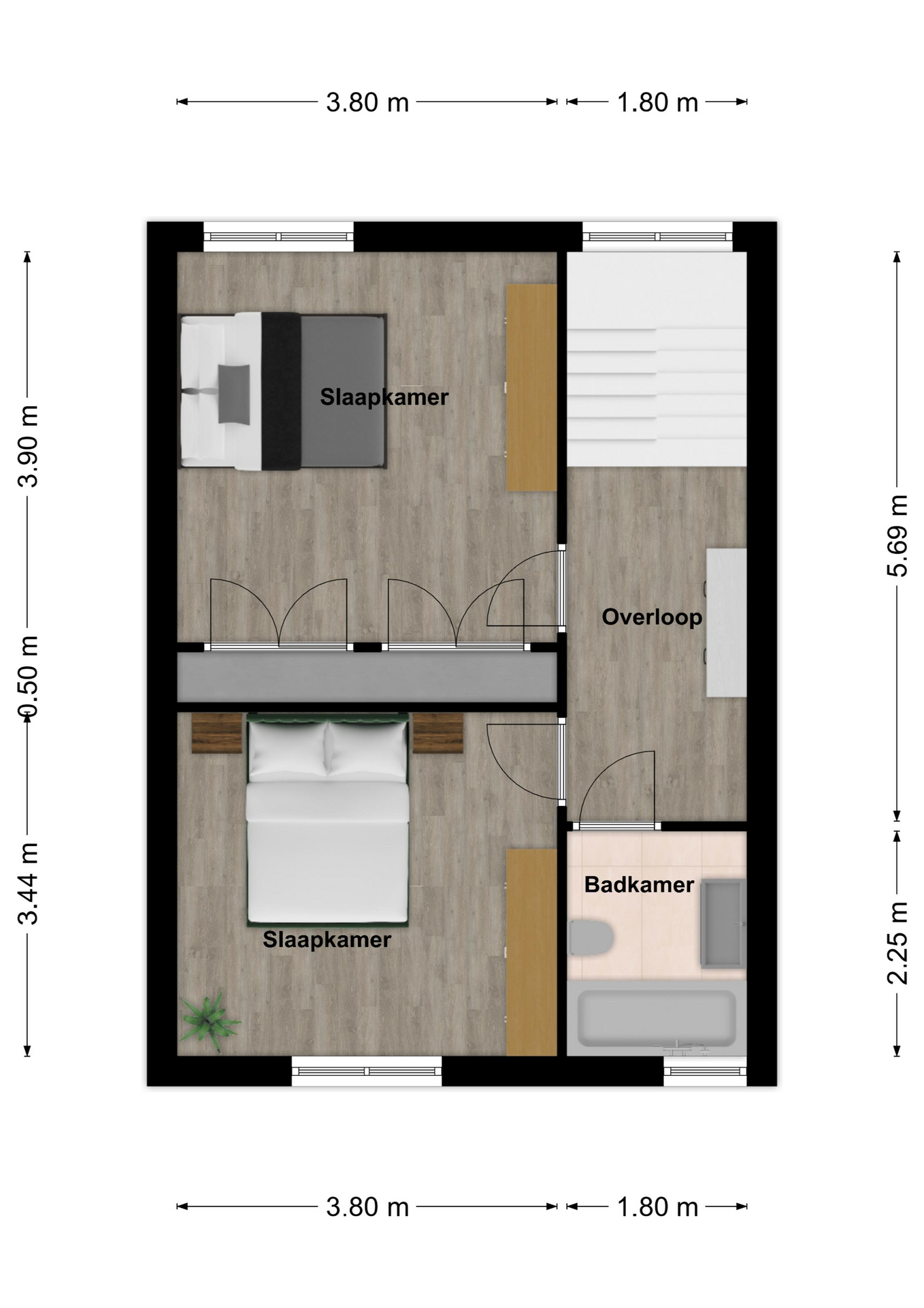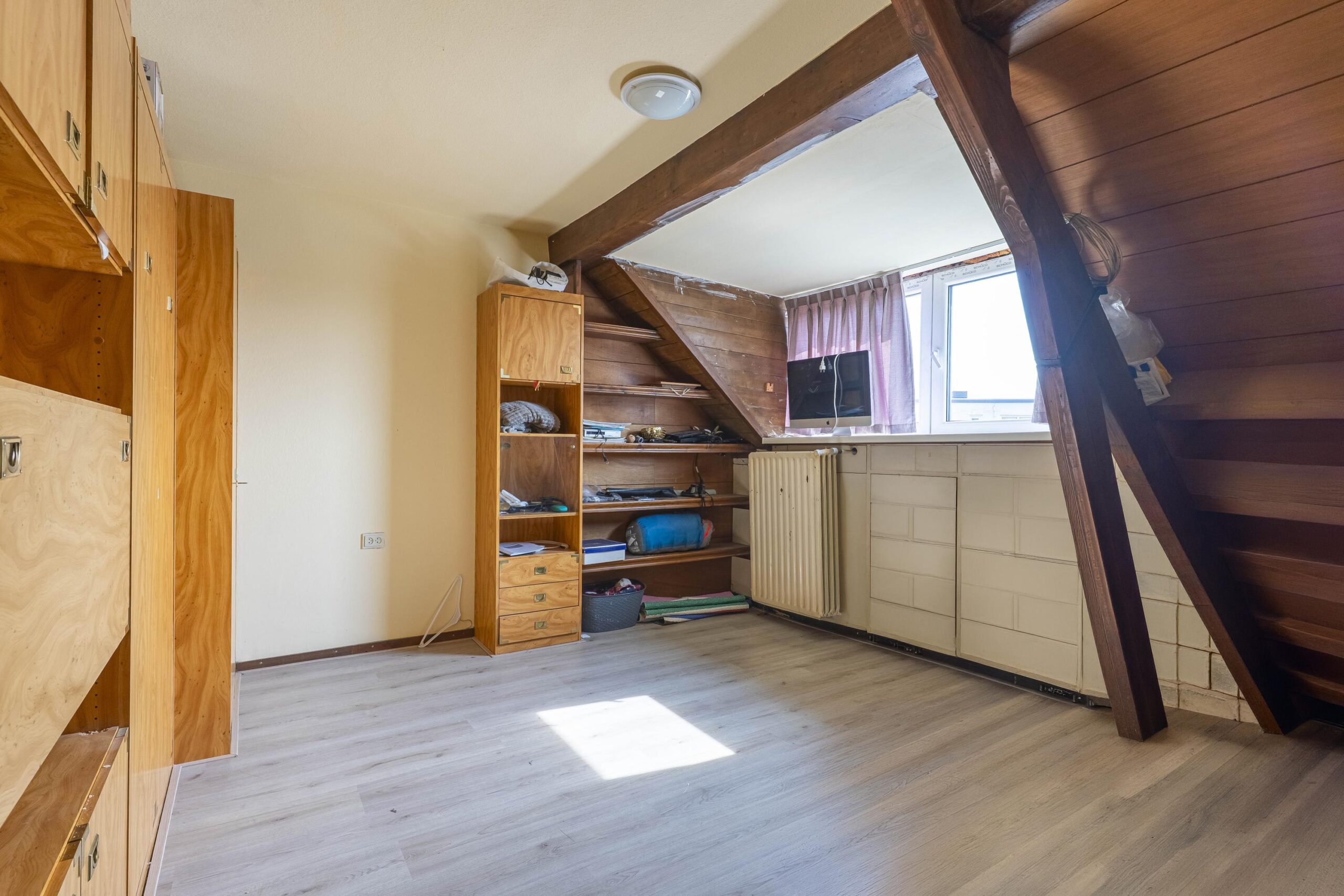 Overloop met grote inbouwkast en toegang tot twee slaapkamers. De slaapkamer aan de achterzijde is voorzien vaneen laminaatvloer en inbouwkasten. De tweede slaapkamer is aan de voorzijde gelegen en eveneens voorzien van een laminaatvloer. Daarnaast bevindt zich op deze verdieping een tweede betegelde badkamer voorzien van een ligbad, 2e toilet en badmeubel met vaste wastafel.