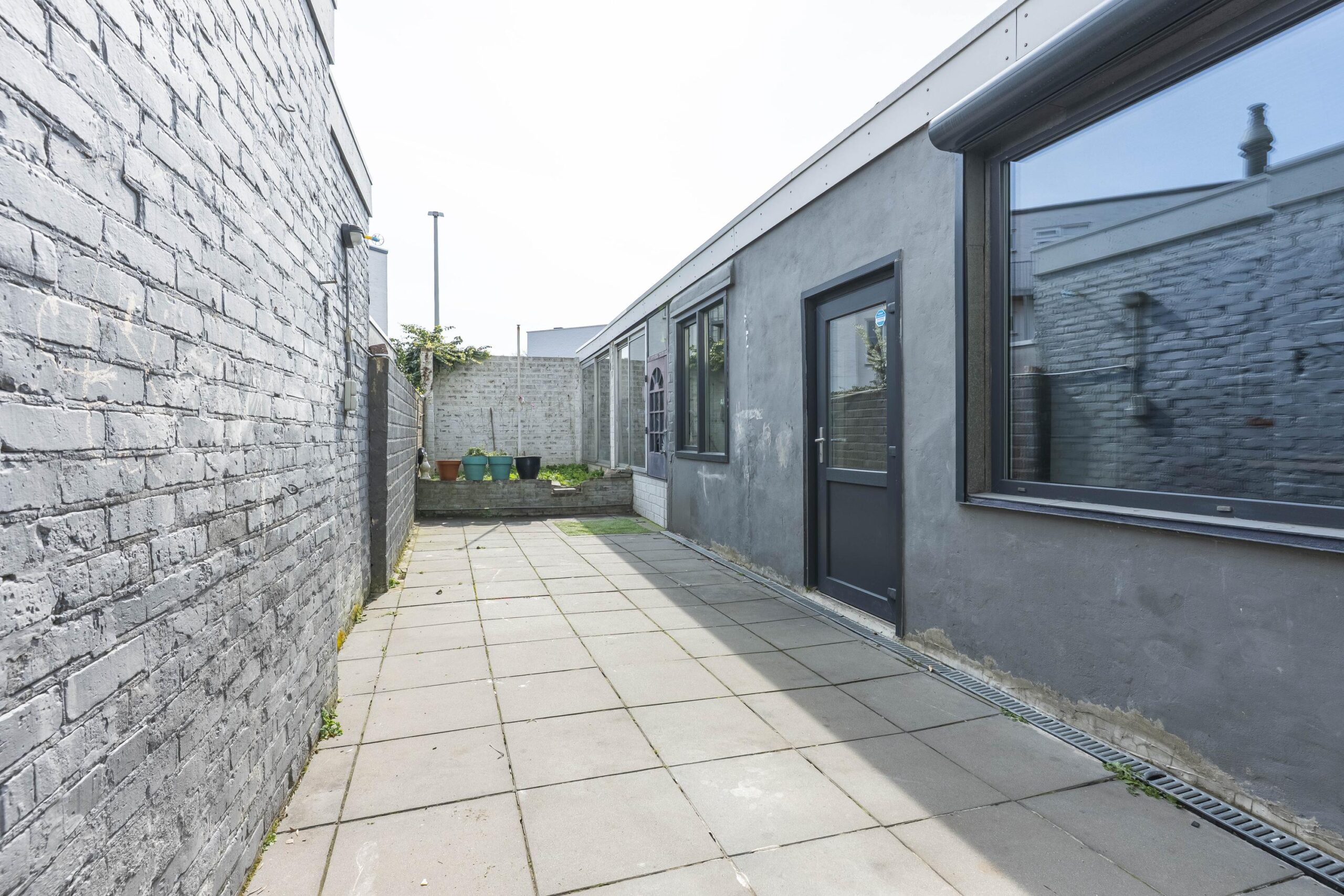 Volledig omheinde en betegelde patio tuin. Ruime berging (18 m²) met aansluiting wasapparatuur en opstelplaats van de combi Cv-installatie (Nefit/huur).