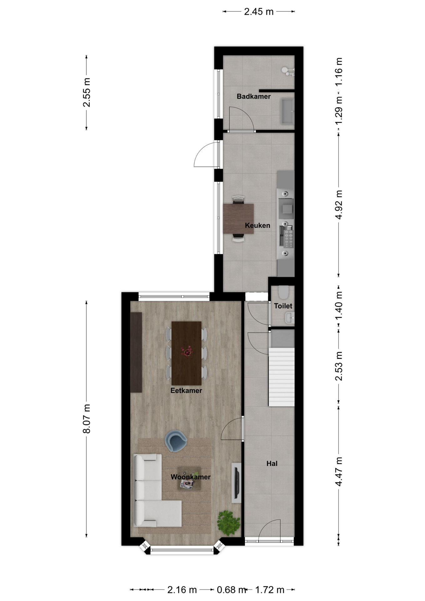 Overdekte entree. Hal met plavuizenvloer, vernieuwde meterkast met dag- en nachtstroom en betegelde toiletruimte met toilet en fontein. Ruime woonkamer voorzien van laminaatvloer. Separate keuken met de navolgende inbouwapparatuur: 6 pits gaskookplaat, oven en afzuigkap. Via de keuken toegang naar de betegelde badkamer met douche en wastafel met meubel. Via de keuken toegang tot de patio tuin.