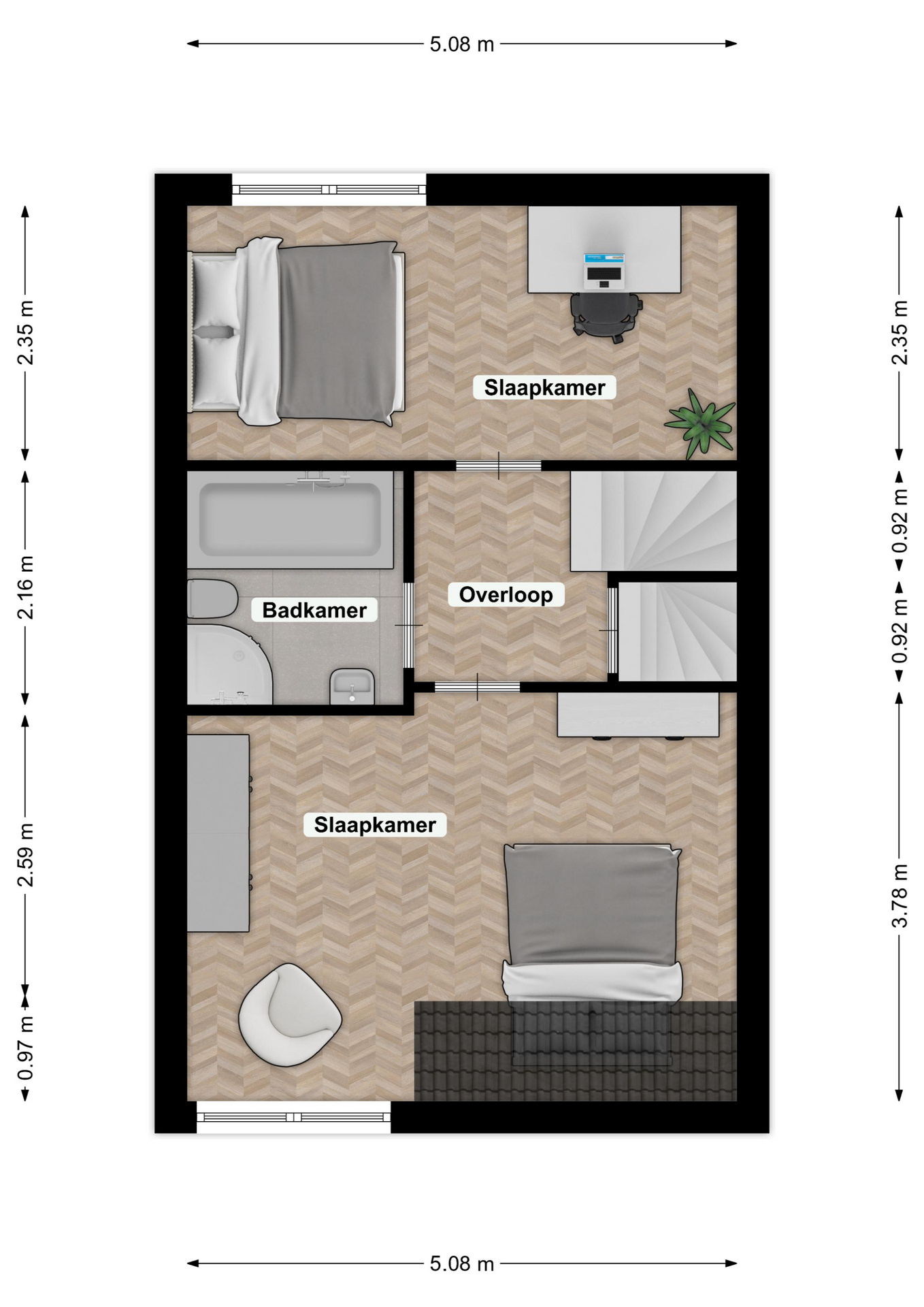 De hele verdieping (m.u.v. de badkamer) is voorzien van een doorlopende siergrindvloer.