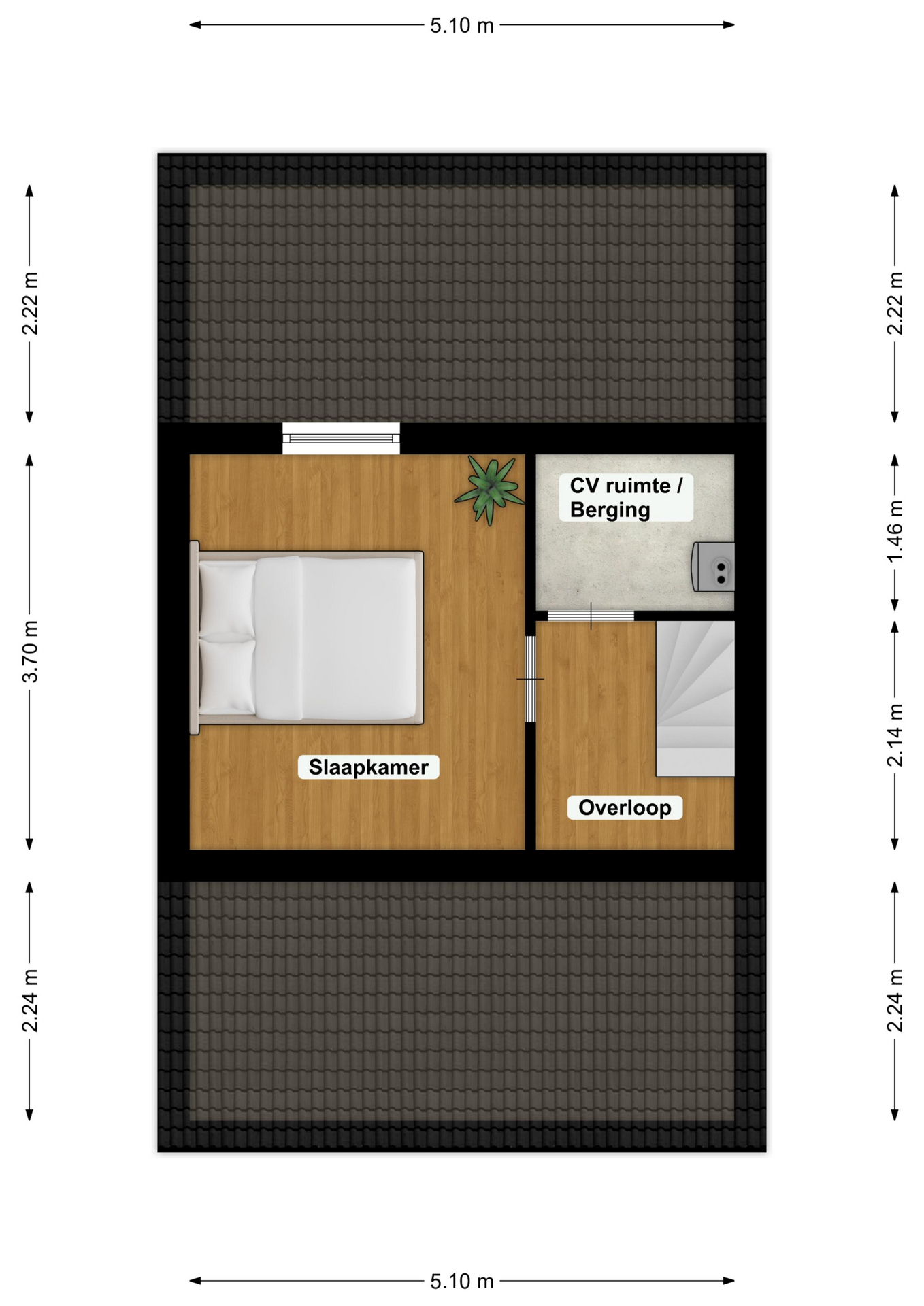Via een vaste trap bereikt u de geïsoleerde zolderverdieping, waar zich de derde ruime slaapkamer bevindt, voorzien van een Velux-dakraam. Daarnaast is er een separate cv-ruimte met de combi-hr-ketel (Nefit, huur, 2019).