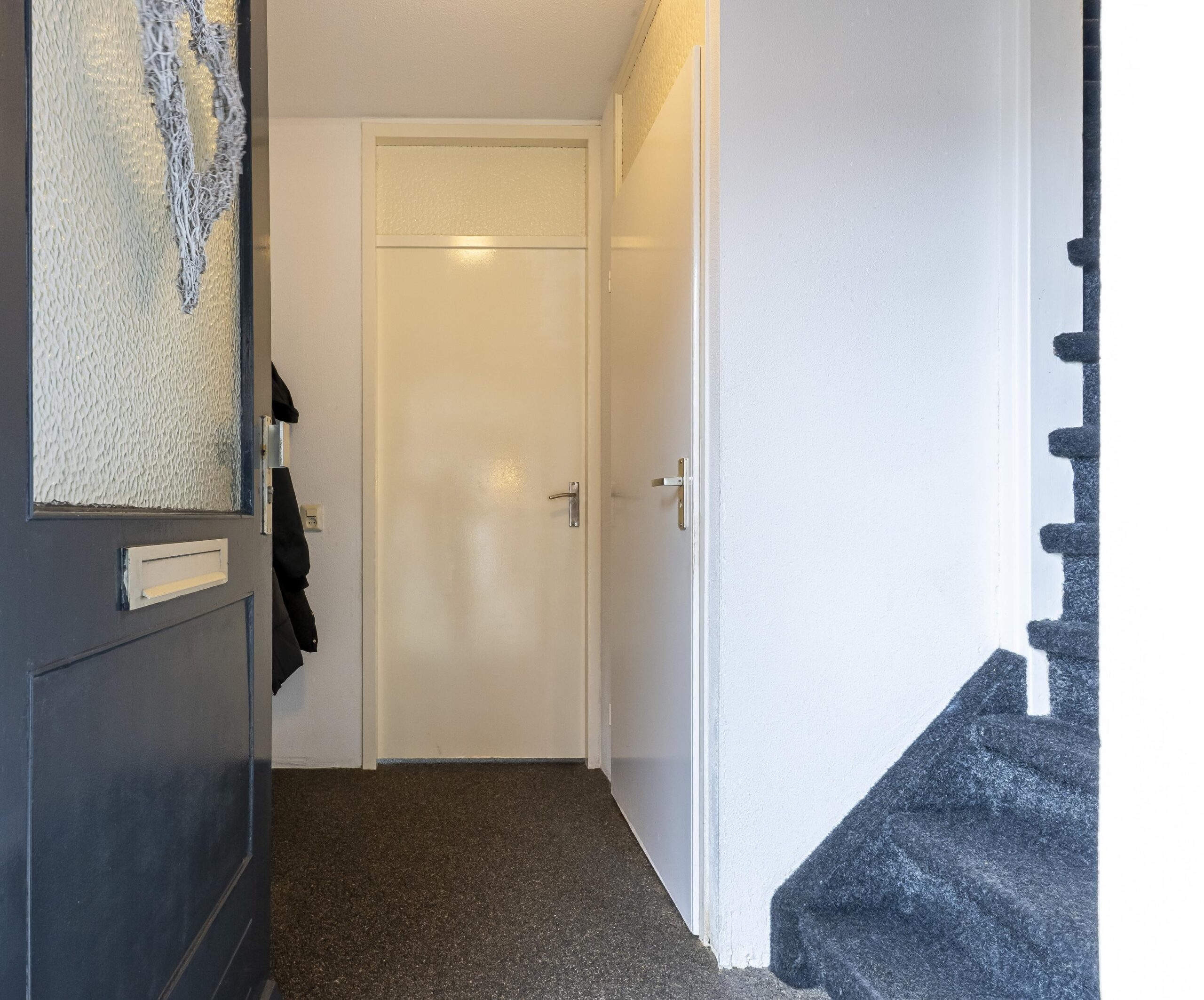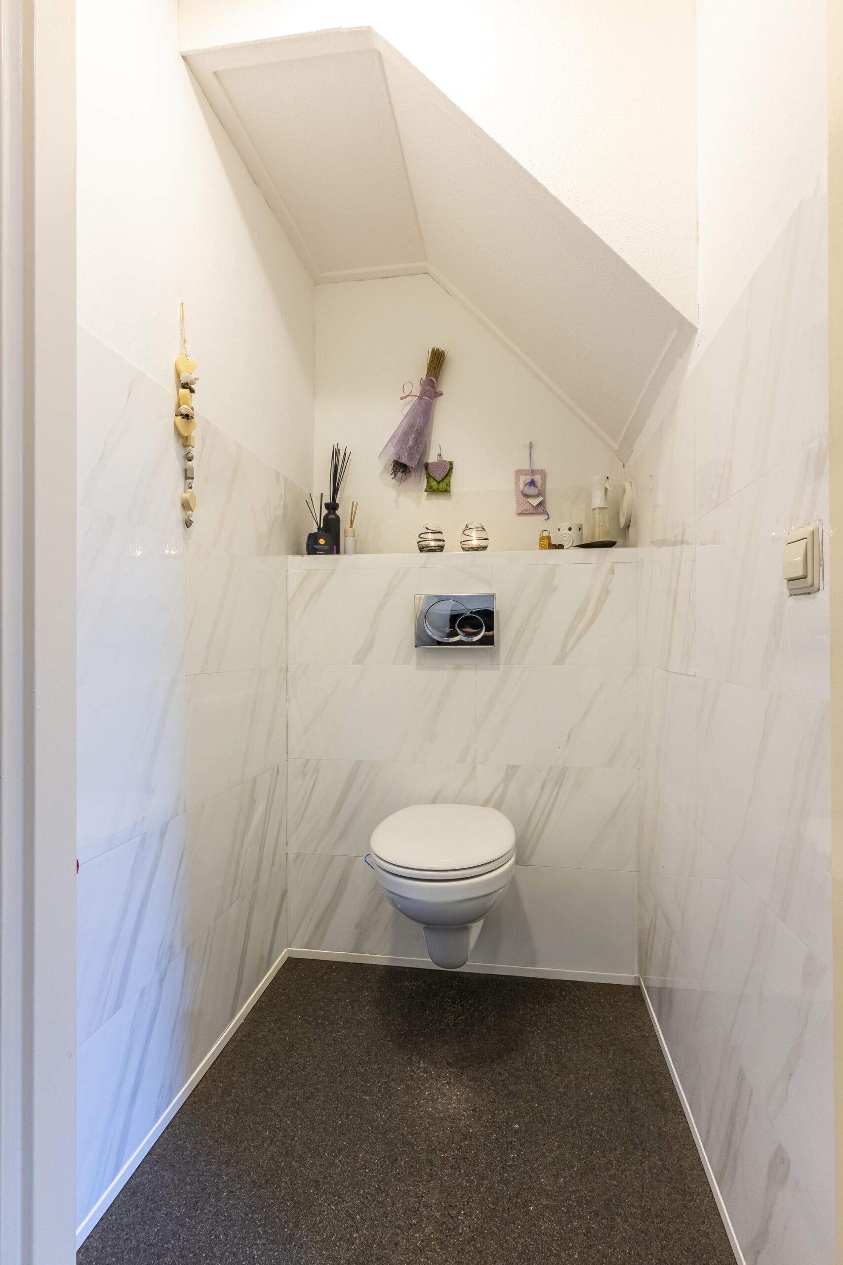 Via de ruime oprit en onderhoudsarme voortuin bereikt u de overdekte entree. De hal beschikt over een garderobenis, trap naar de verdieping en een luxe vrijhangend toilet.