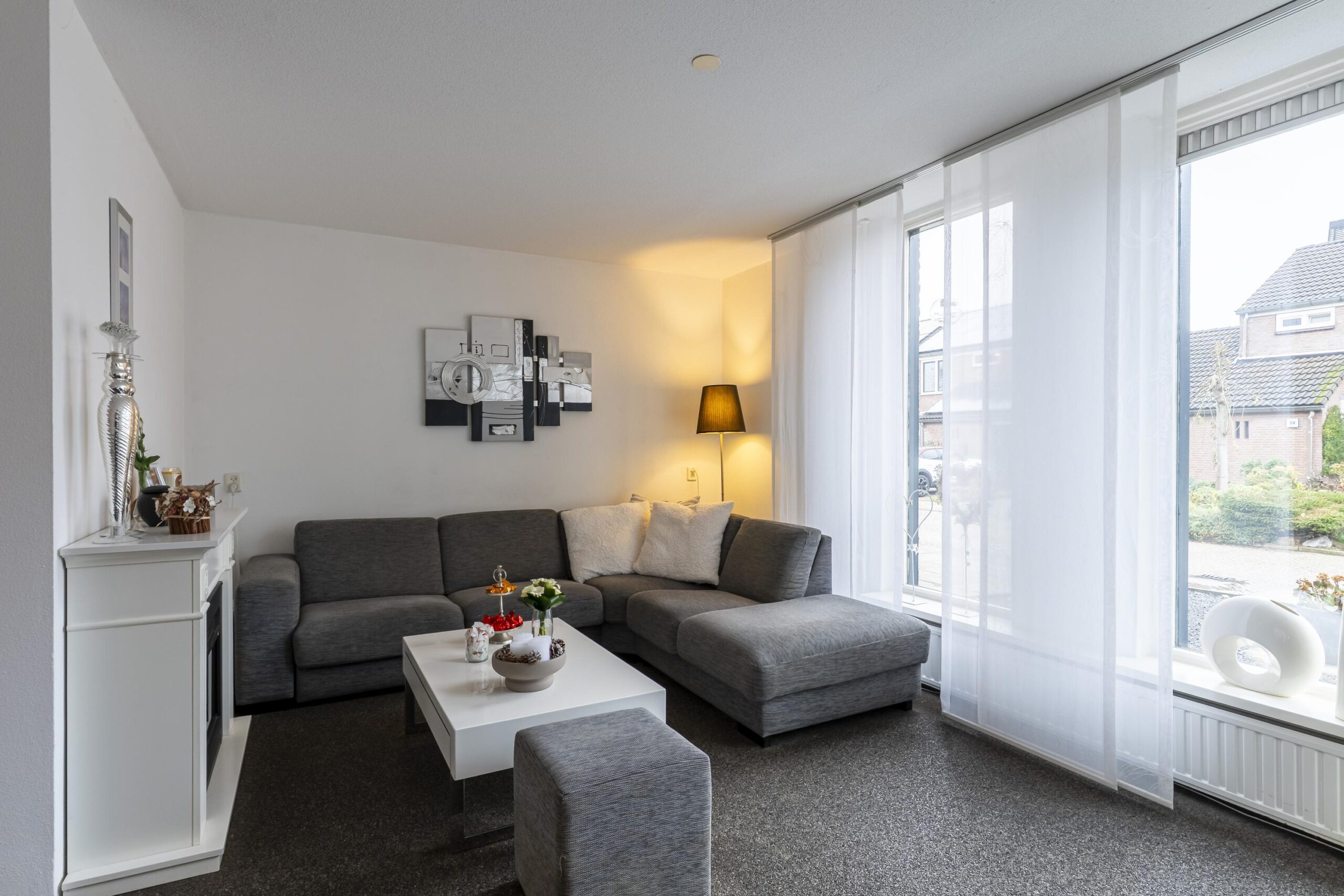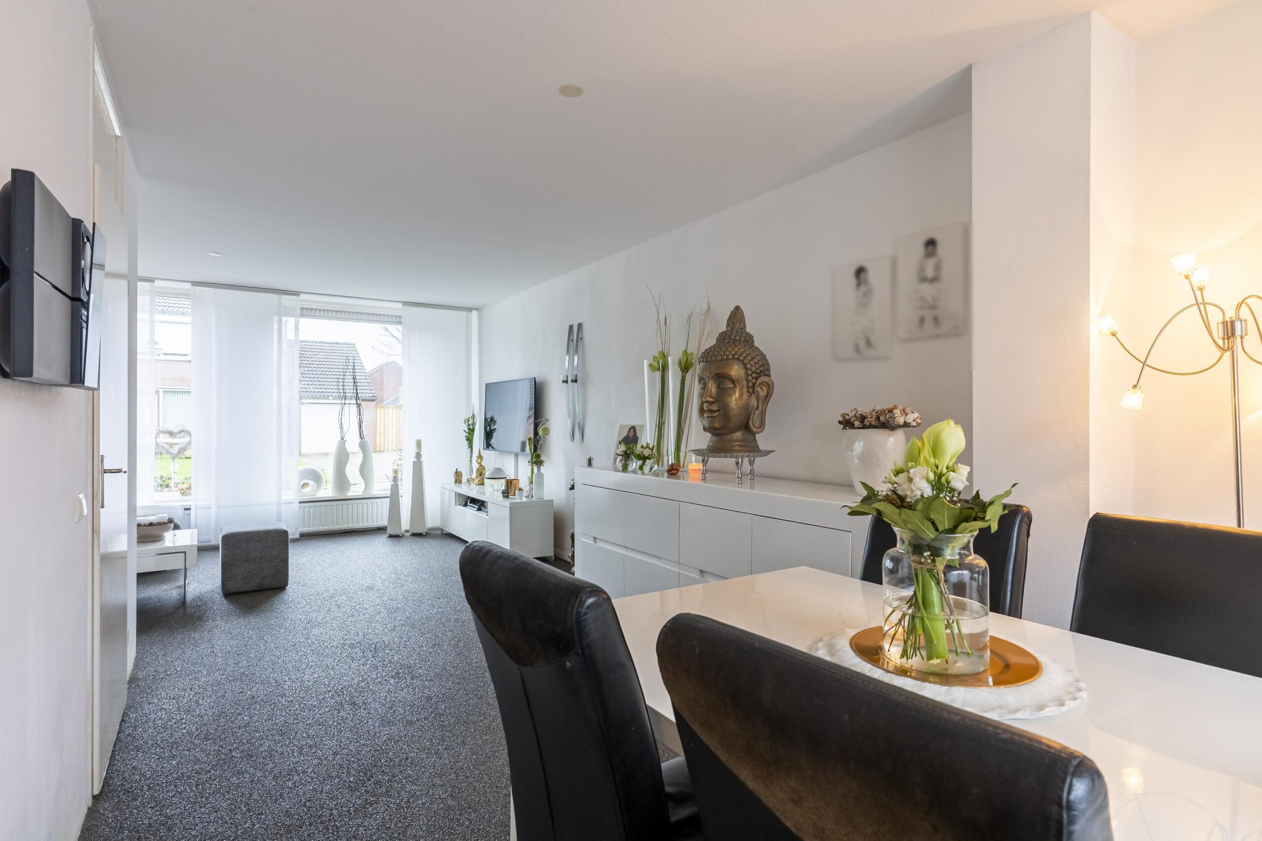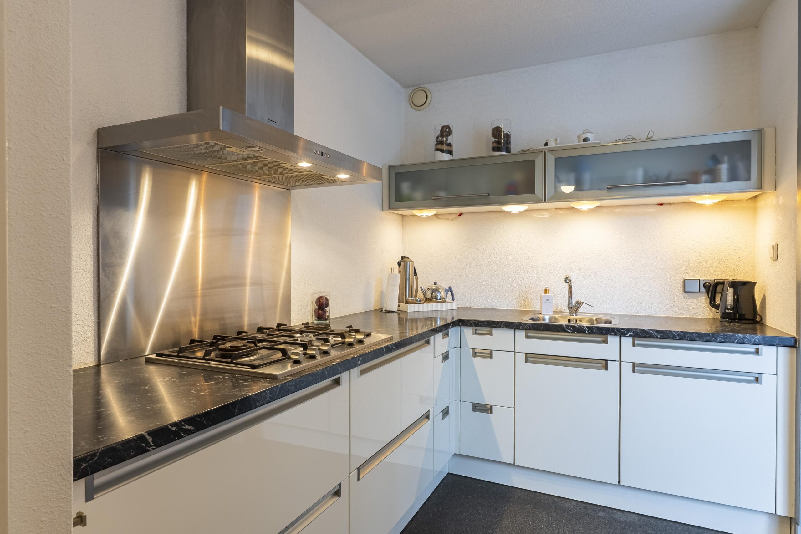 De L-vormige living biedt een uitstekende lichtinval en sluit mooi aan op de open witte hoogglans keukeninstallatie in hoekopstelling. De keuken is voorzien van een 5-pits gaskookplaat, rvs-afzuigkap, vaatwasser, koelkast en combimagnetron.
